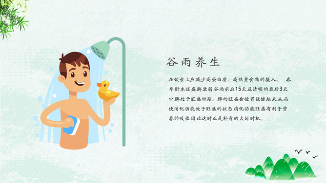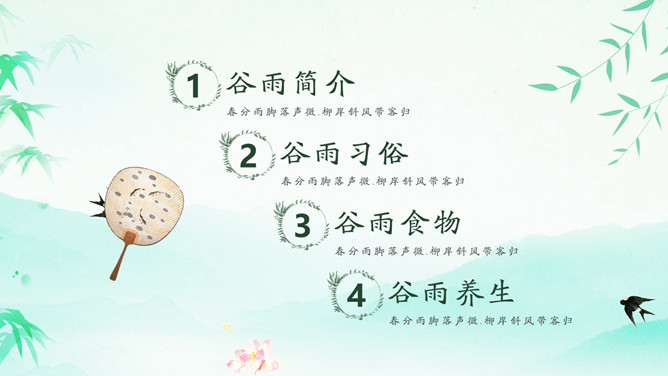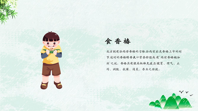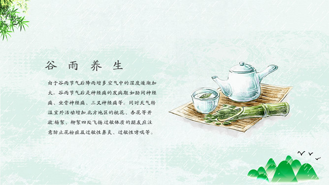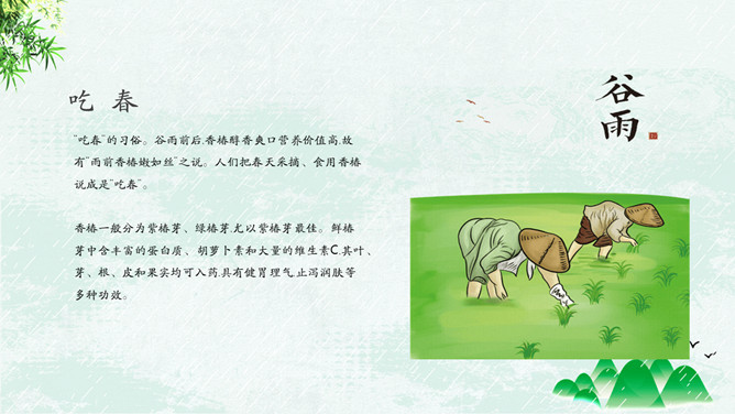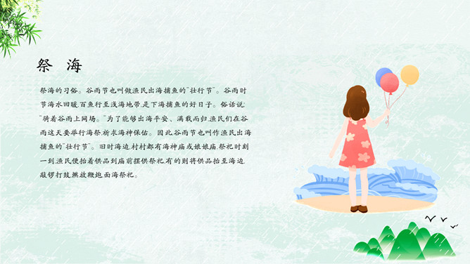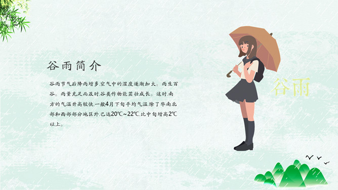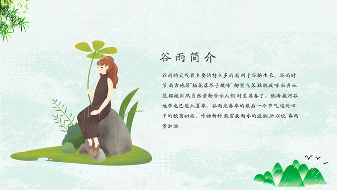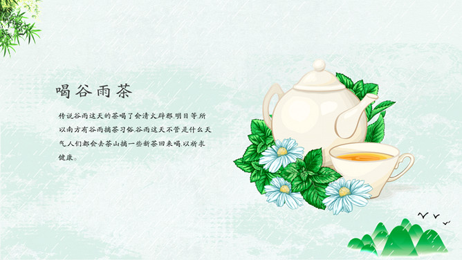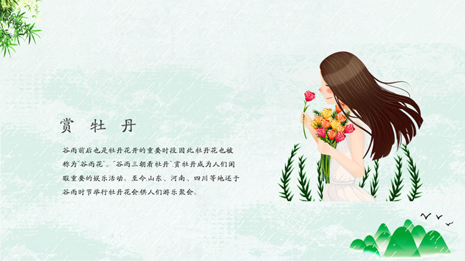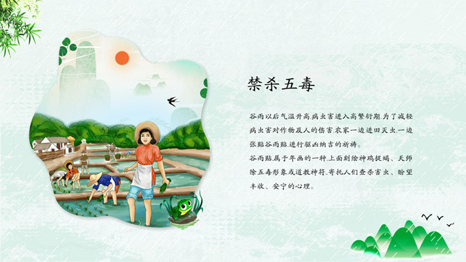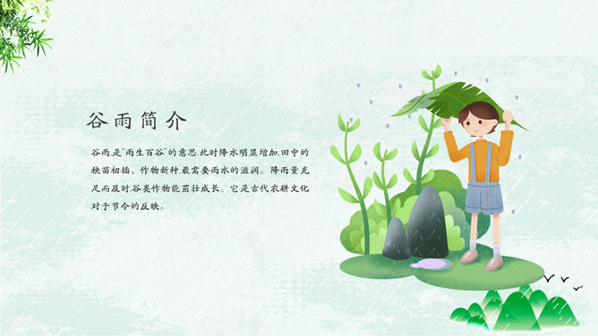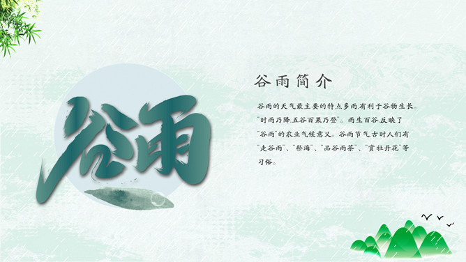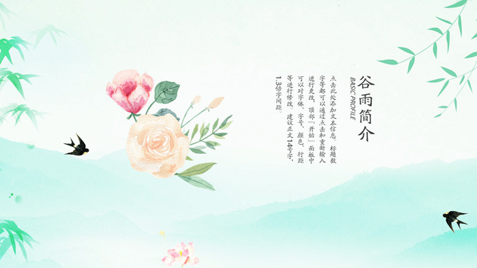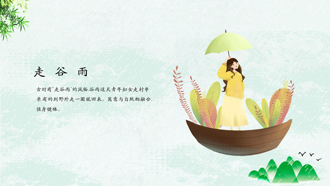 竹子燕子谷雨节气PPT模板。古时有“走谷雨”的风俗,谷雨这天青年妇女走村串亲,有的到野外走一圈就回来。寓意与自然相融合,强身健体。