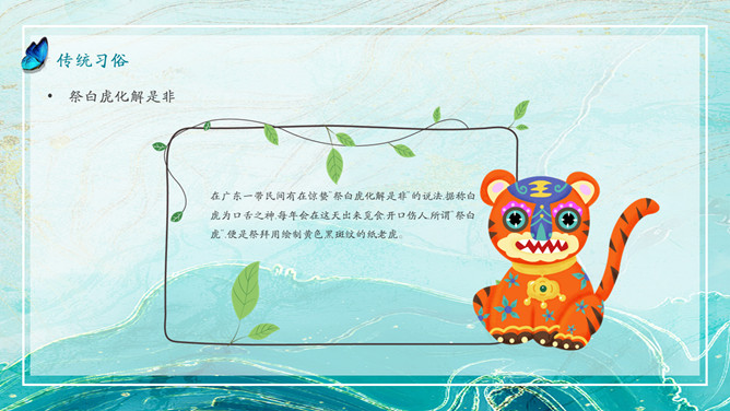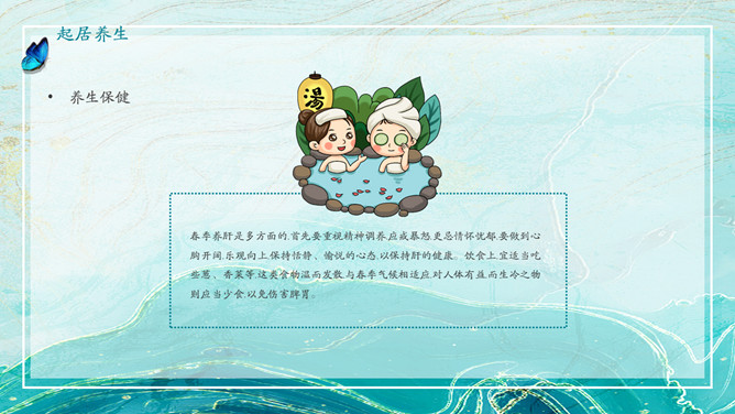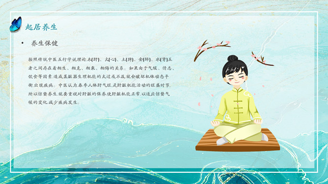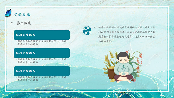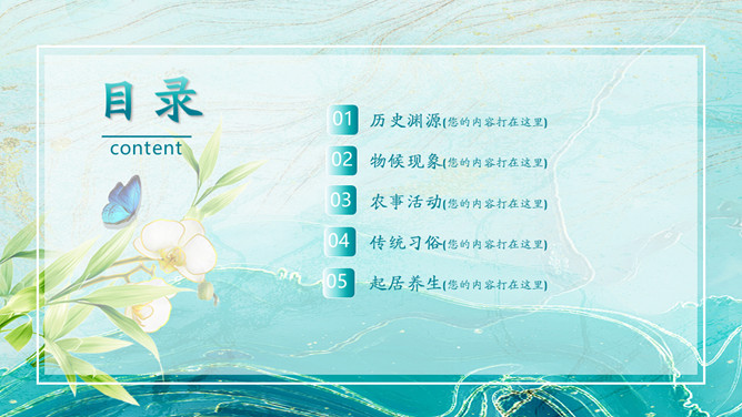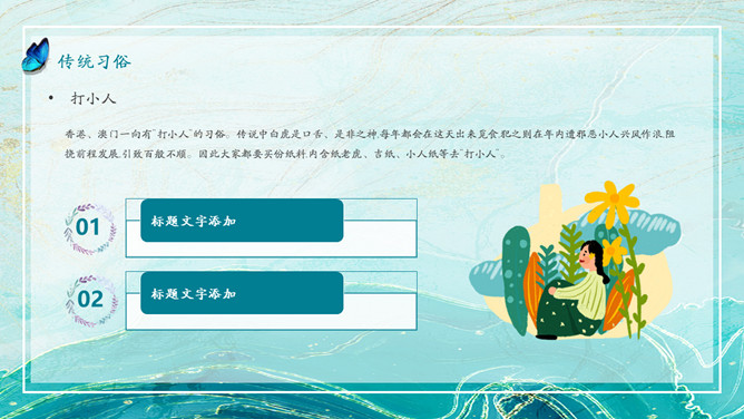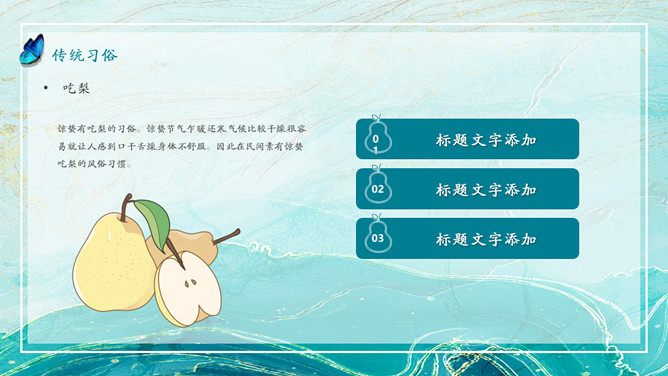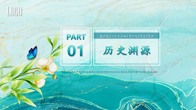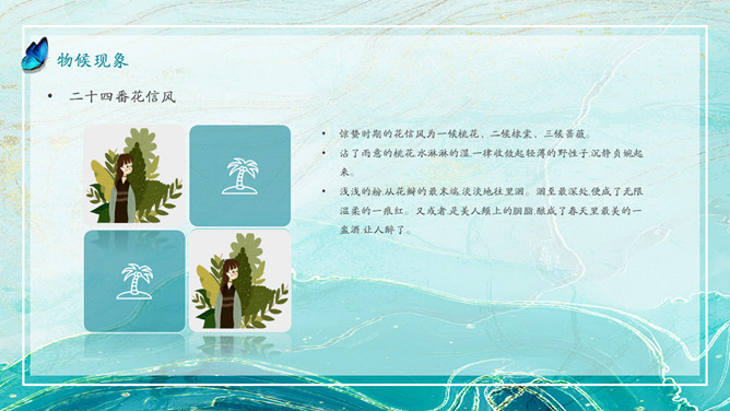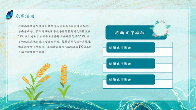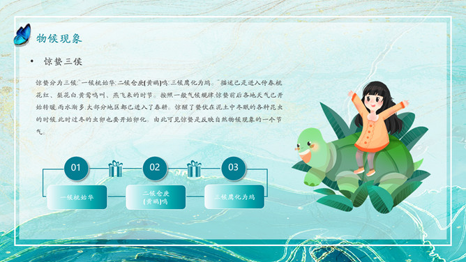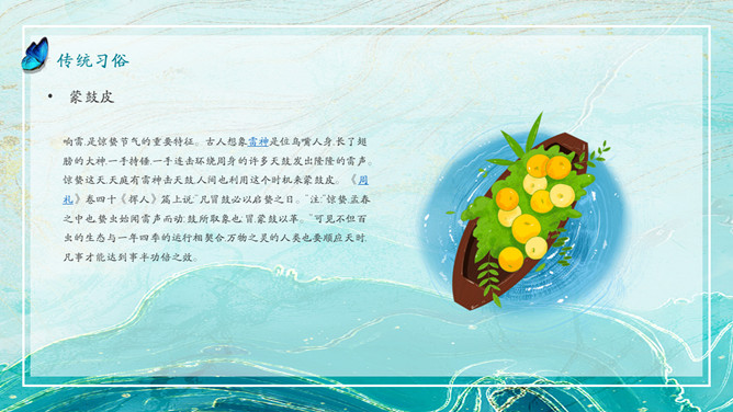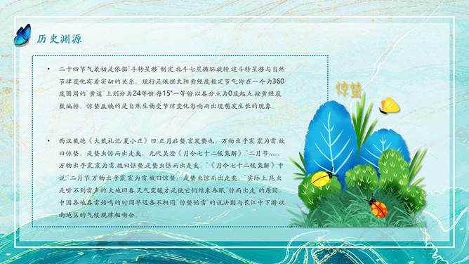 花朵蝴蝶惊蛰节气PPT模板。农谚“到了惊蛰节,锄头不停歇。”到了惊蛰,“九九”已尽,“九尽桃花开,春耕不能歇”。中国大部地区进入春耕大忙时节。惊蛰是全年气温回升最快的节气。日照时数也有比较明显的增加。但是因为冷暖空气交替,天气不稳定,气温波动甚大。