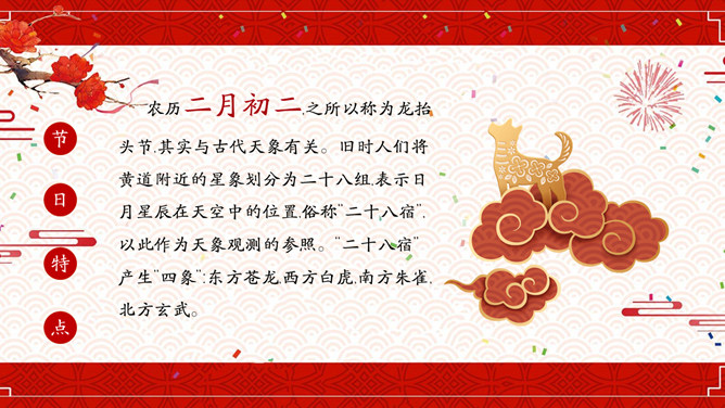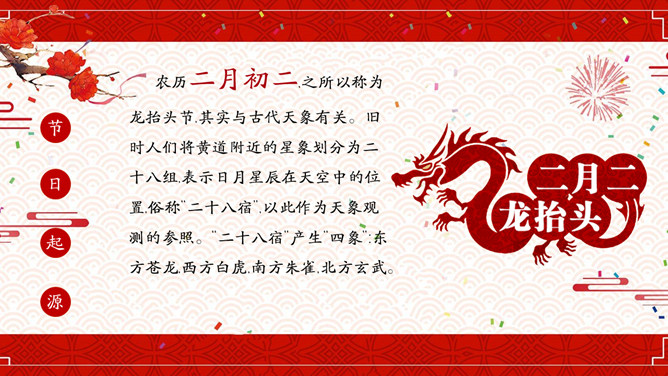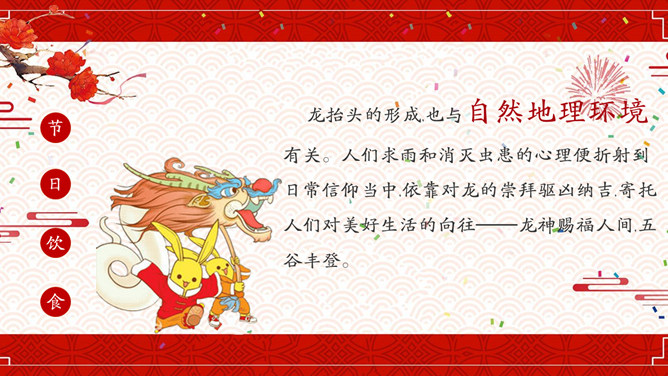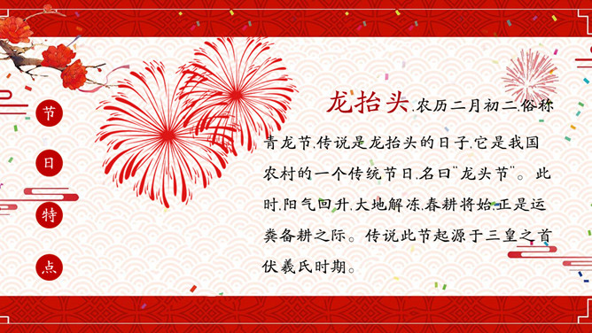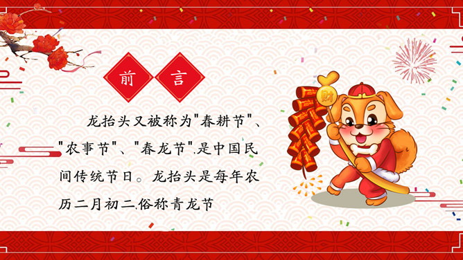 喜庆龙抬头介绍PPT模板。龙抬头又被称为"春耕节"、"农事节"、"春龙节",是中国民间传统节日。龙抬头是每年农历二月初二,俗称青龙节。