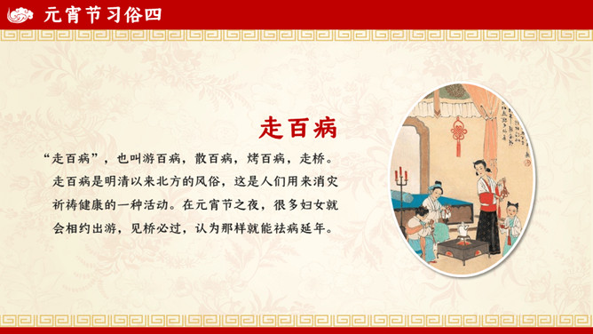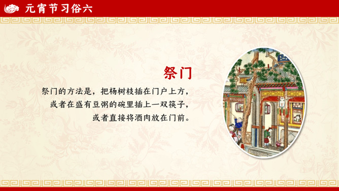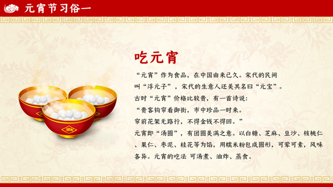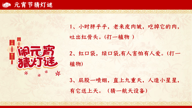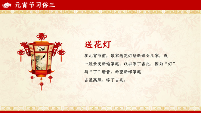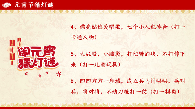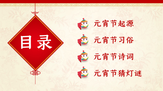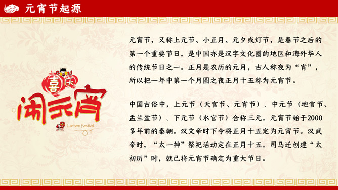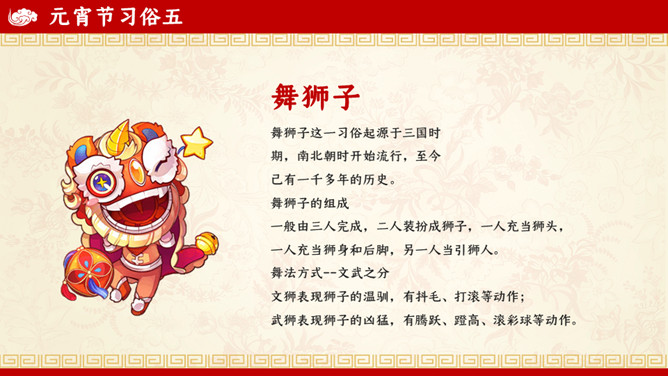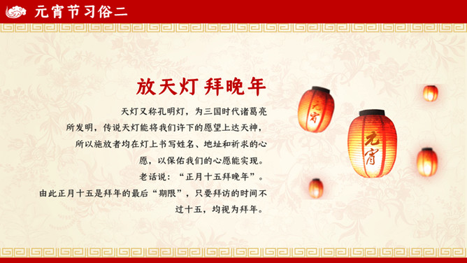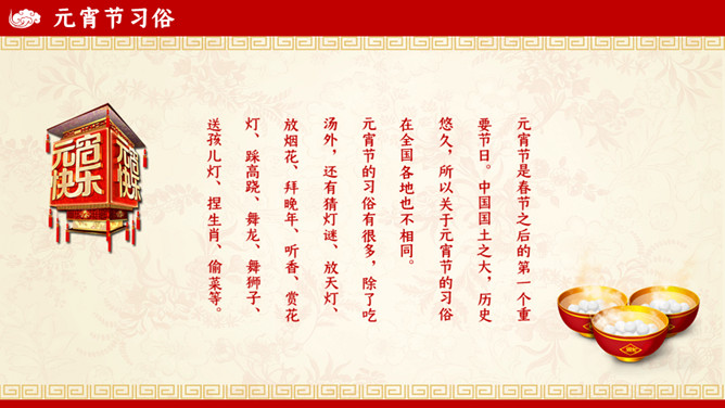 元宵节习俗介绍PPT模板。元宵节是春节之后的第一个重要节日。中国国土之大,历史悠久,所以关于元宵节的习俗在全国各地也不相同。