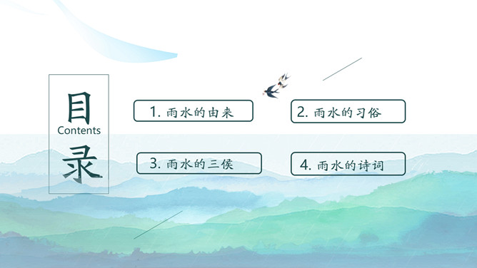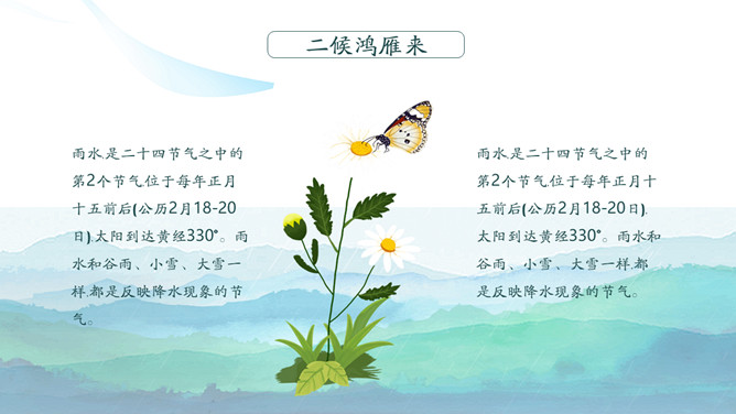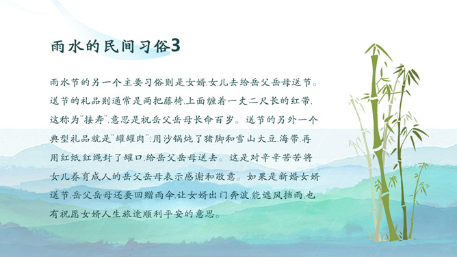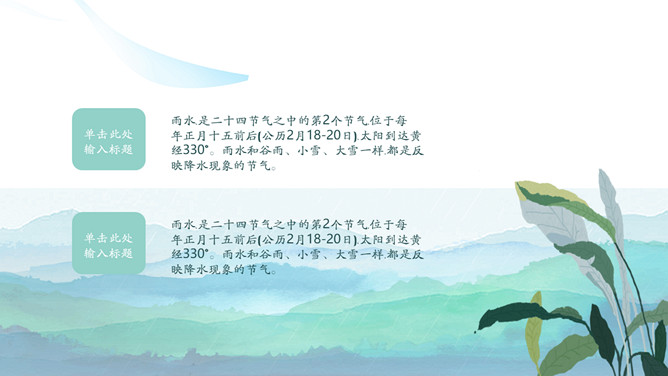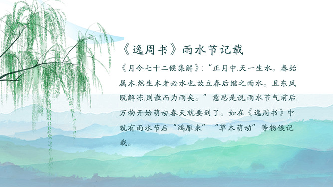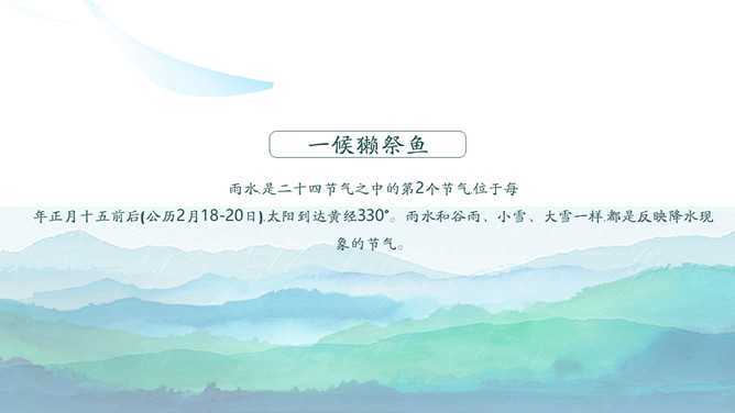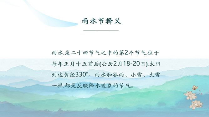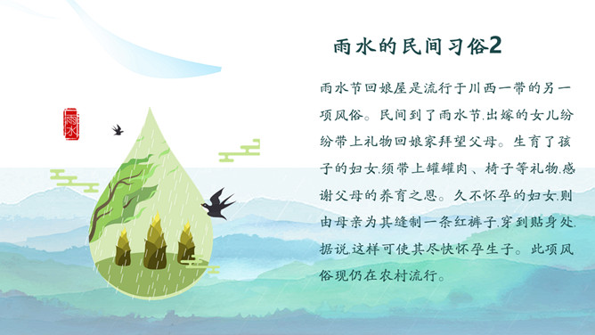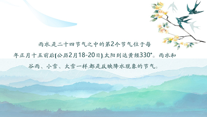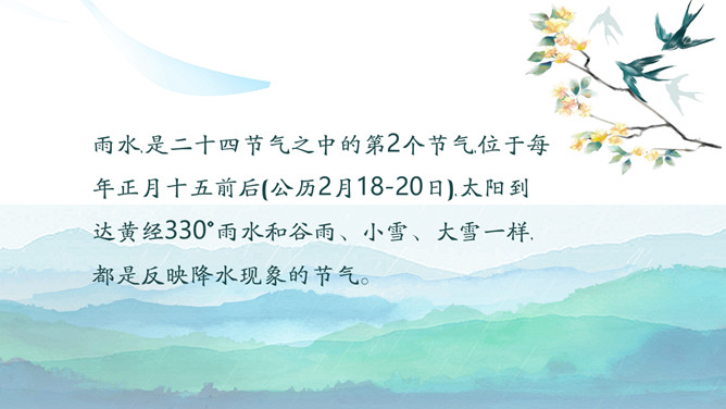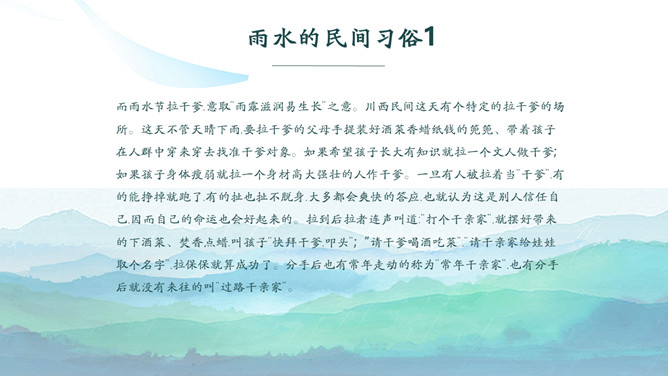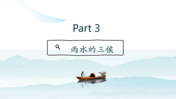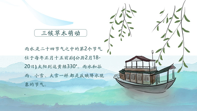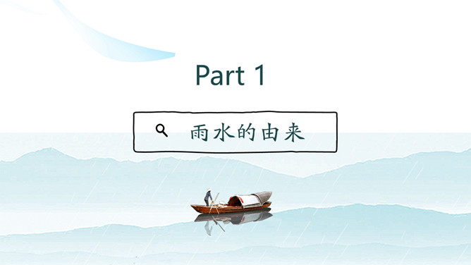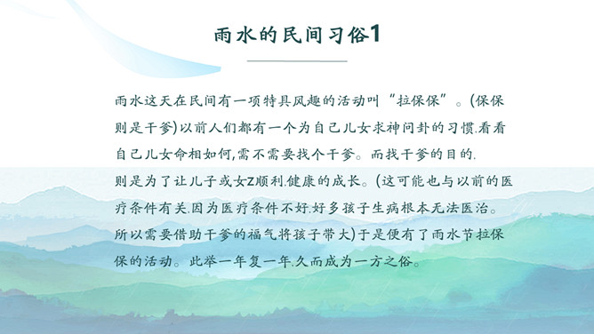 山水孤舟雨水节气PPT模板。雨水这天在民间有一项特具风趣的活动叫“拉保保”。(保保则是干爹)以前人们都有一个为自己儿女求神问卦的习惯,看看自己儿女命相如何,需不需要找个干爹。而找干爹的目的,则是为了让儿子或女z顺利,健康的成长。