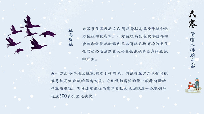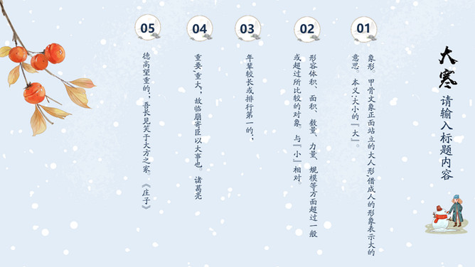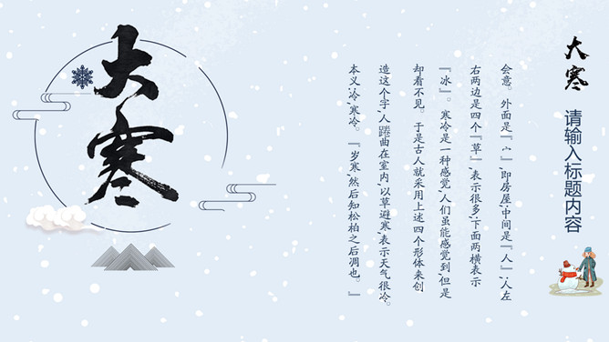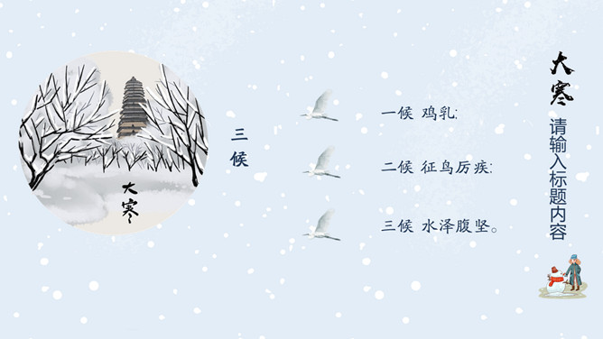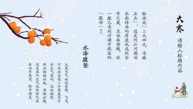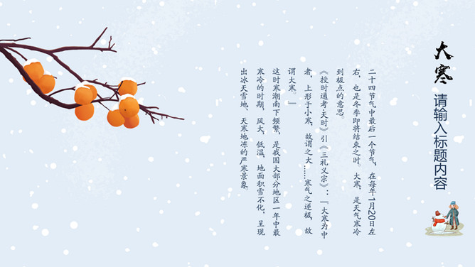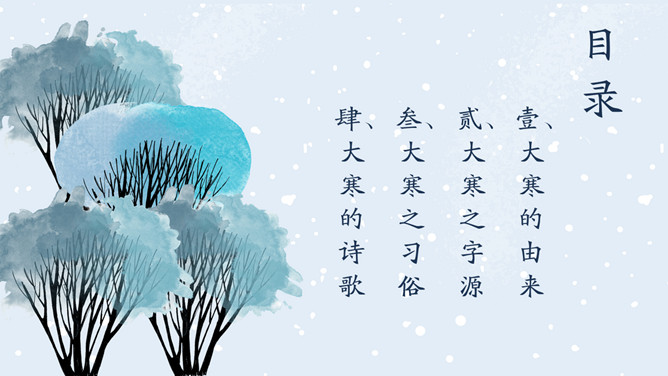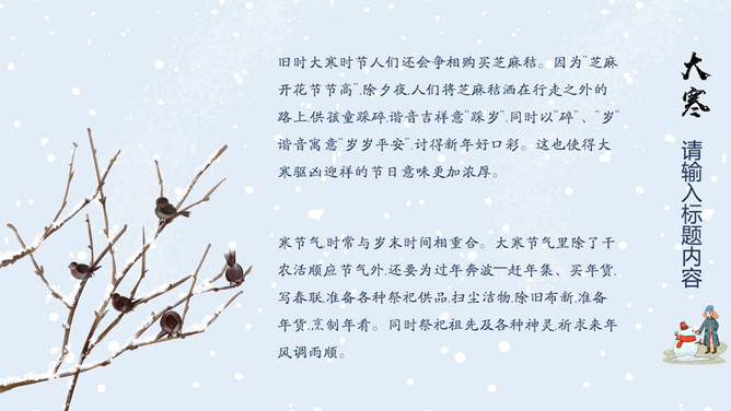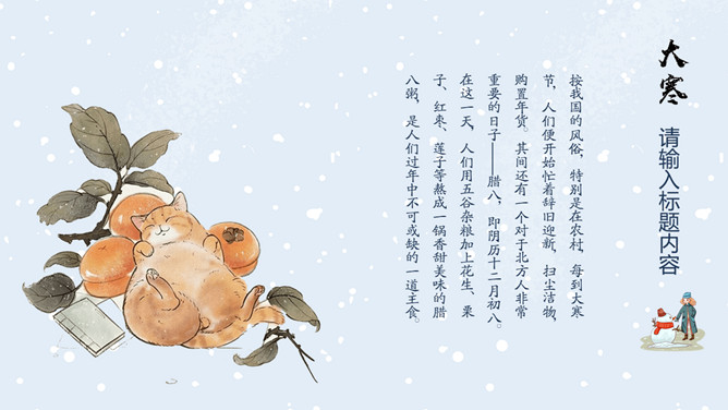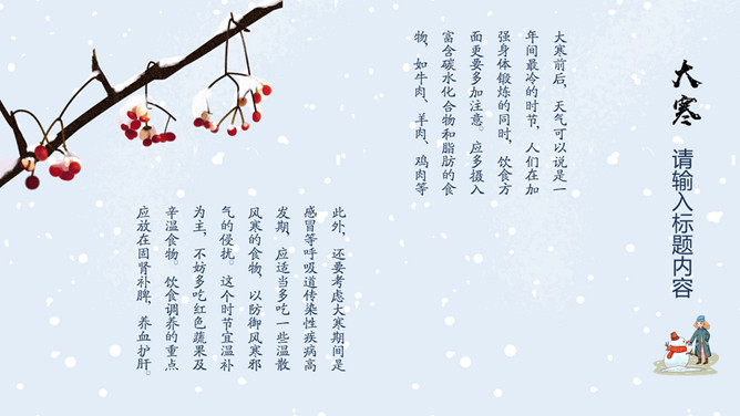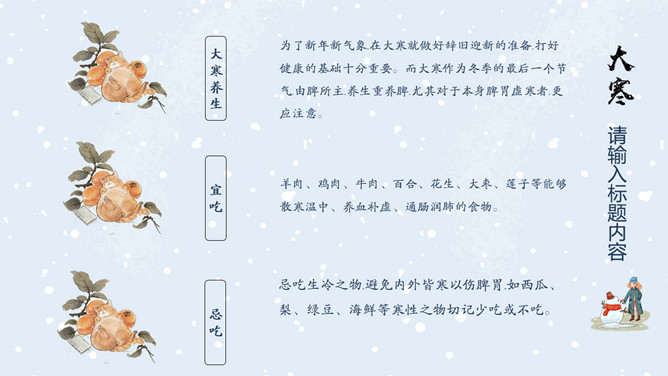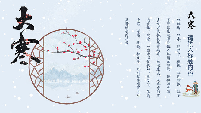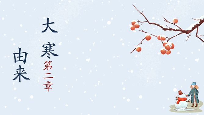 大树大寒节气主题PPT模板。按我国的风俗,特别是在农村,每到大寒节,人们便开始忙着辞旧迎新,扫尘洁物,购置年货。其间还有一个对于北方人非常重要的日子——腊八,即阴历十二月初八。在这一天,人们用五谷杂粮加上花生、栗子、红枣、莲子等熬成一锅香甜美味的腊八粥,是人们过年中不可或缺的一道主食。