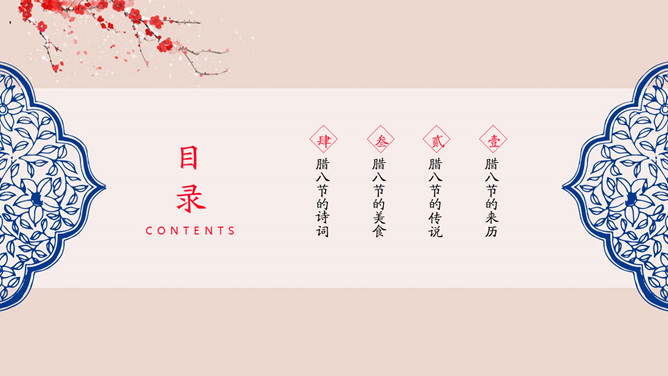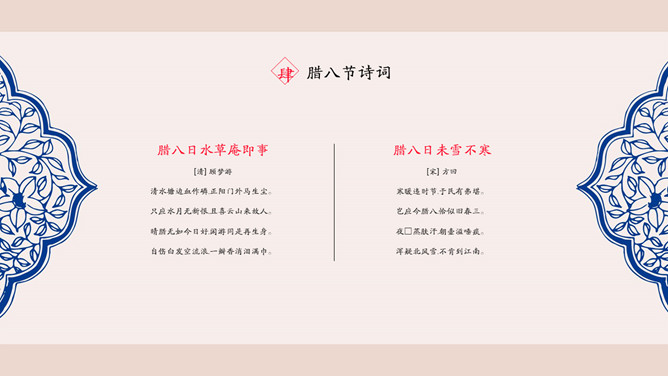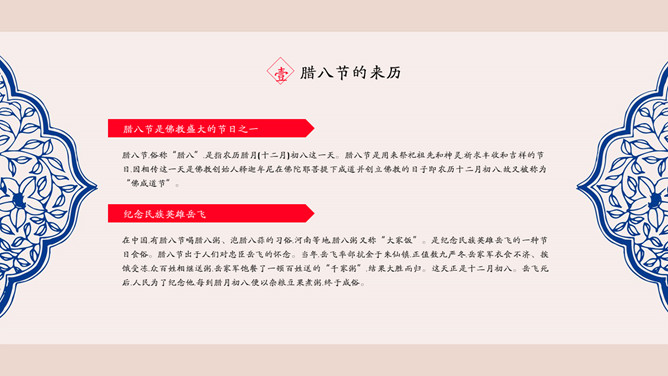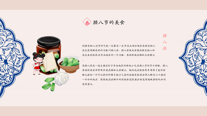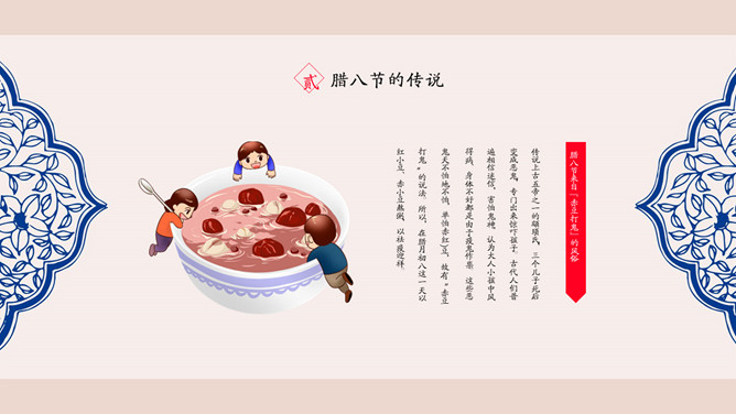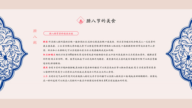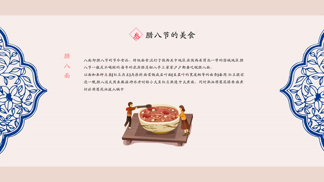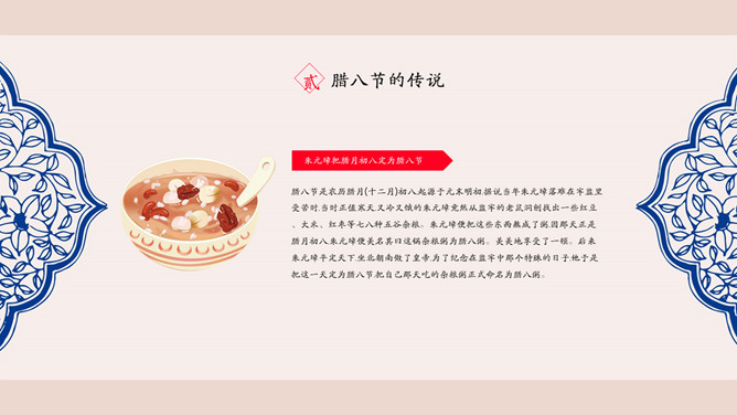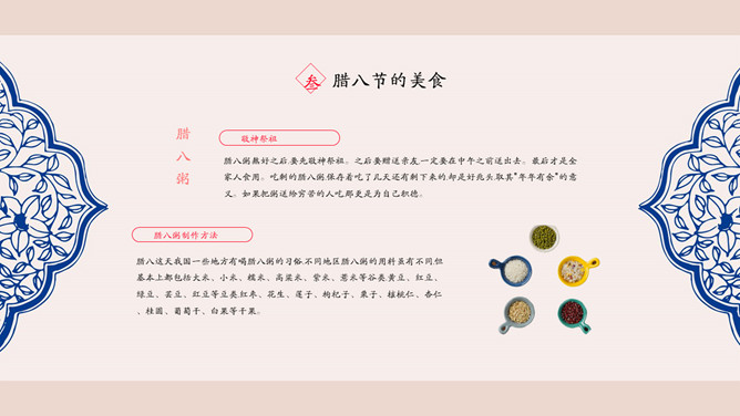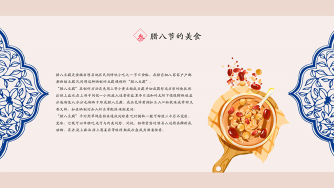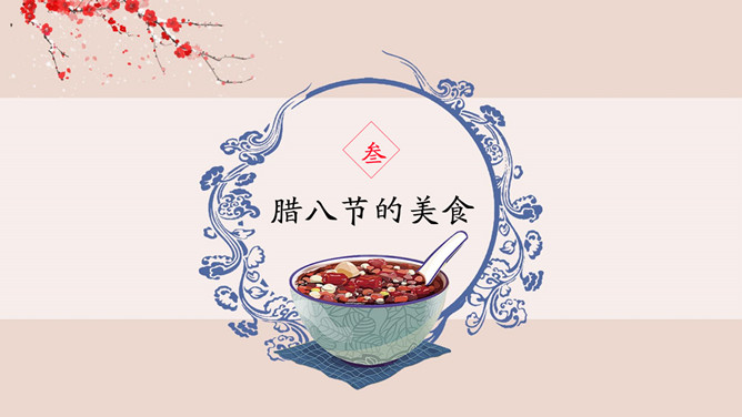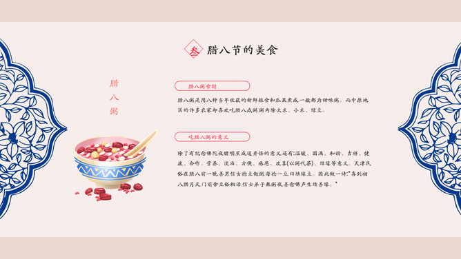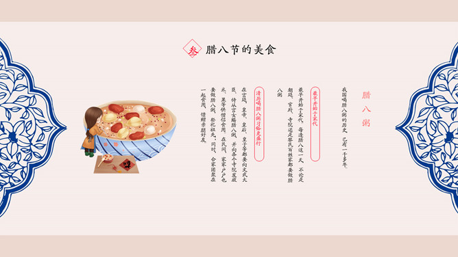 腊八粥腊八节介绍PPT模板。腊八这天我国一些地方有喝腊八粥的习俗,不同地区腊八粥的用料虽有不同,但基本上都包括大米、小米、糯米、高粱米、紫米、薏米等谷类,黄豆、红豆、绿豆、芸豆、豇豆等豆类,红枣、花生、莲子、枸杞子、栗子、核桃仁、杏仁、桂圆、葡萄干、白果等干果。