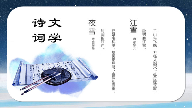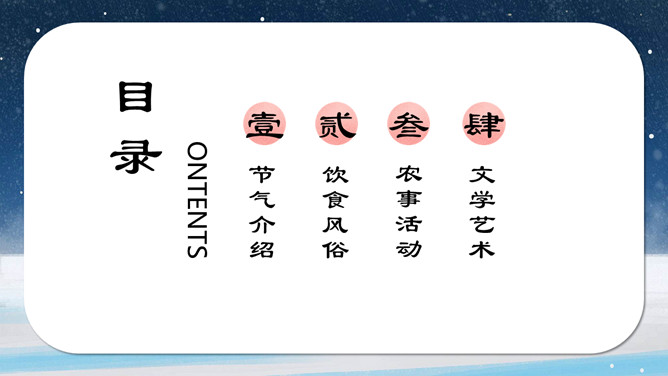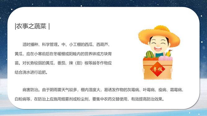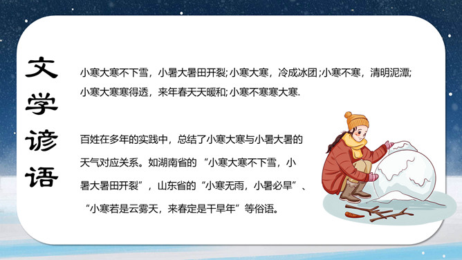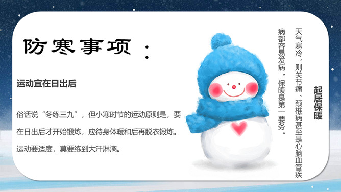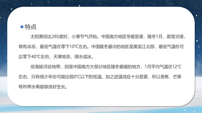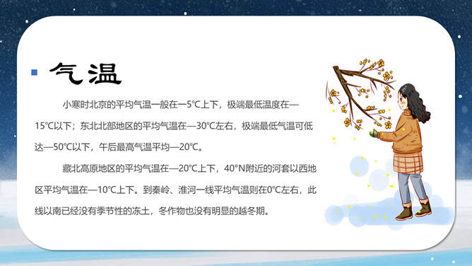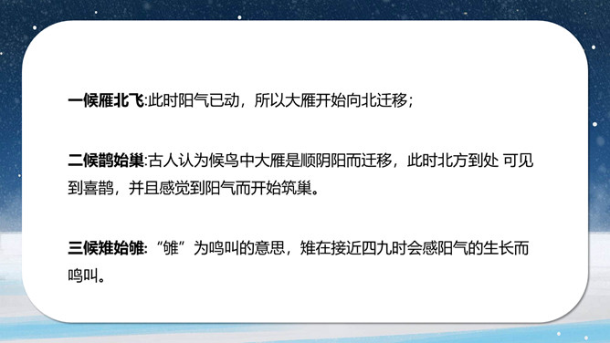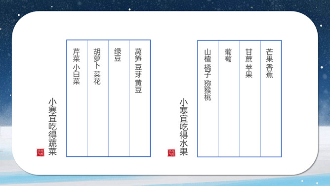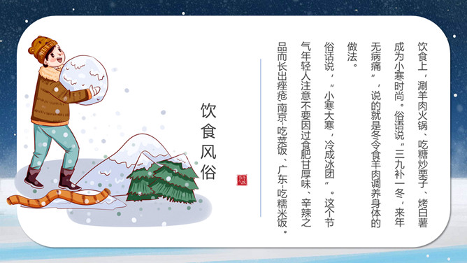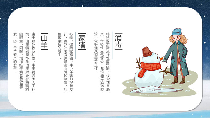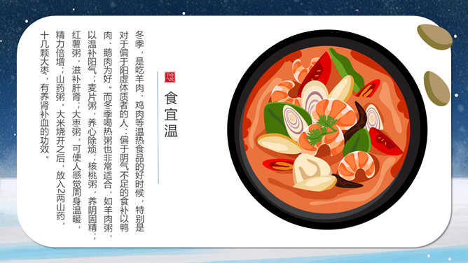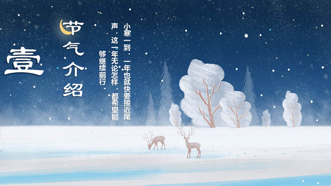 雪夜小鹿小寒节气PPT模板。冬季,是吃羊肉、鸡肉等温热食品的好时候,特别是对于偏于阳虚体质者的人:偏于阴气不足的食补以鸭肉、鹅肉为好。