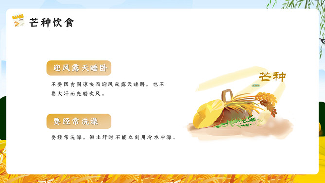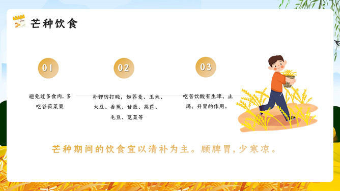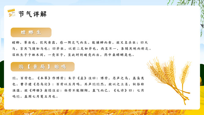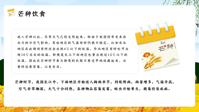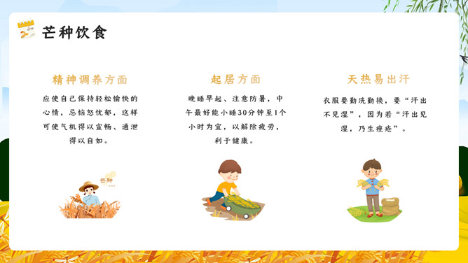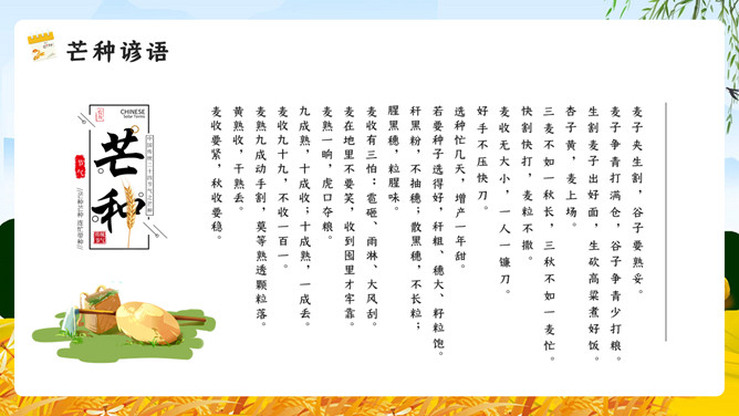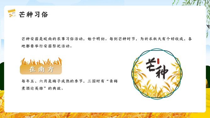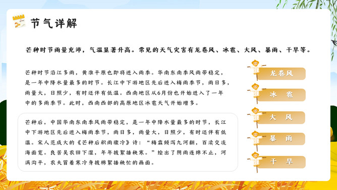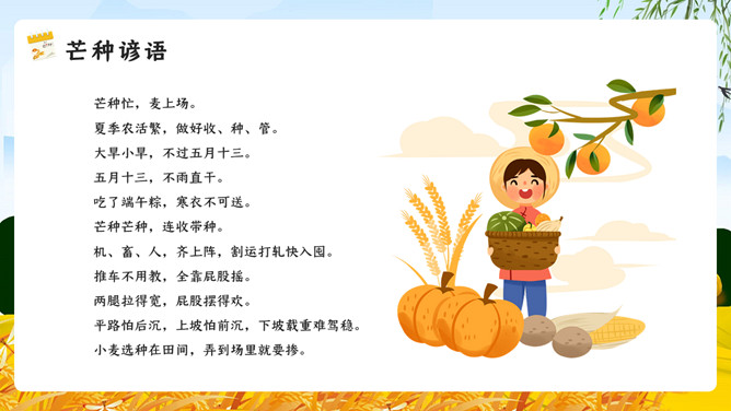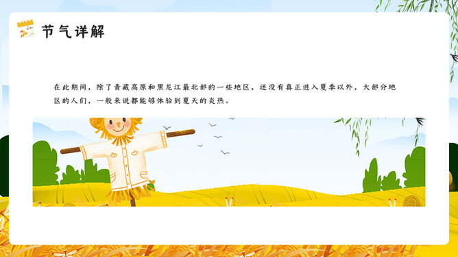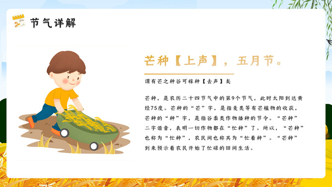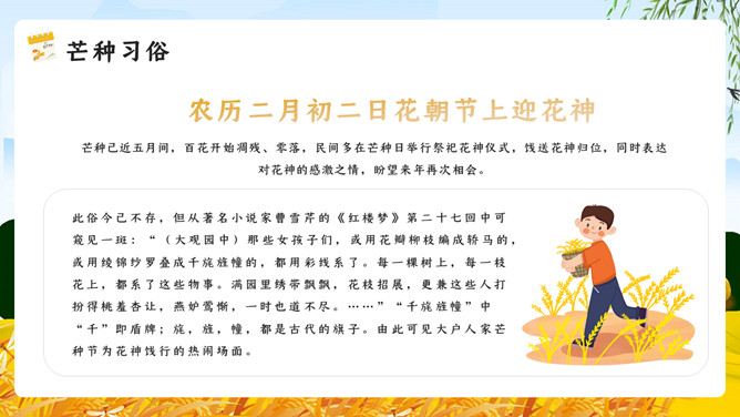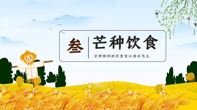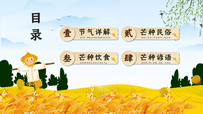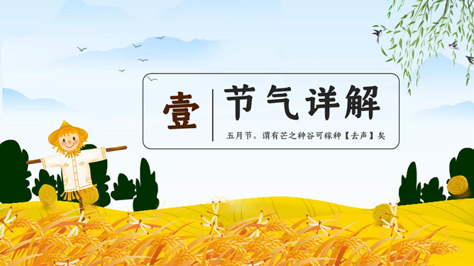 麦田稻草人芒种节气PPT模板。芒种已近五月间,百花开始凋残、零落,民间多在芒种日举行祭祀花神仪式,饯送花神归位,同时表达对花神的感激之情,盼望来年再次相会。芒种已近五月间,百花开始凋残、零落,民间多在芒种日举行祭祀花神仪式,饯送花神归位,同时表达对花神的感激之情,盼望来年再次相会。