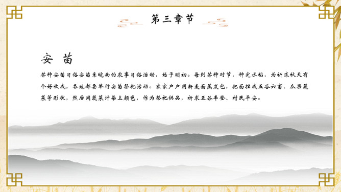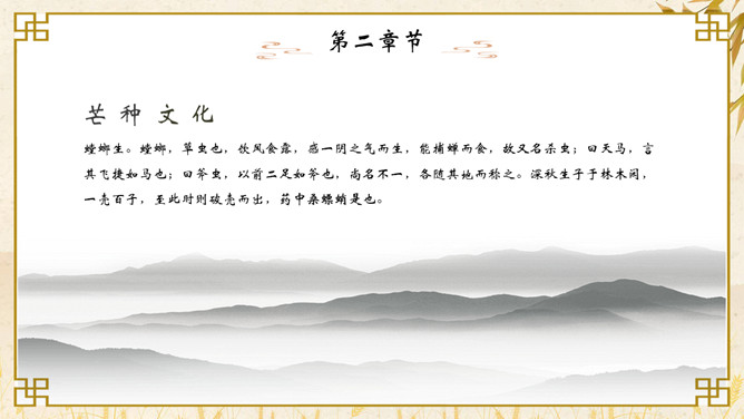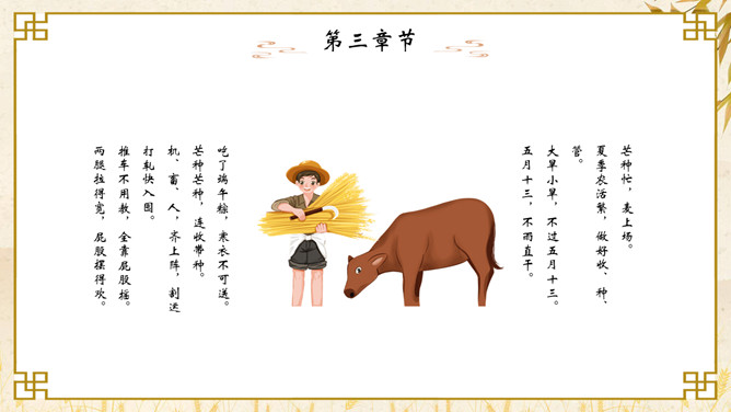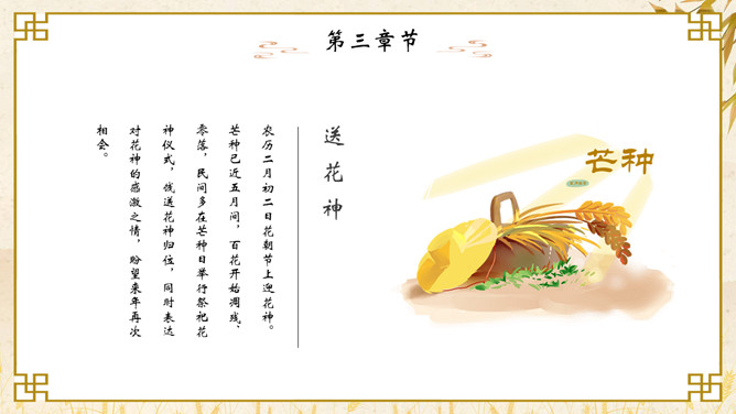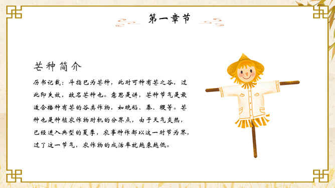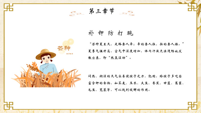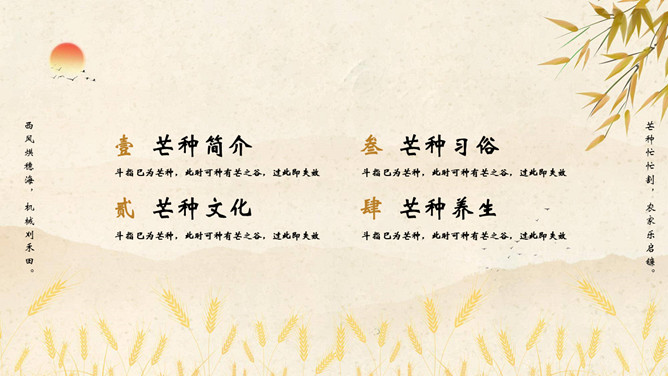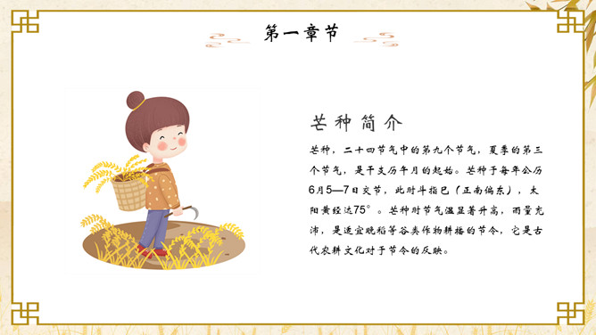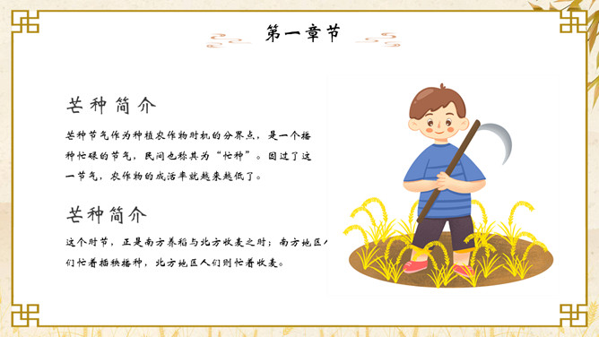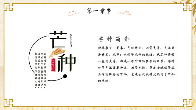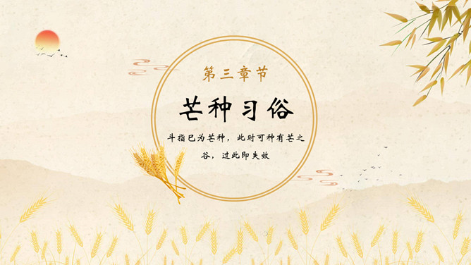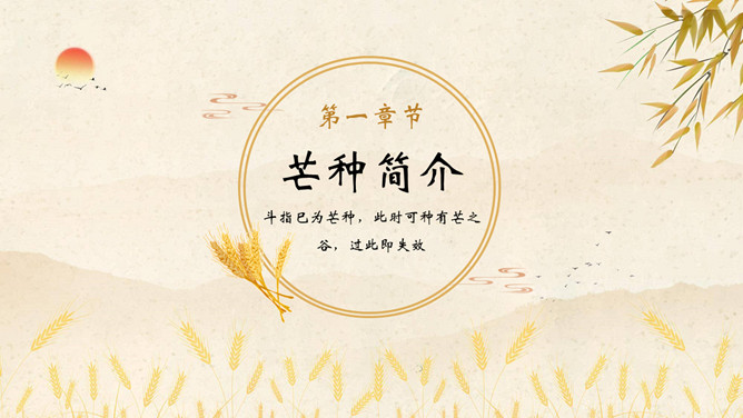 麦穗芒种节气介绍PPT模板。芒种节气作为种植农作物时机的分界点,是一个播种忙碌的节气,民间也称其为“忙种”。因过了这一节气,农作物的成活率就越来越低了。