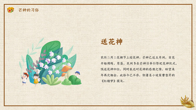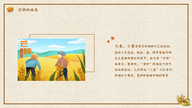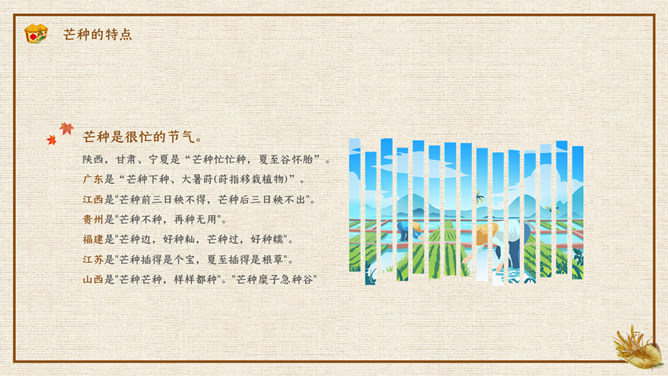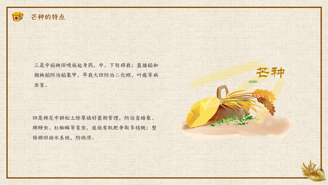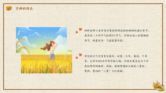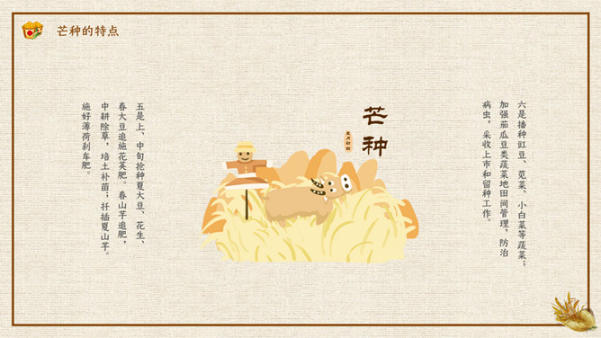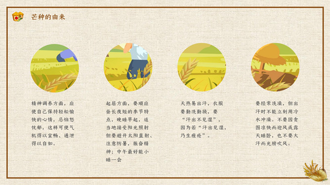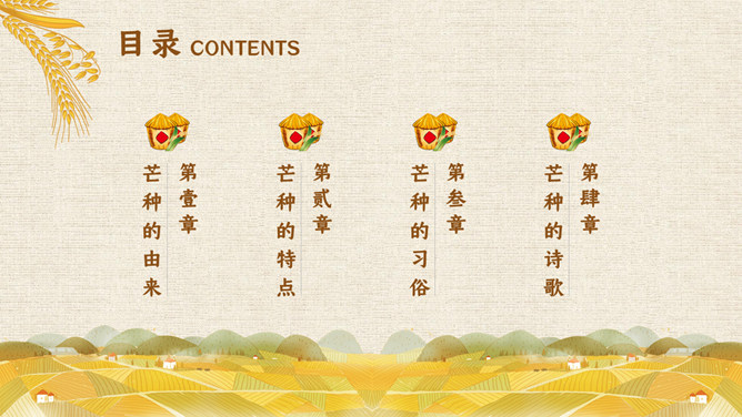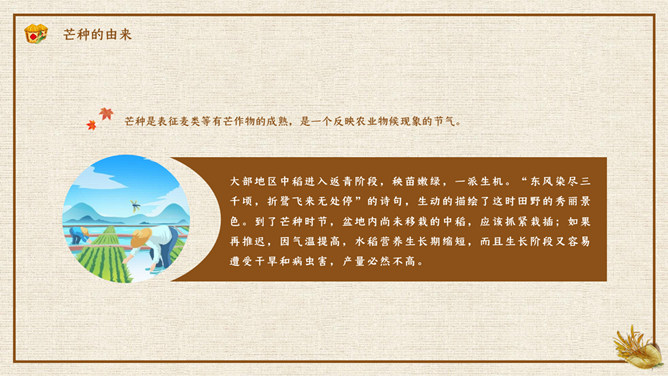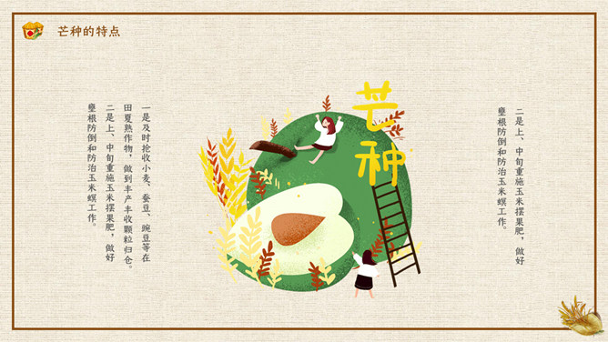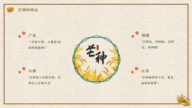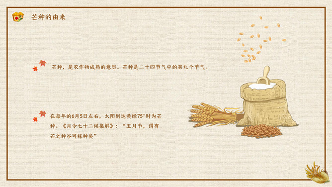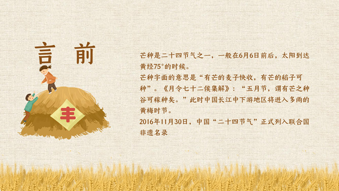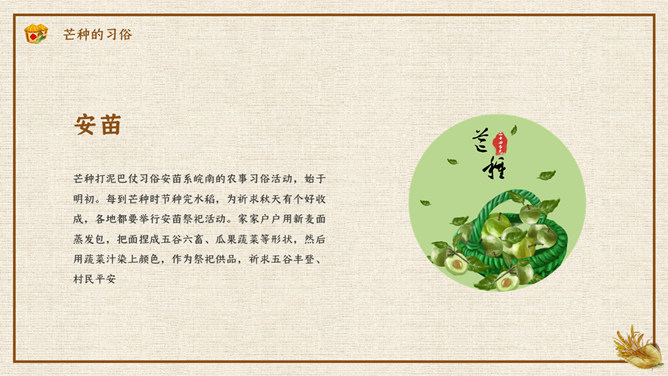 木碗麦粒芒种节气PPT模板。在南方,每年五、六月是梅子成熟的季节,三国时有“青梅煮酒论英雄”的典故青梅含有多种天然优质有机酸和丰富的矿物质,具有净血、整肠、降血脂、消除疲劳、美容、调节酸碱平衡,增强人体免疫力等独特营养保健功能。但是,新鲜梅子大多味道酸涩,难以直接入口,需加工后方可食用,这种加工过程便是煮梅。