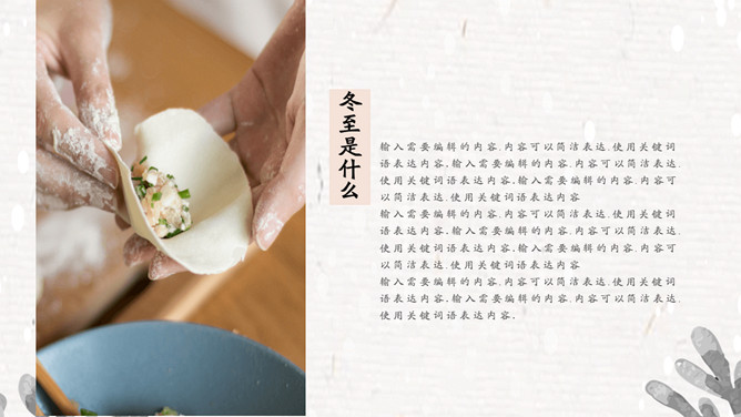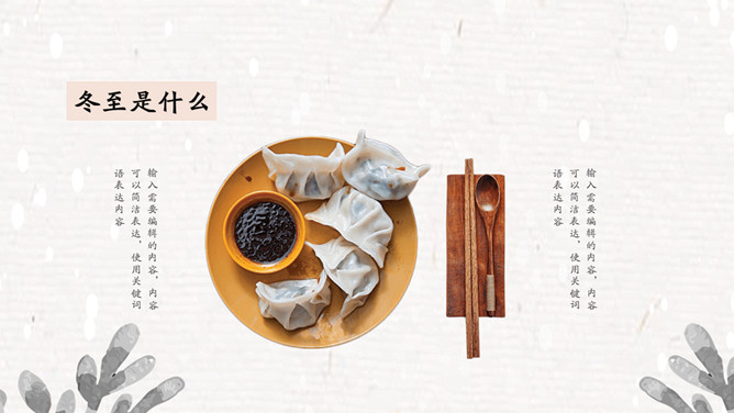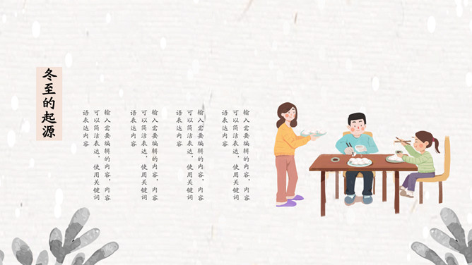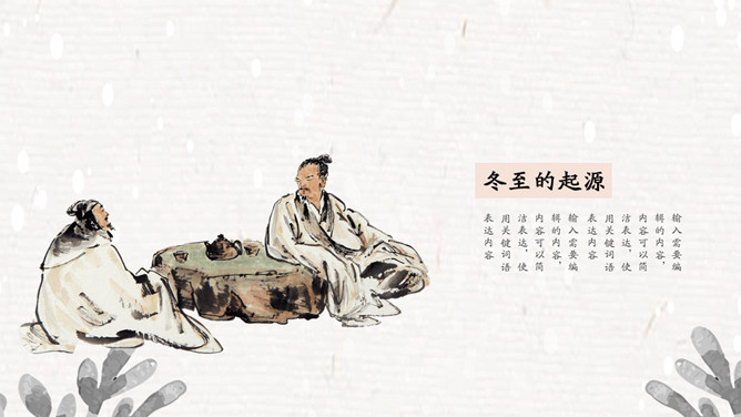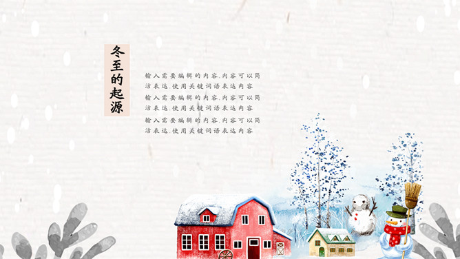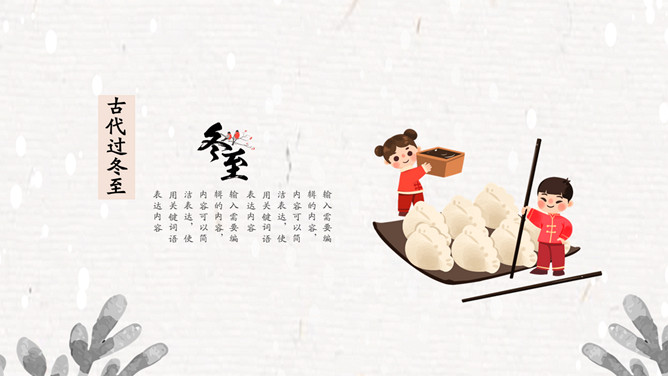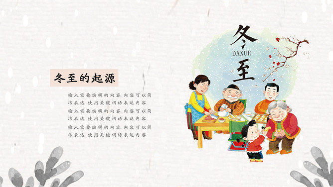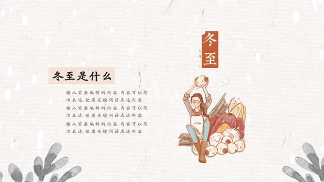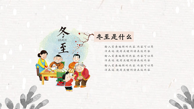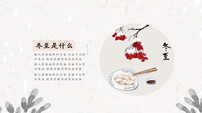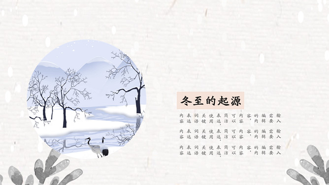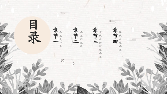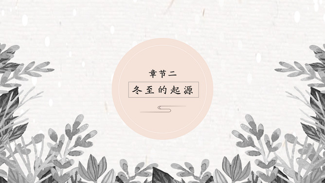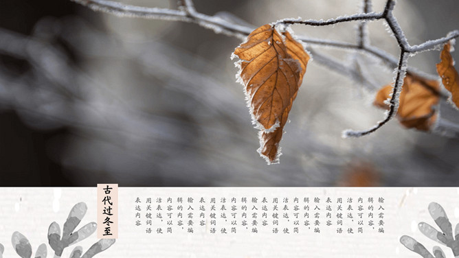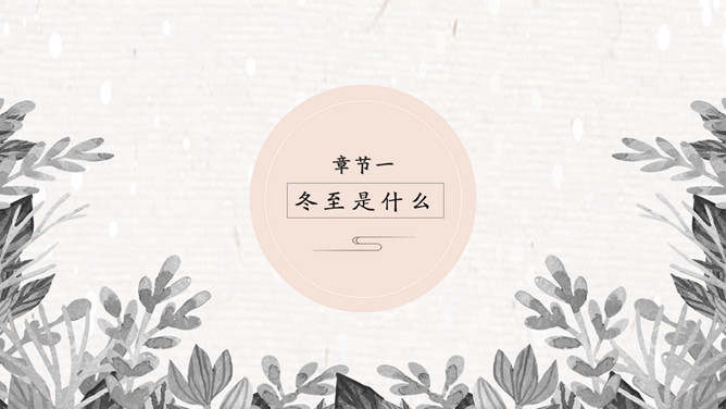 叶子冬至节气主题PPT模板。一套冬至主题模板,灰色水彩叶子装饰,落雪效果背景,动态播放。