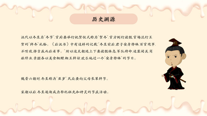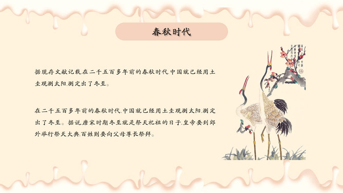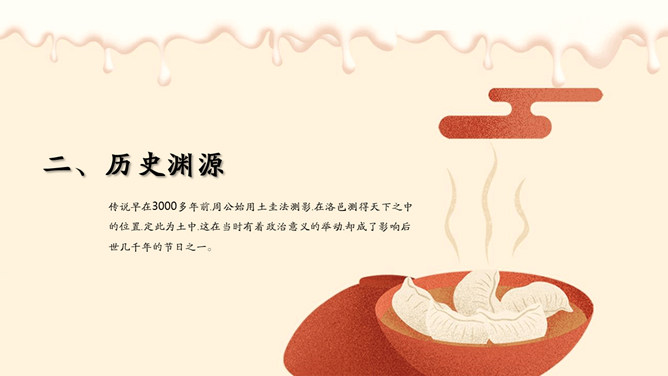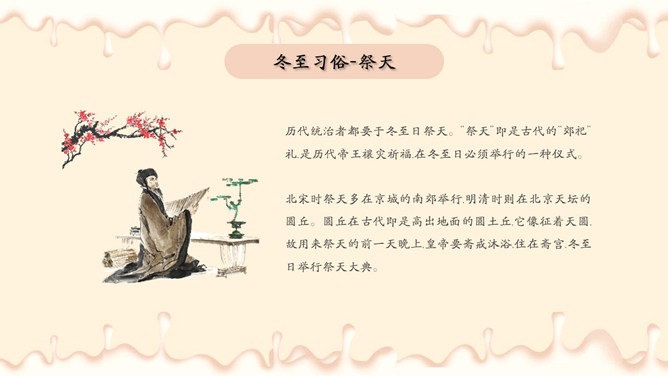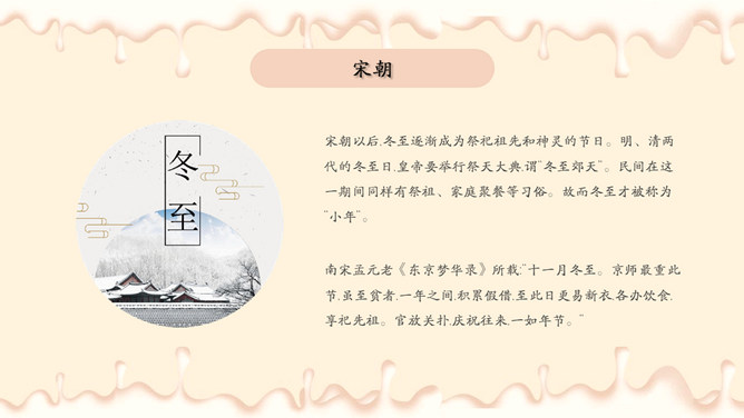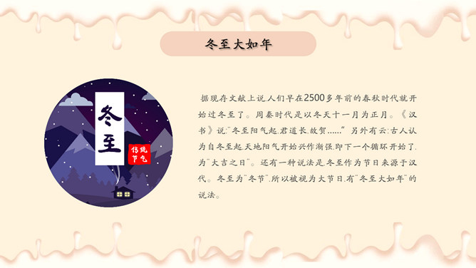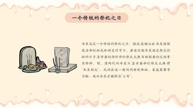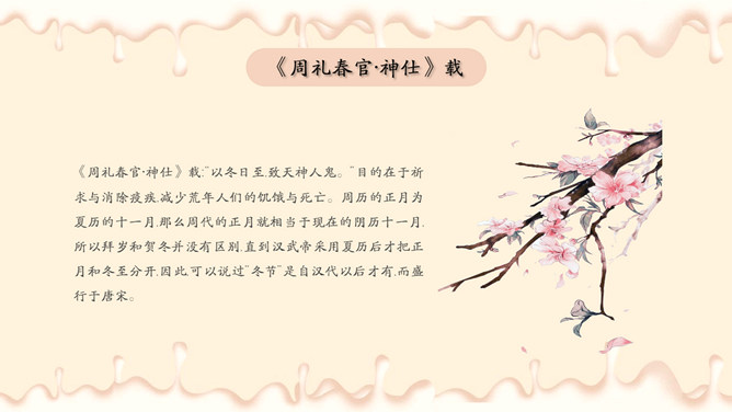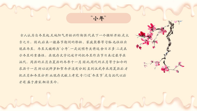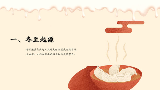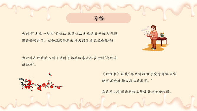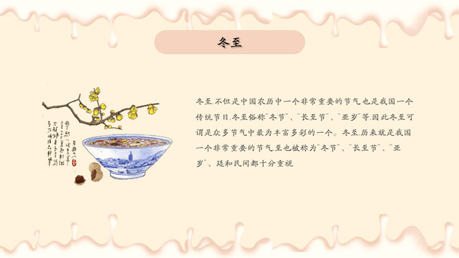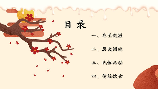 饺子梅花冬至节气PPT模板。潮汕地区汉族民谚云:“冬节大如年”、“冬节没返没祖宗”。意思是外出的人,到冬至这一天无论如何要赶回家敬拜祖宗,否则就是没有祖家观念。海峡两岸的同胞,都很看重冬至,把冬至当作团圆节。