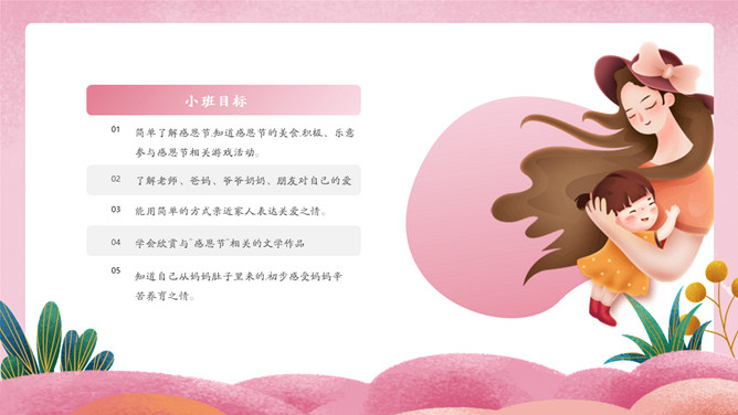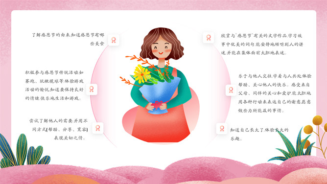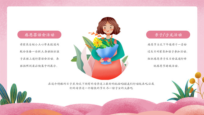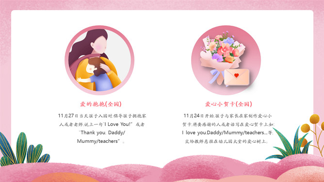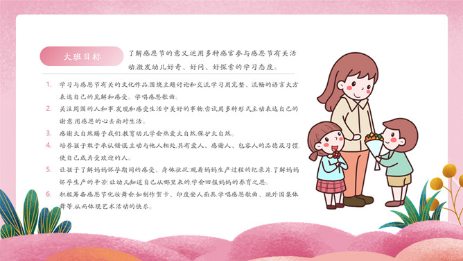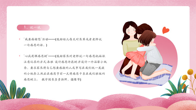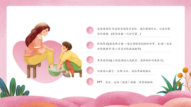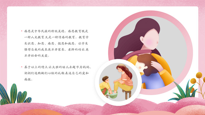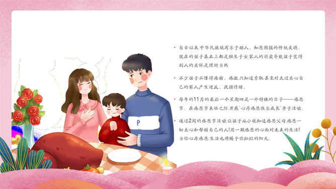 幼儿园感恩节活动策划PPT模板。感恩是中华民族的传统美德。感恩教育既是一种人文教育,又是一种情感的教育。教育学生识恩、知恩、感恩、报恩和施恩。让学生懂得自我的成长离不开家长、老师的付出,离不开社会的关爱。