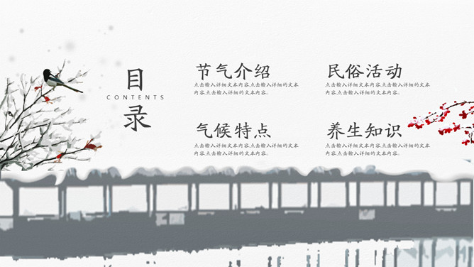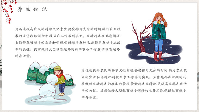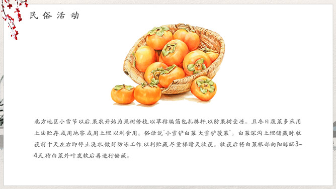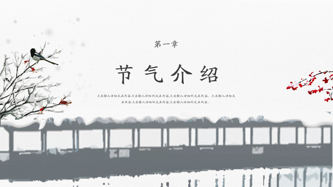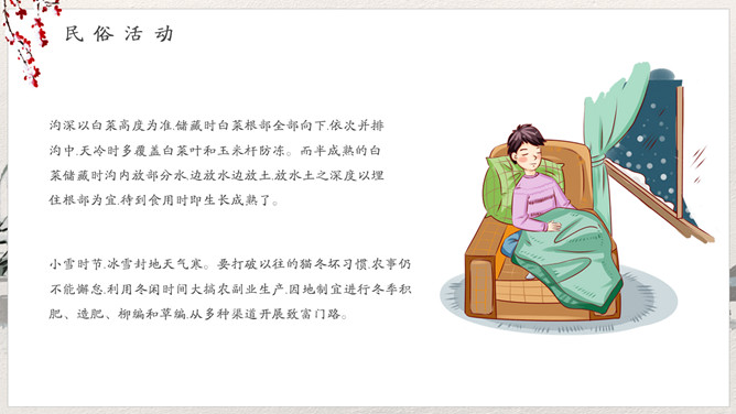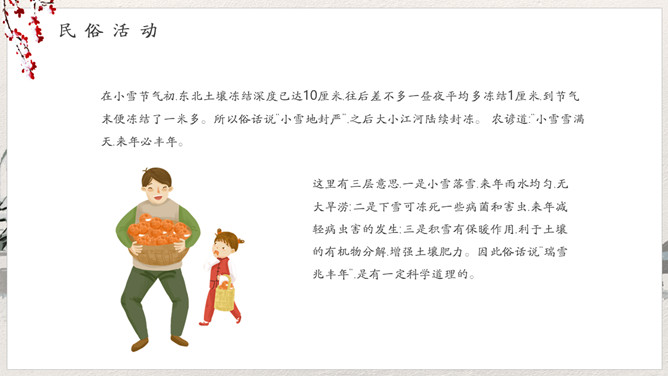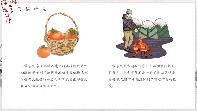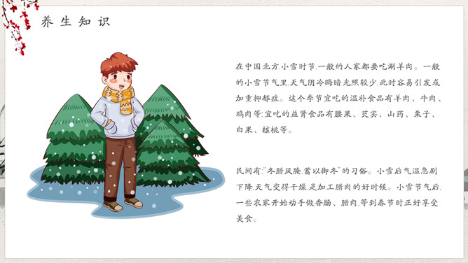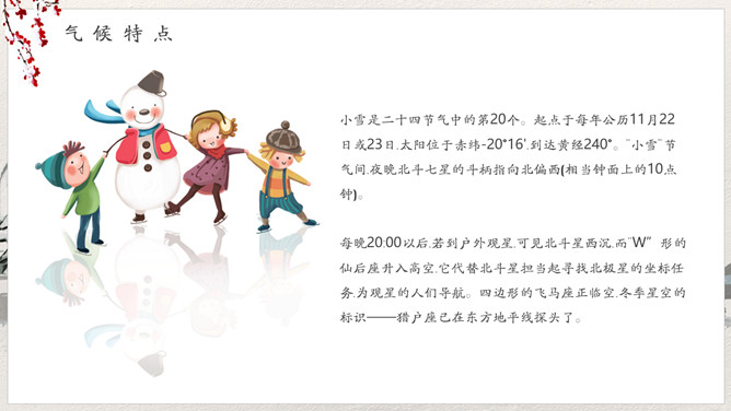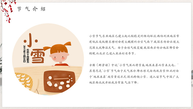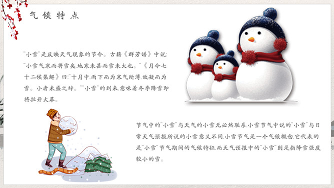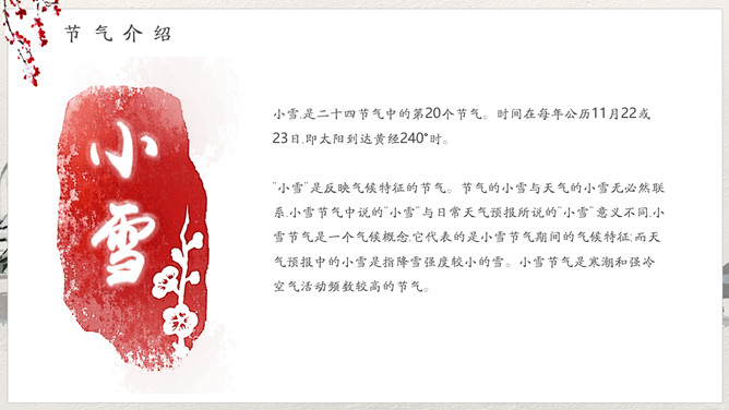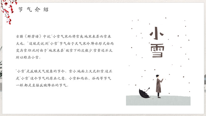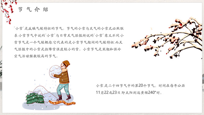 落雪树枝小雪节气PPT模板。小雪节气是一个气候概念,它代表的是小雪节气期间的气候特征;而天气预报中的小雪是指降雪强度较小的雪。