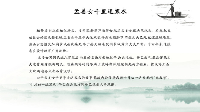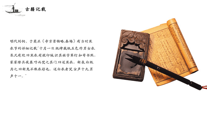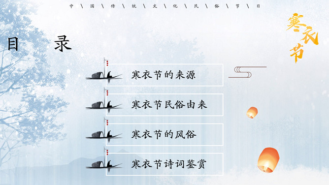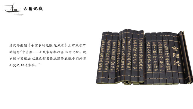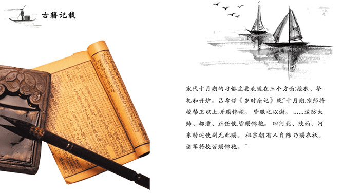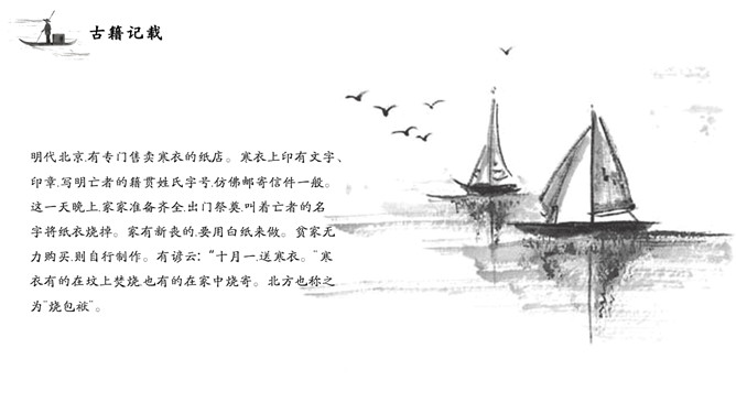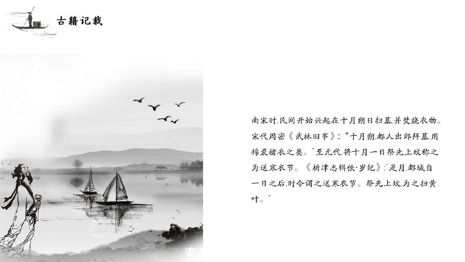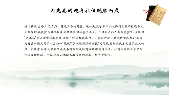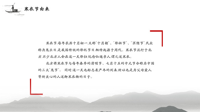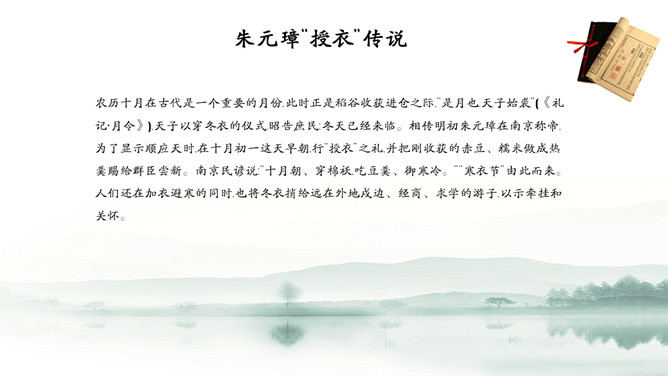 山水松树寒衣节PPT模板。寒衣节,每年农历十月初一,又称“十月朝”、“祭祖节”、“冥阴节”,民众称为鬼头日,是我国传统的祭祀节日,相传起源于周代。寒衣节流行于北方,不少北方人会在这一天祭扫,纪念仙逝亲人,谓之送寒衣。