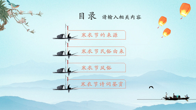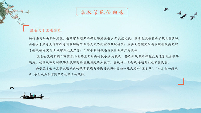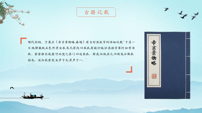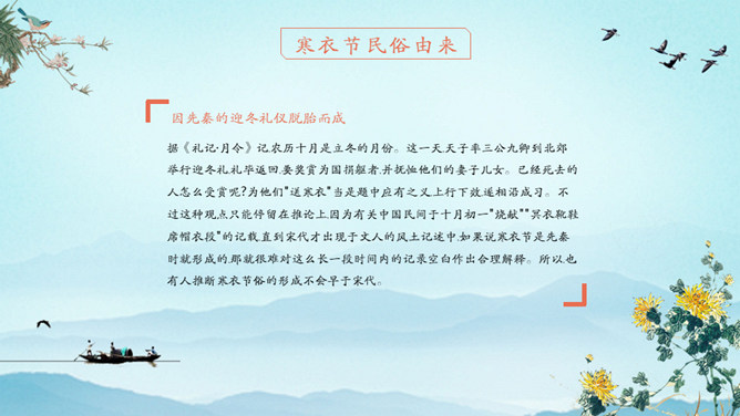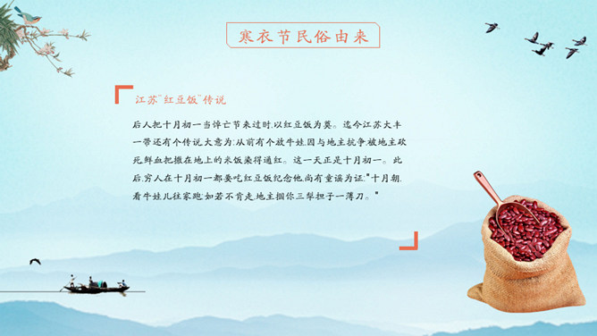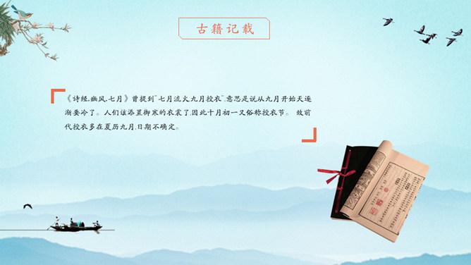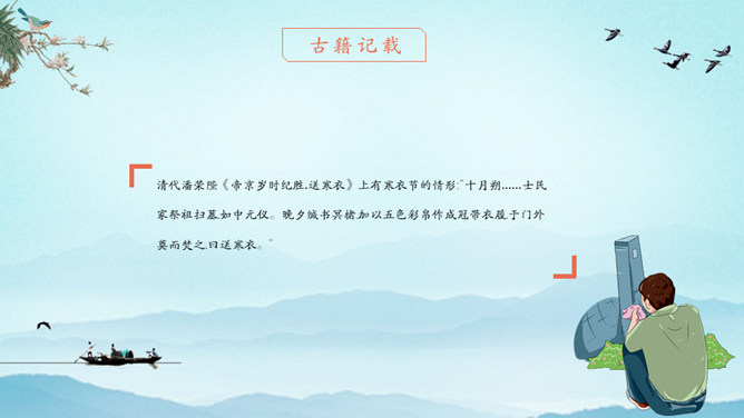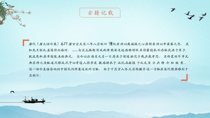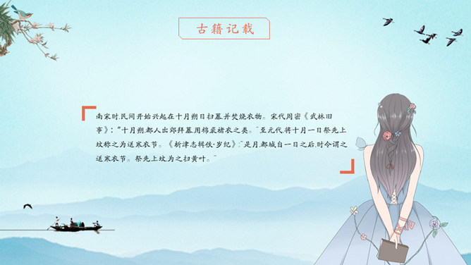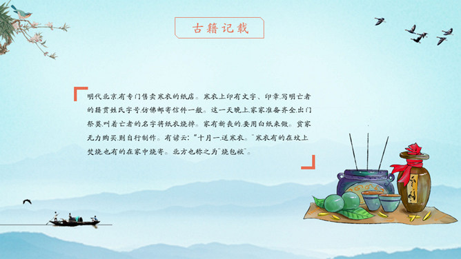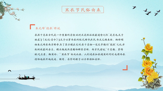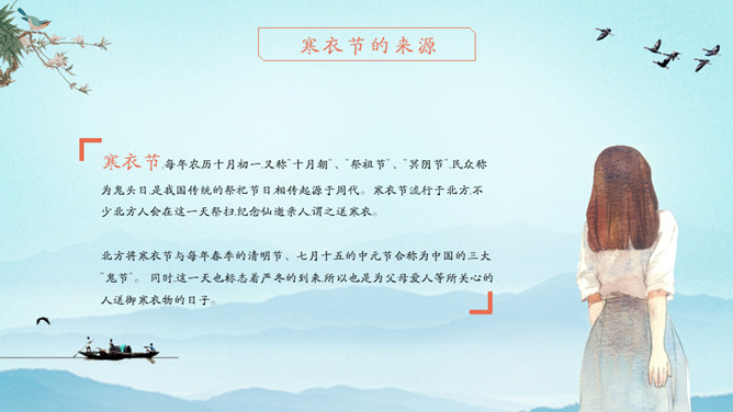 山水孤舟红日寒衣节PPT模板。北方将寒衣节与每年春季的清明节、七月十五的中元节合称为中国的三大“鬼节”。 同时,这一天也标志着严冬的到来,所以也是为父母爱人等所关心的人送御寒衣物的日子。