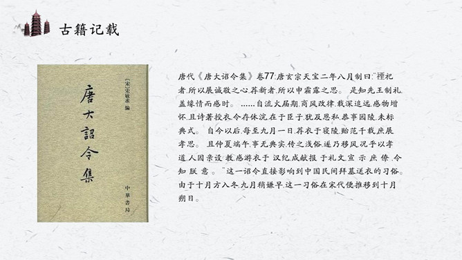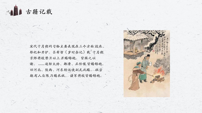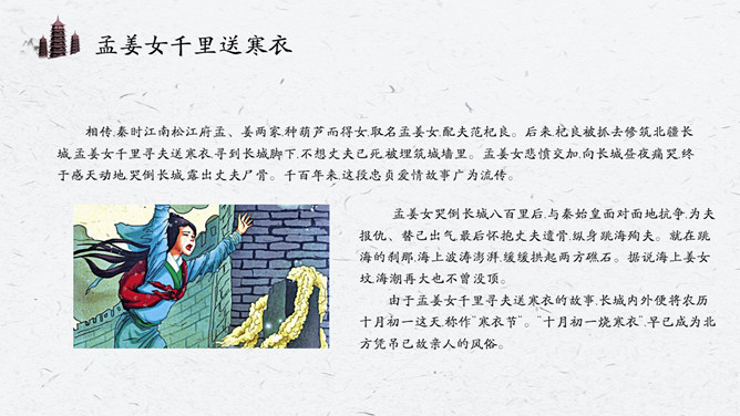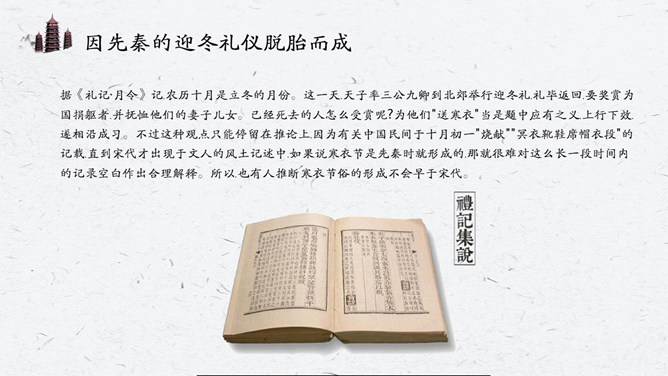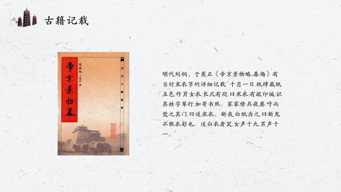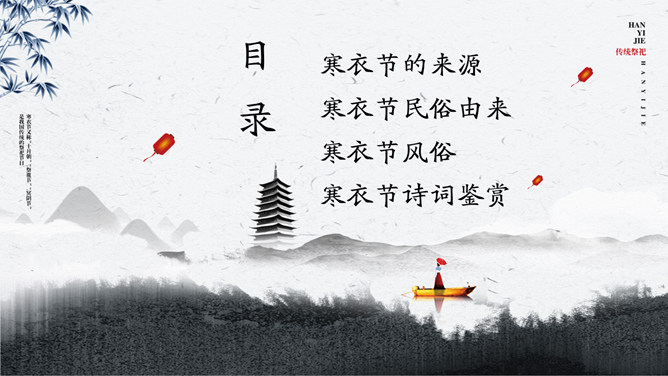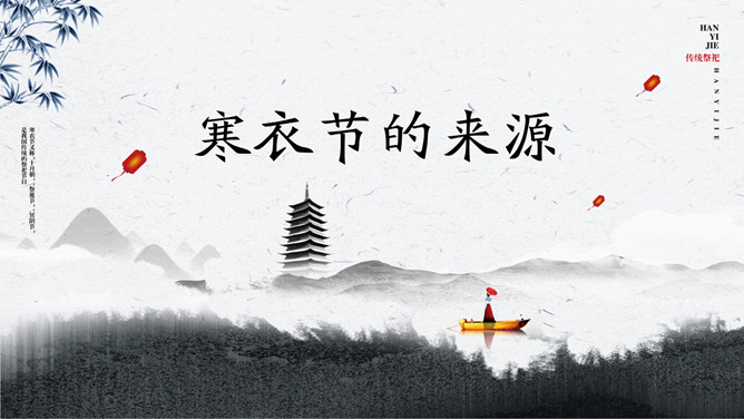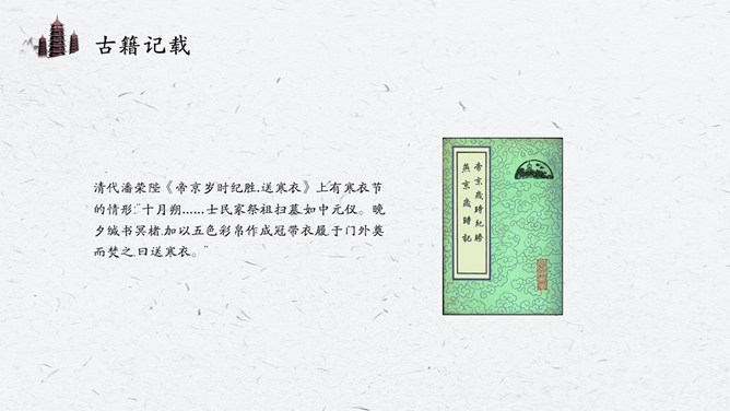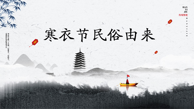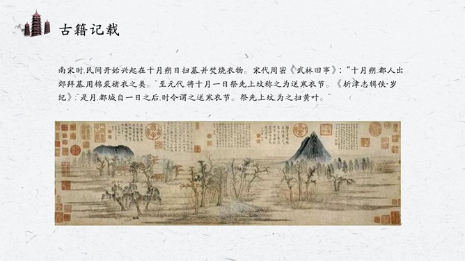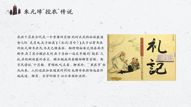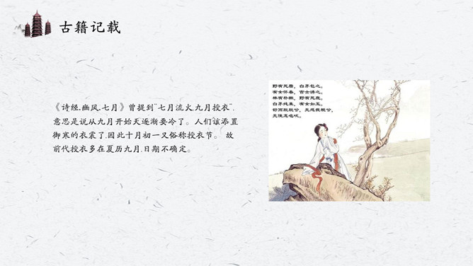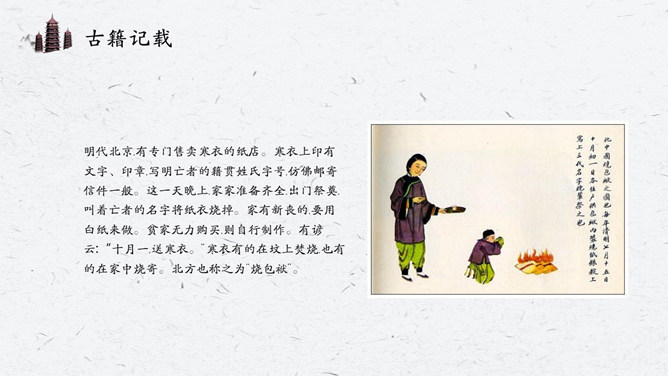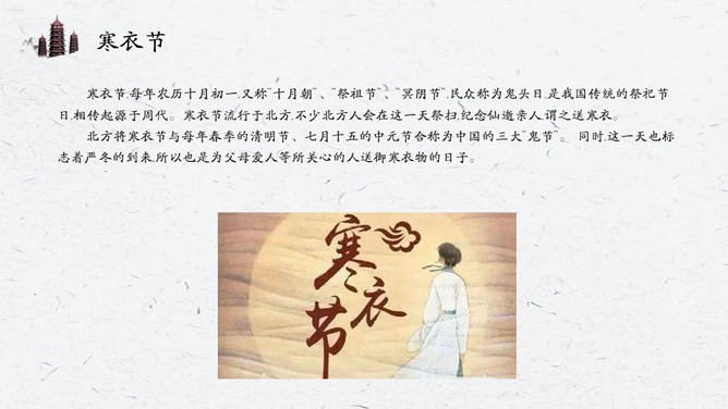 水墨寒衣节介绍PPT模板。《诗经.豳风.七月》曾提到“七月流火,九月授衣”,意思是说从九月开始天逐渐要冷了。人们该添置御寒的衣裳了,因此十月初一又俗称授衣节。 故前代授衣多在夏历九月,日期不确定。