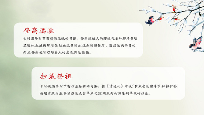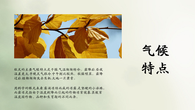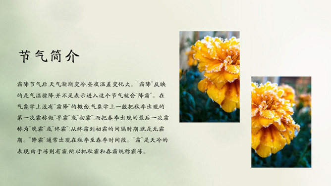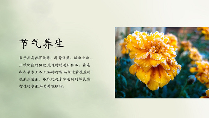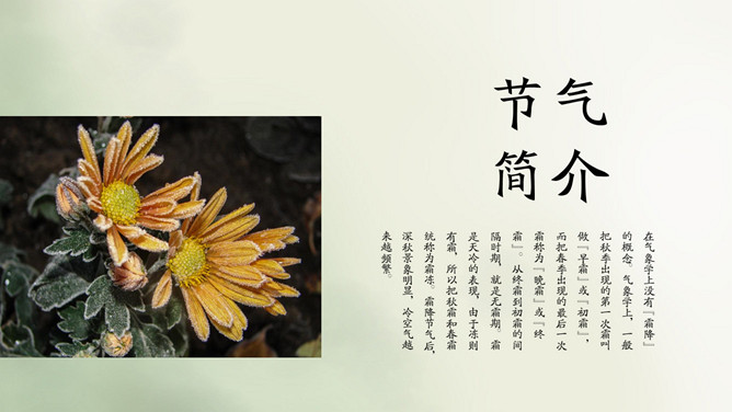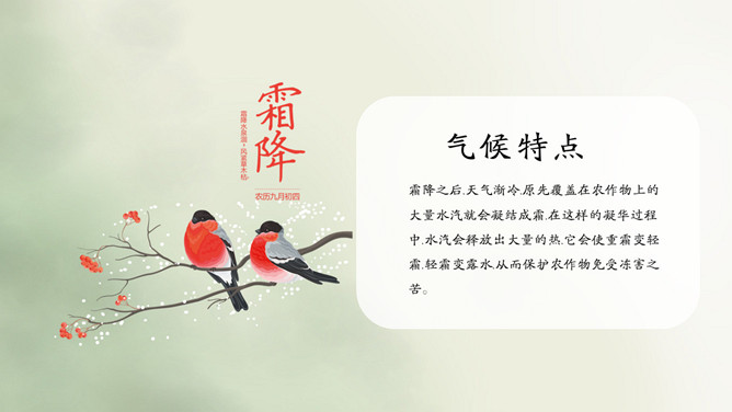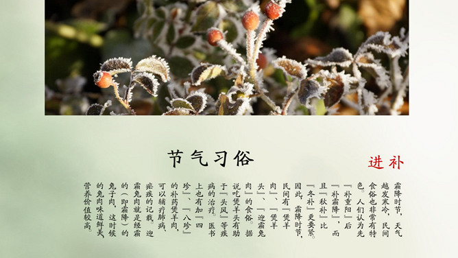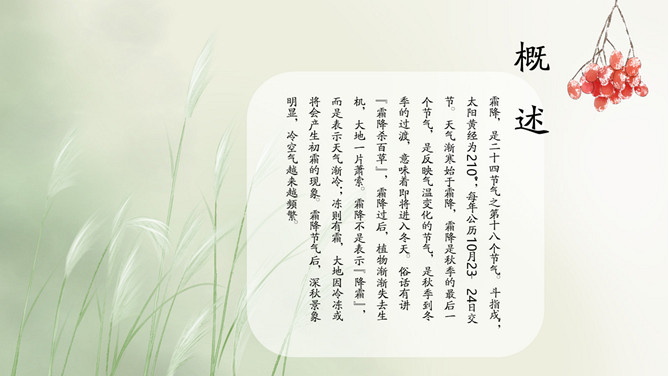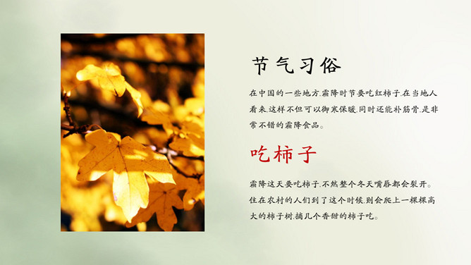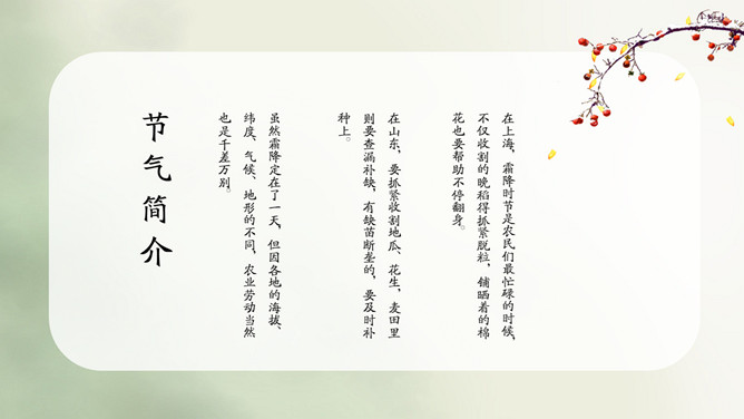 茅草柿子霜降节气PPT模板。虽然霜降定在了一天,但因各地的海拔、纬度、气候、地形的不同,农业劳动当然也是千差万别。