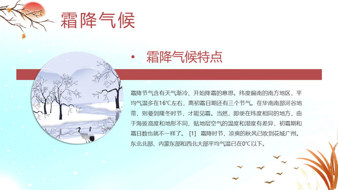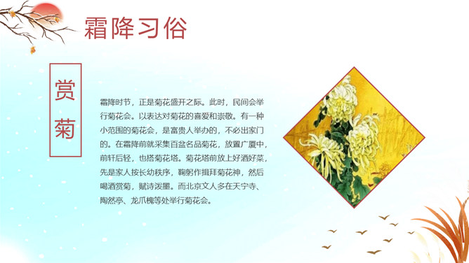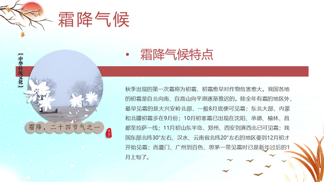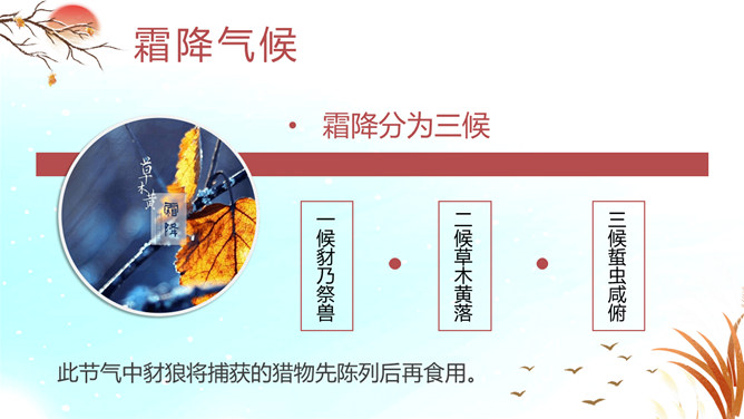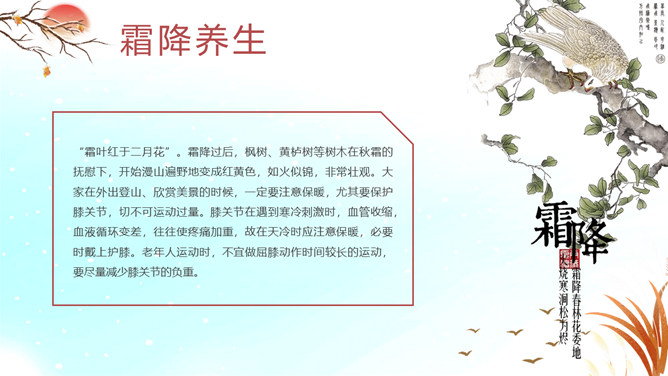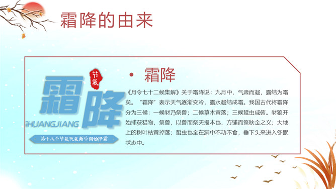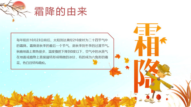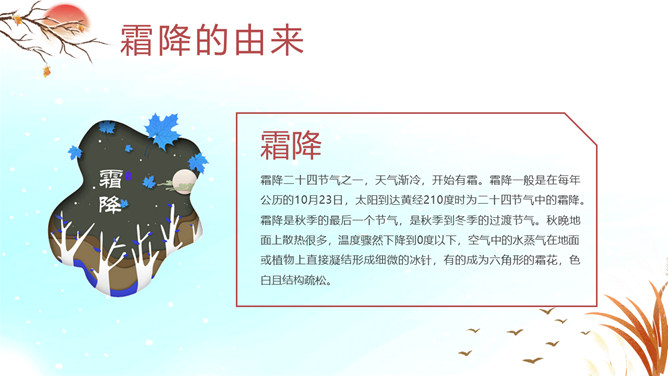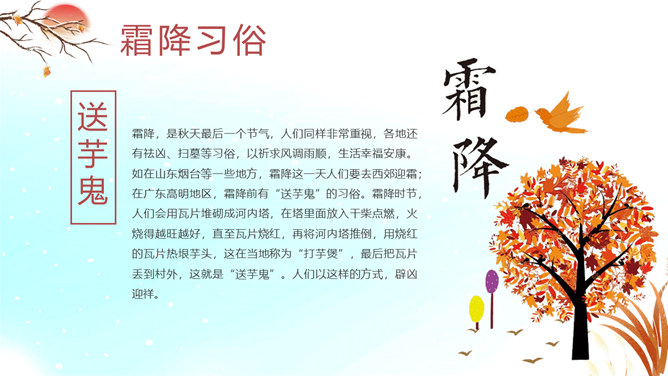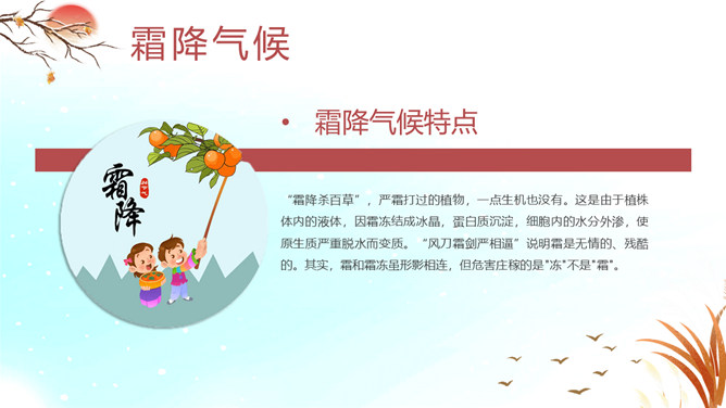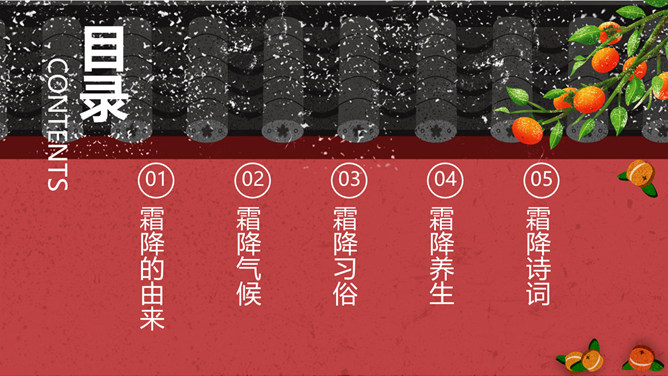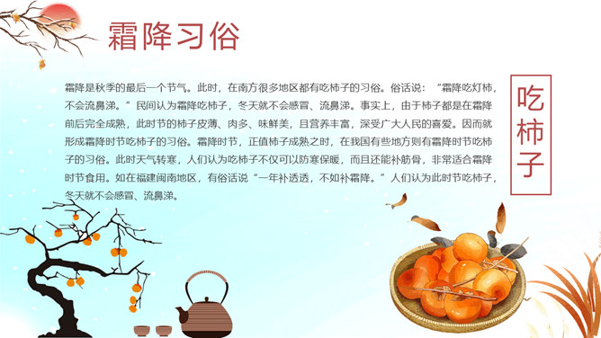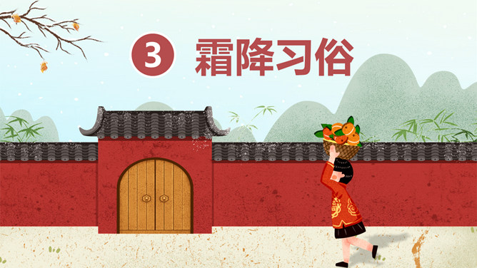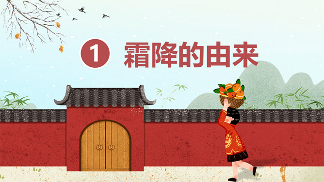 红墙柿子霜降节气PPT模板。每年阳历10月23日前后,太阳到达黄经210度时为二十四节气中的霜降。霜降是秋季的最后一个节气,是秋季到冬季的过渡节气。秋晚地面上散热很多,温度骤然下降到0度以下,空气中的水蒸气在地面或植物上直接凝结形成细微的冰针,有的成为六角形的霜花,色白且结构疏松。