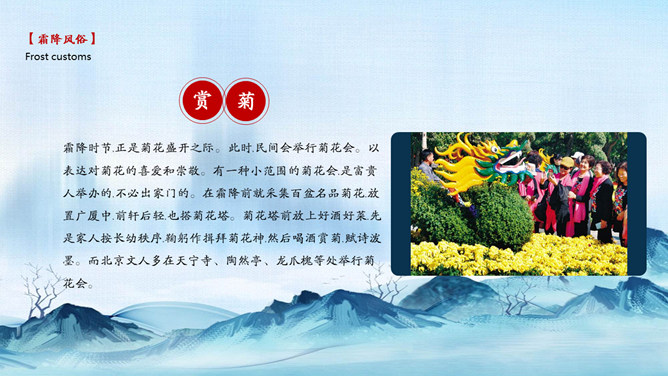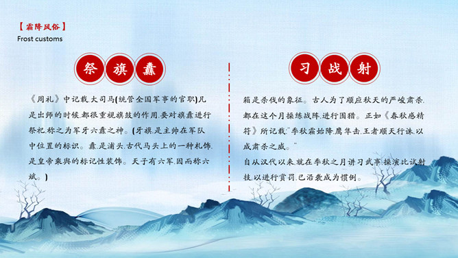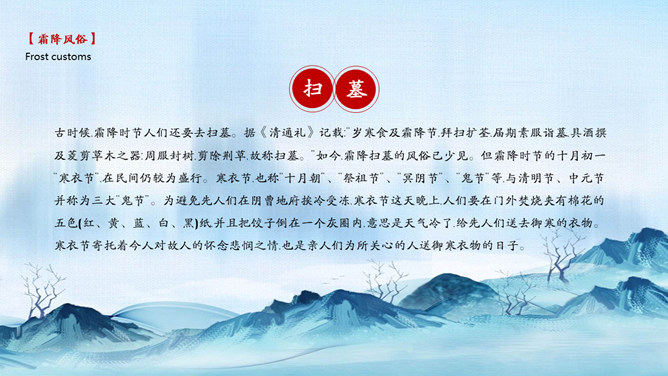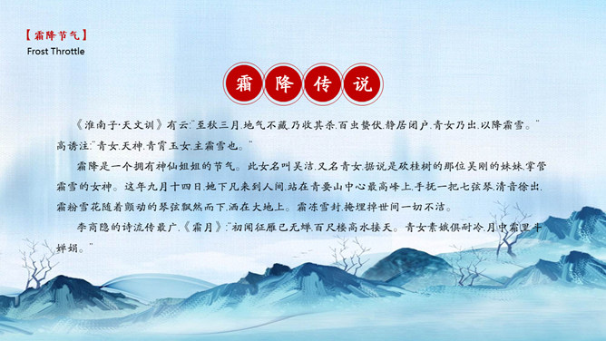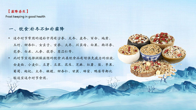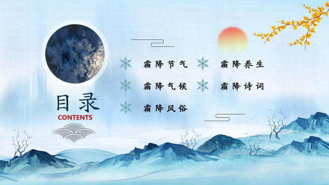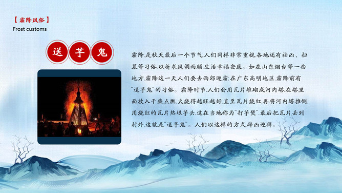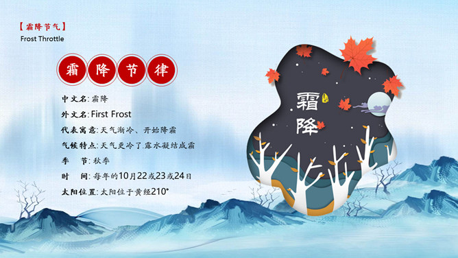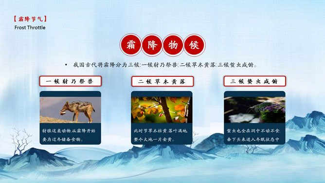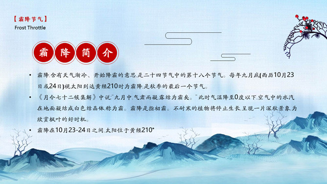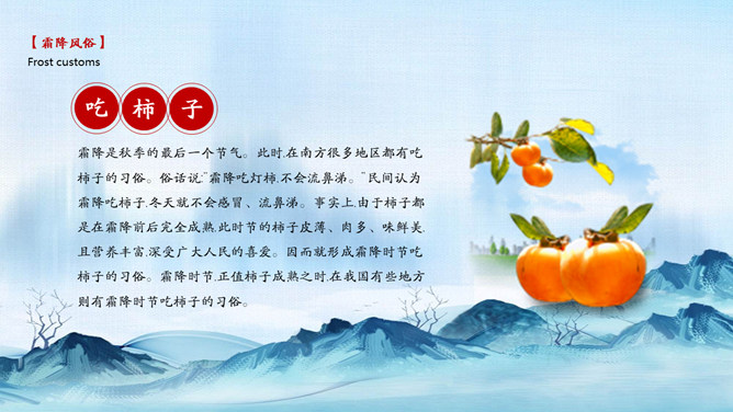 小鹿霜降节气介绍PPT模板。霜降是秋季的最后一个节气。此时,在南方很多地区都有吃柿子的习俗。俗话说:“霜降吃灯柿,不会流鼻涕。”民间认为霜降吃柿子,冬天就不会感冒、流鼻涕。