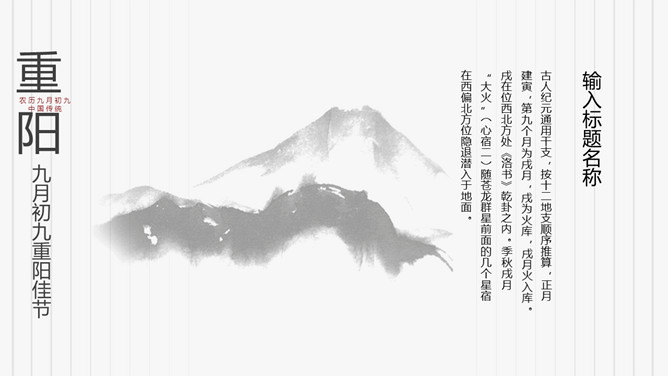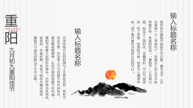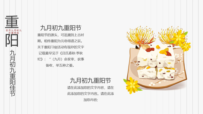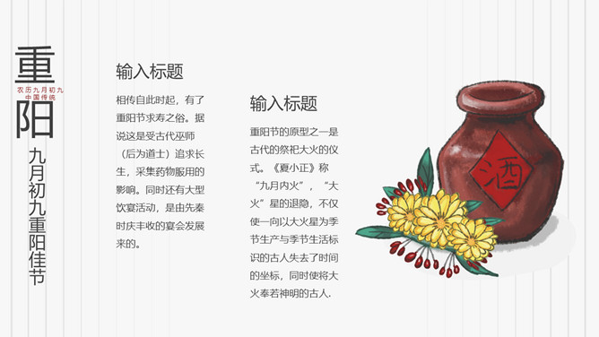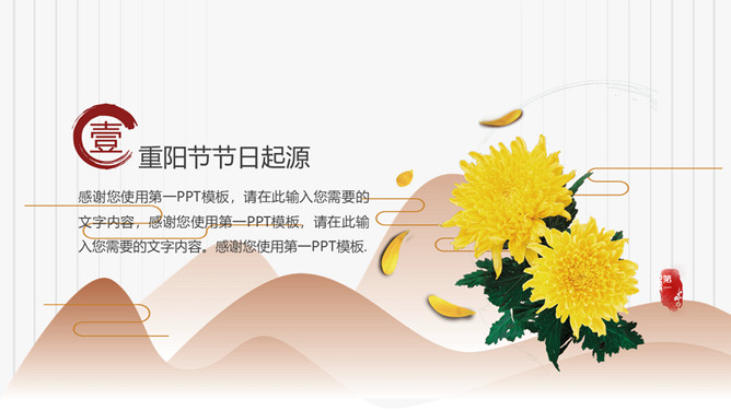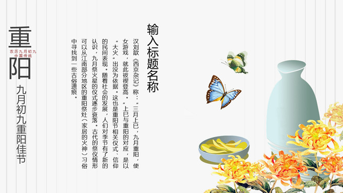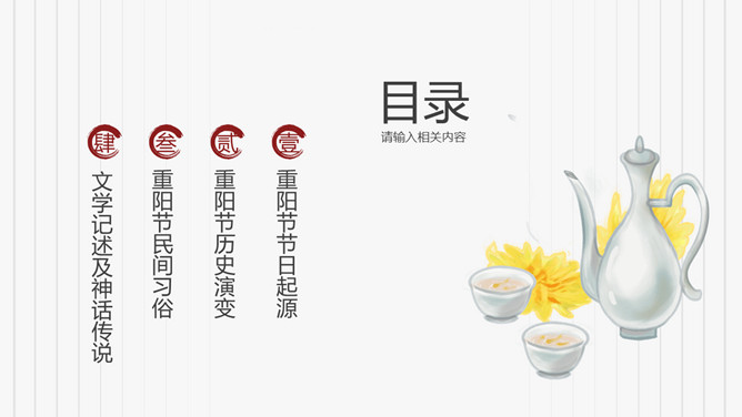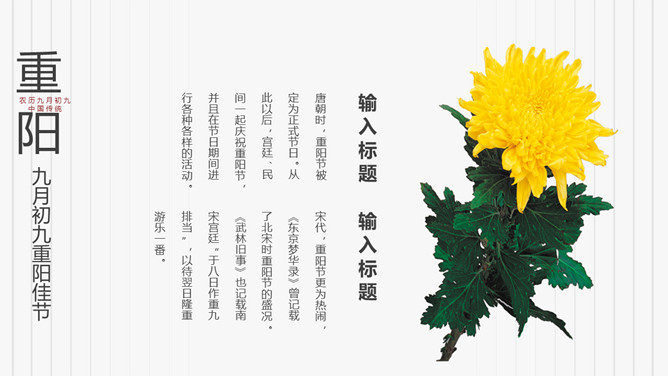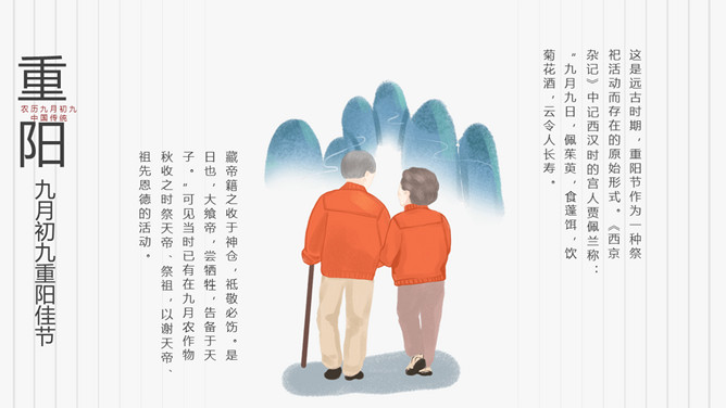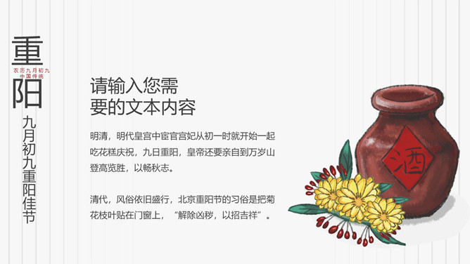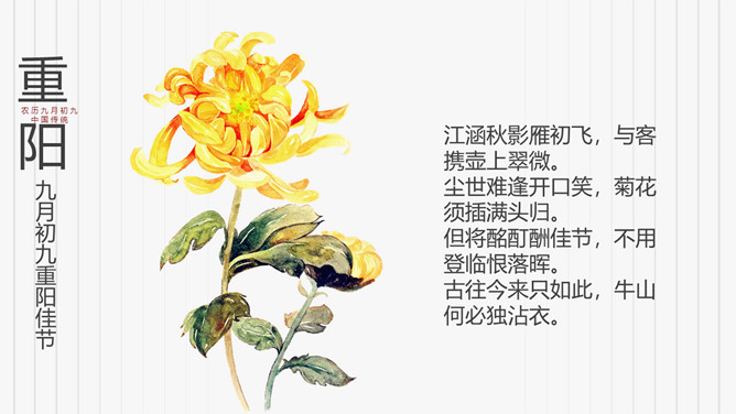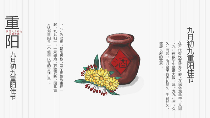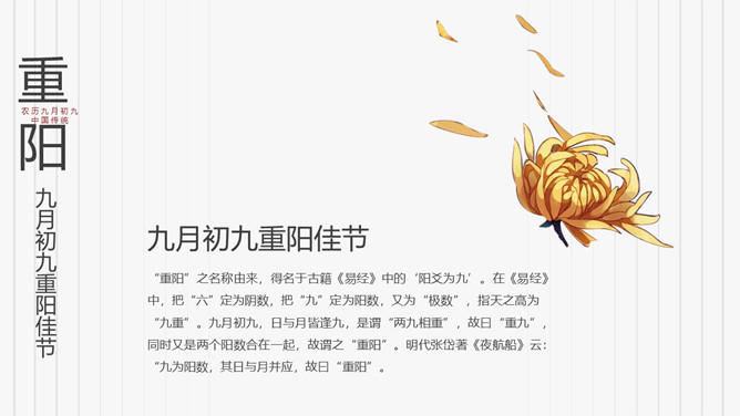 菊花重阳节介绍PPT模板。在古代有饮宴祈寿之俗。在民俗观念中,又因“九”在数字中是最大数,且“九九”与“久久”同音,所以赋予有天长地久、生命长久、健康长寿的寓意。