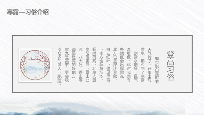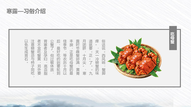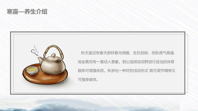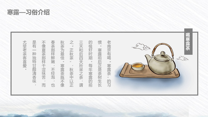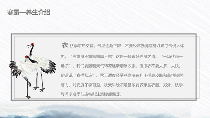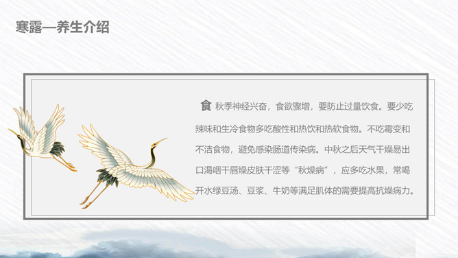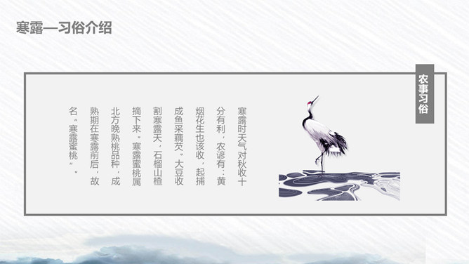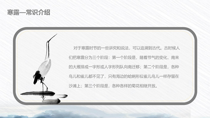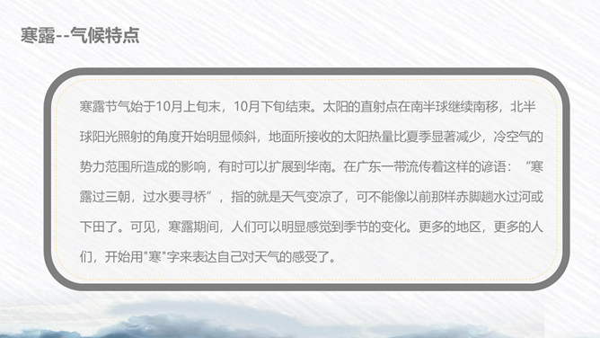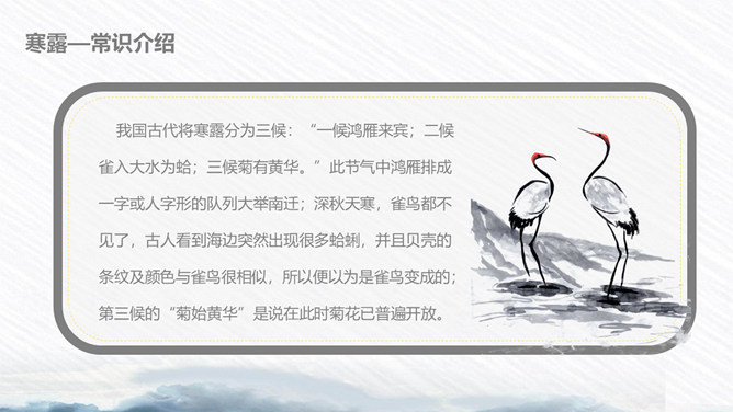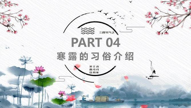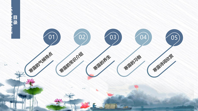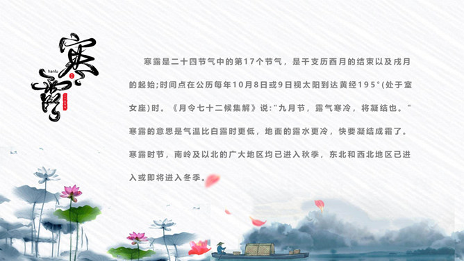 荷花寒露节气主题PPT模板。寒露节气始于10月上旬末,10月下旬结束。太阳的直射点在南半球继续南移,北半球阳光照射的角度开始明显倾斜,地面所接收的太阳热量比夏季显著减少,冷空气的势力范围所造成的影响,有时可以扩展到华南。在广东一带流传着这样的谚语:“寒露过三朝,过水要寻桥”,指的就是天气变凉了,可不能像以前那样赤脚趟水过河或下田了。