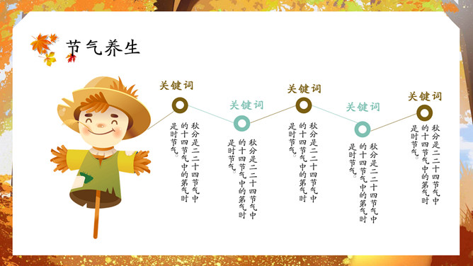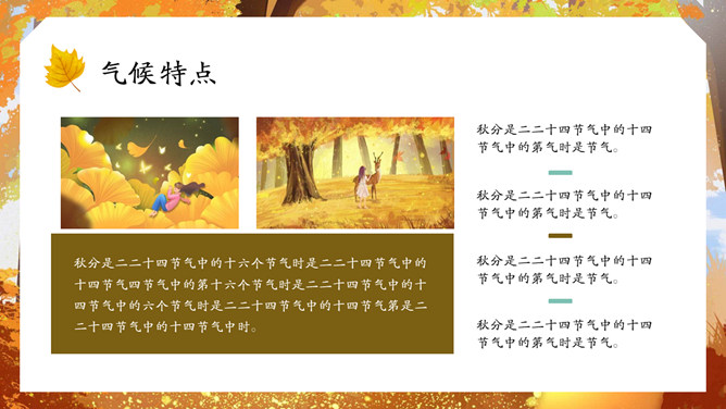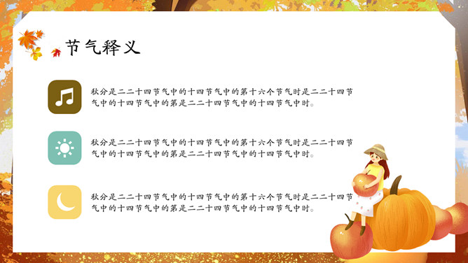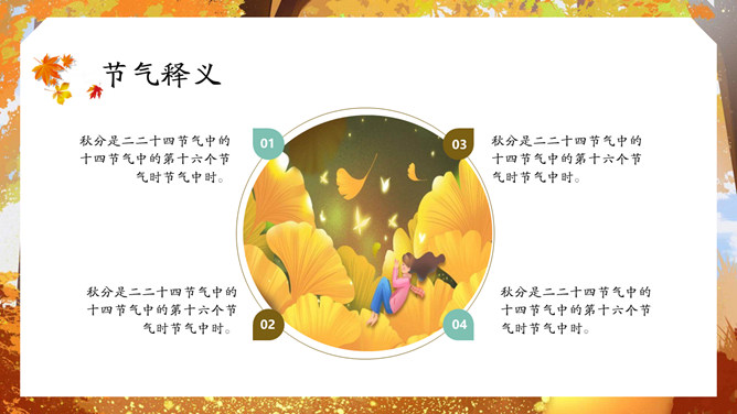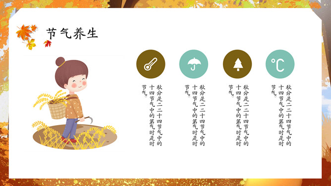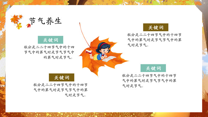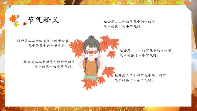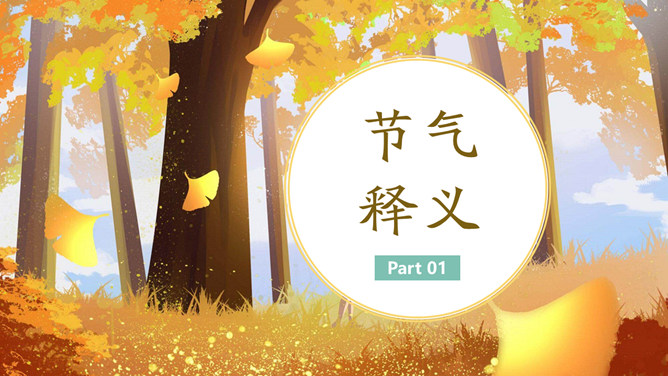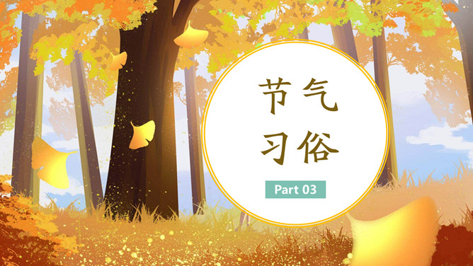 女孩树林秋分节气PPT模板。内容包括节气释义、节气习俗、气候特点、节气养生等内容。