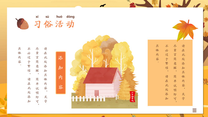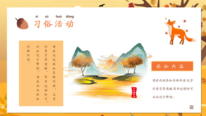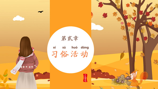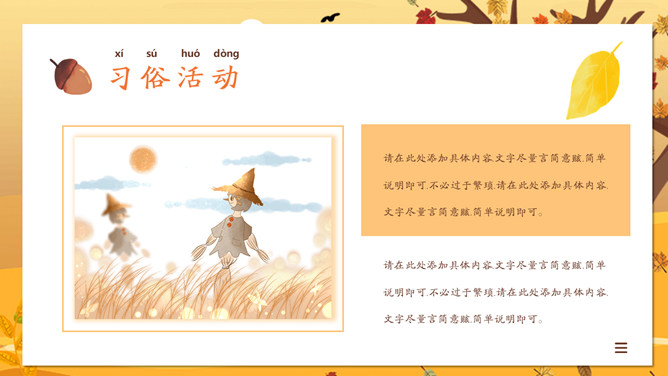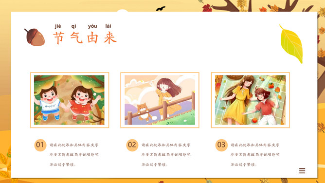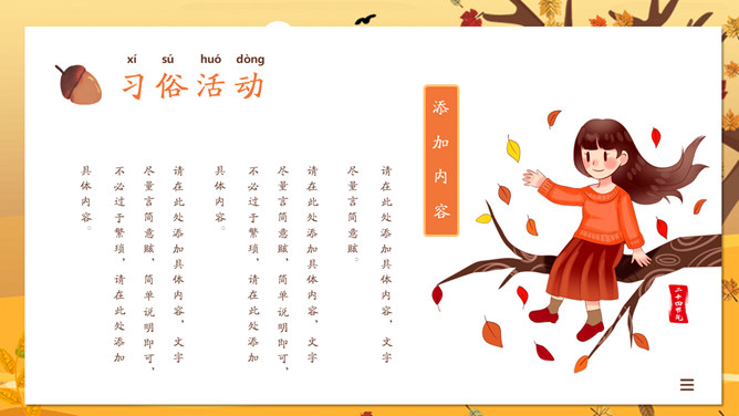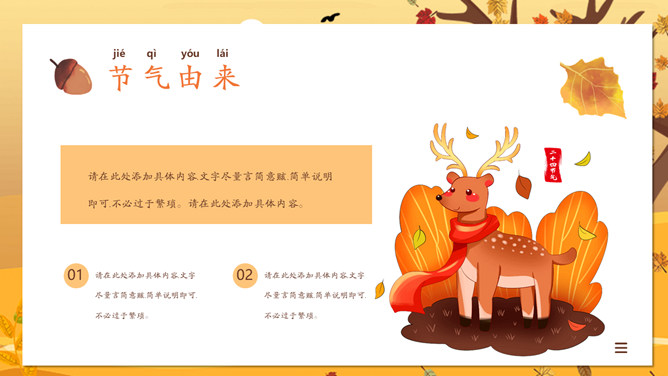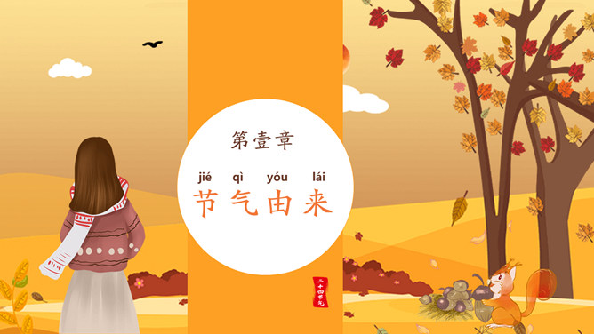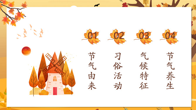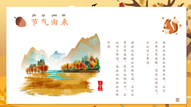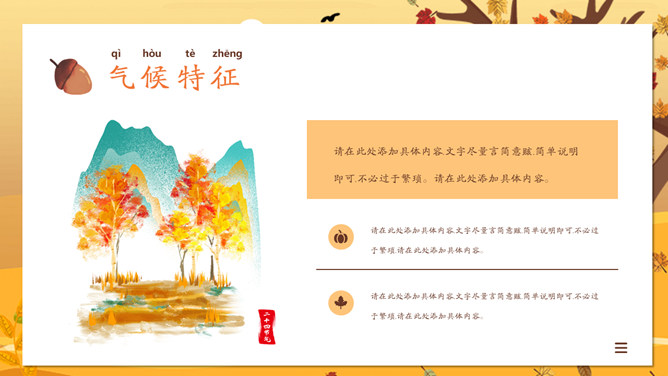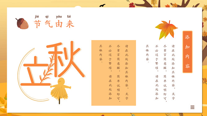 一叶知秋立秋节气PPT模板。一套设计精美的秋天主题模板,树木落叶背景,黄色主色调,动态播放。