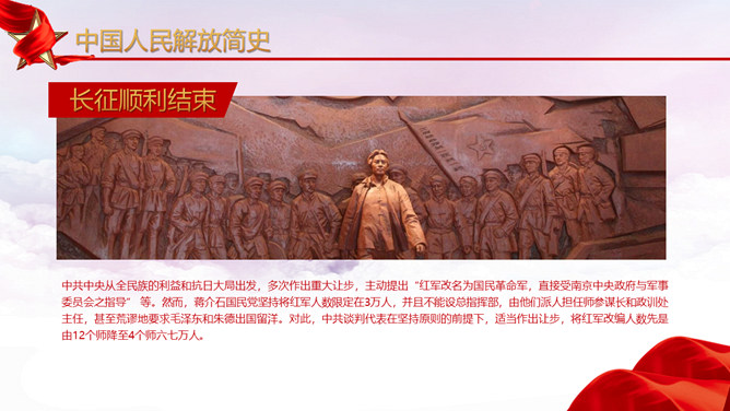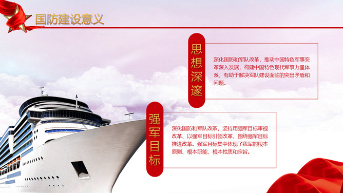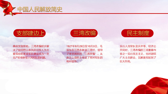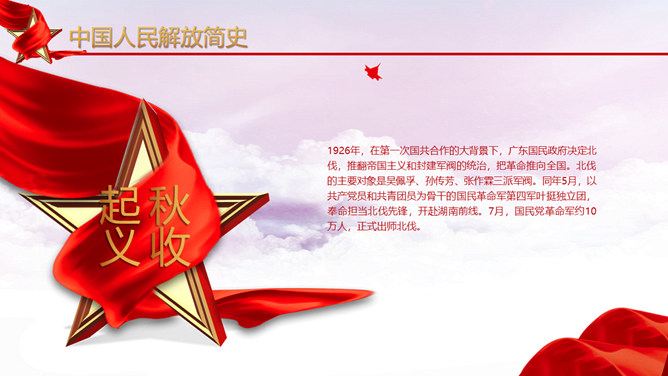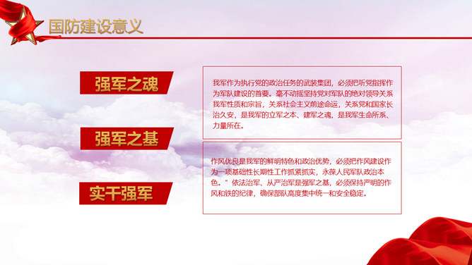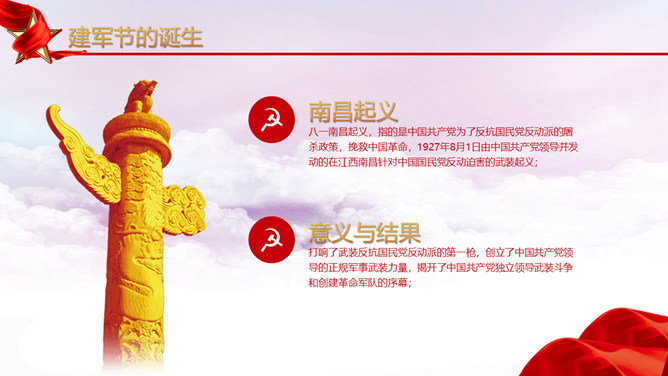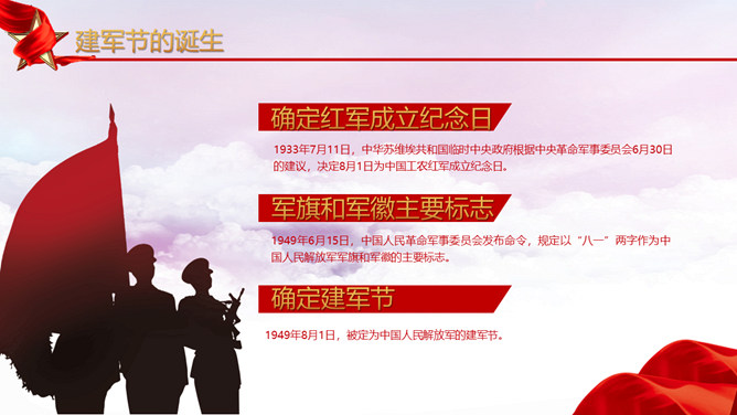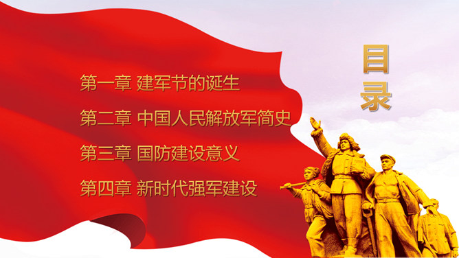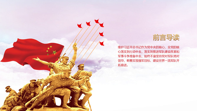 人民解放军建军节PPT模板。维护习近平总书记作为党中央的核心、全党的核心落实到行动中去,落实到推进军队建设改革和军事斗争准备中去,始终不渝坚持党对军队绝对领导,朝着实现强军目标、建设世界一流军队开拓奋进。