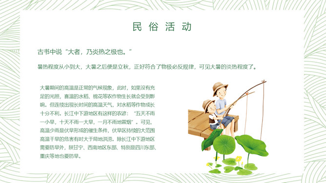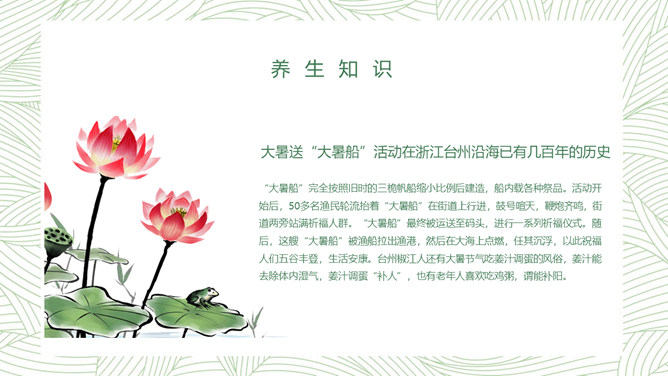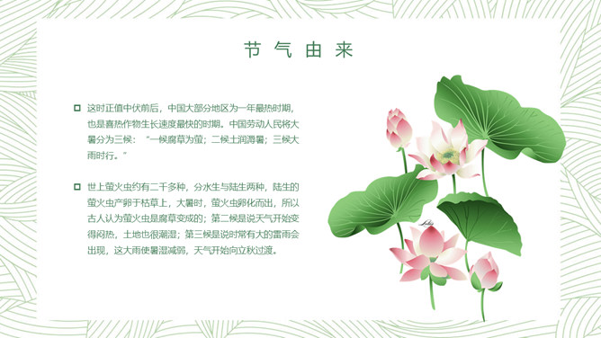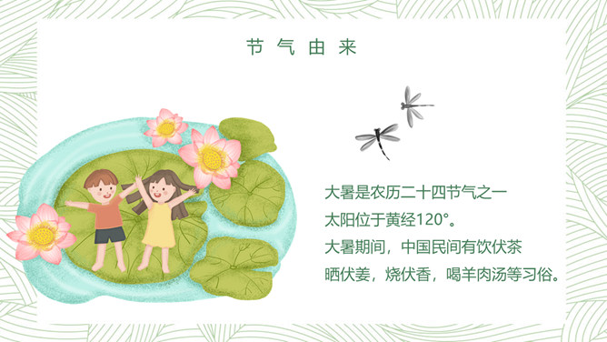 荷花大暑节气主题PPT模板。大暑节气正值“三伏天”里的“中伏”前后,是一年中最热的时期,气温最高,农作物生长最快,同时,很多地区的旱、涝、风灾等各种气象灾害也最为频繁。