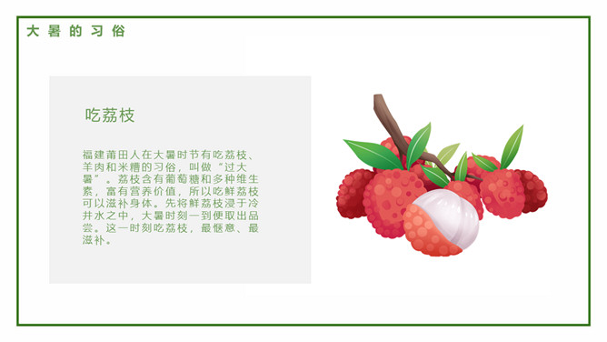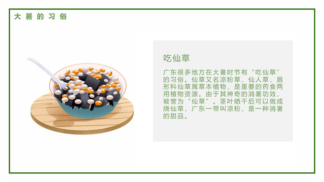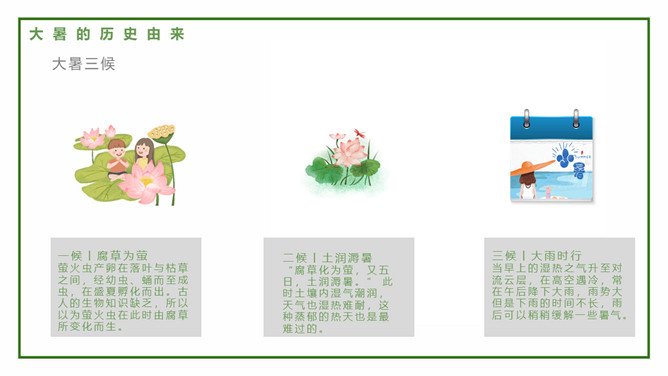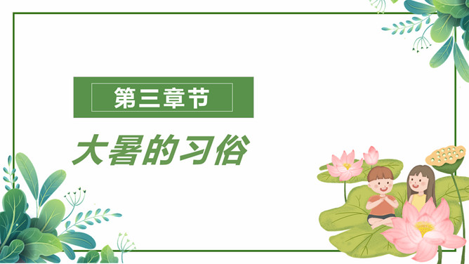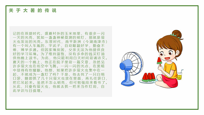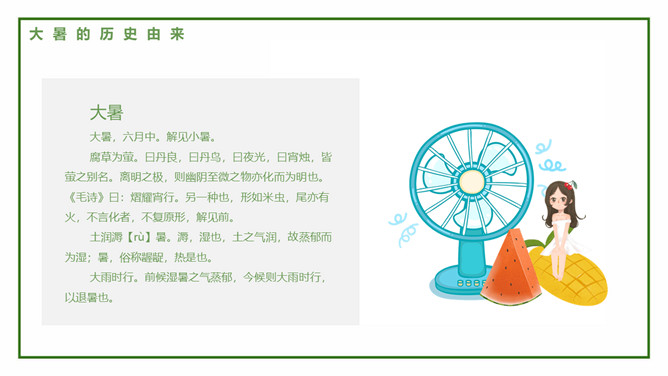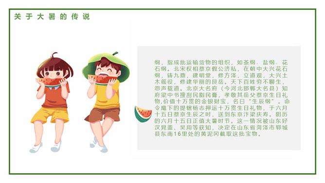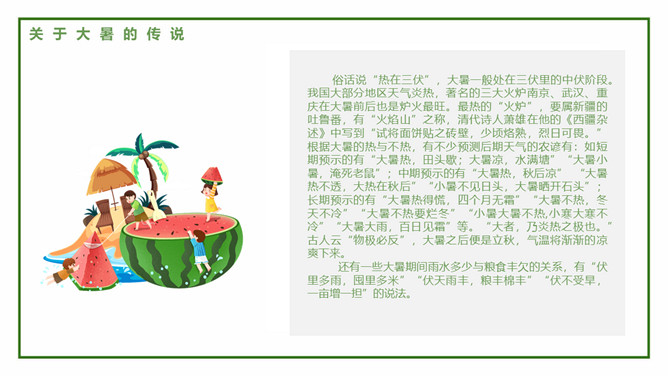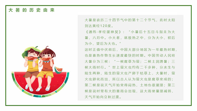 西瓜大暑节气介绍PPT模板。俗话说“热在三伏”,大暑一般处在三伏里的中伏阶段。我国大部分地区天气炎热,著名的三大火炉南京、武汉、重庆在大暑前后也是炉火最旺。