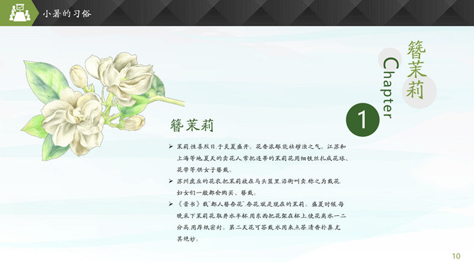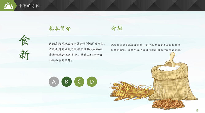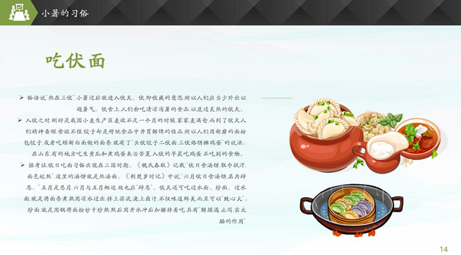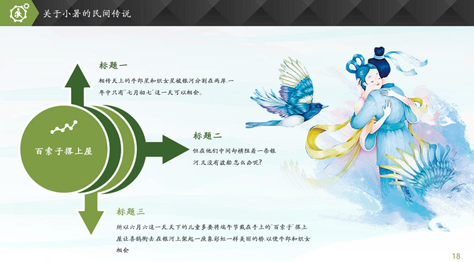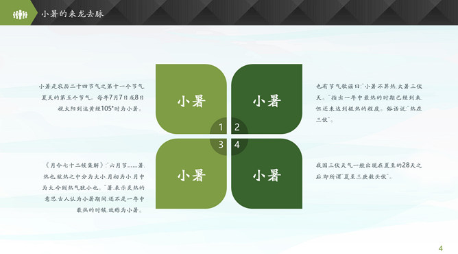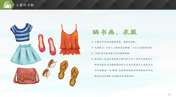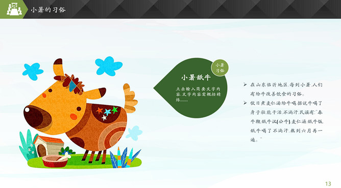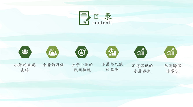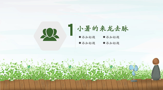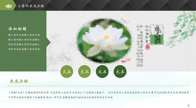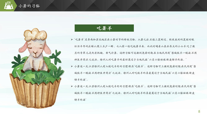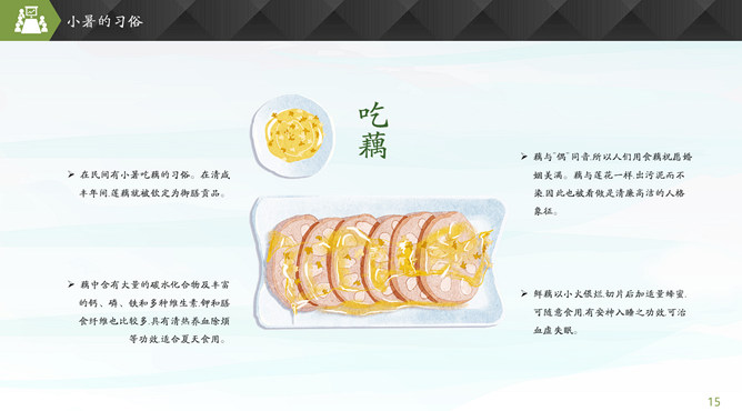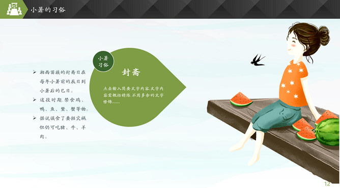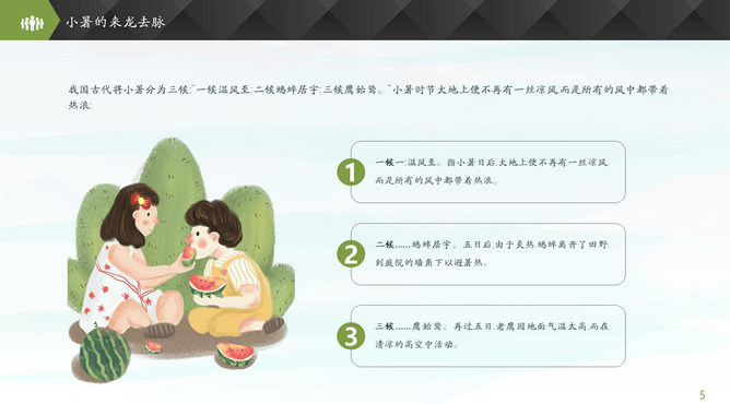 莲蓬女孩小暑节气PPT模板。《诗经•七月》中描述蟋蟀的字句有“七月在野,八月在宇,九月在户,十月蟋蟀入我床下。”文中所说的八月即是夏历的六月,即小暑节气的时候,由于炎热,蟋蟀离开了田野,到庭院的墙角下以避暑热;在这一节气中,老鹰因地面气温太高而在清凉的高空中活动。