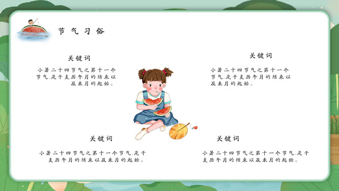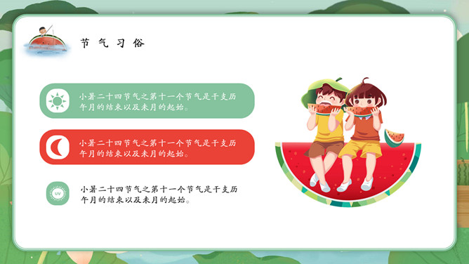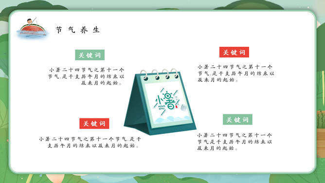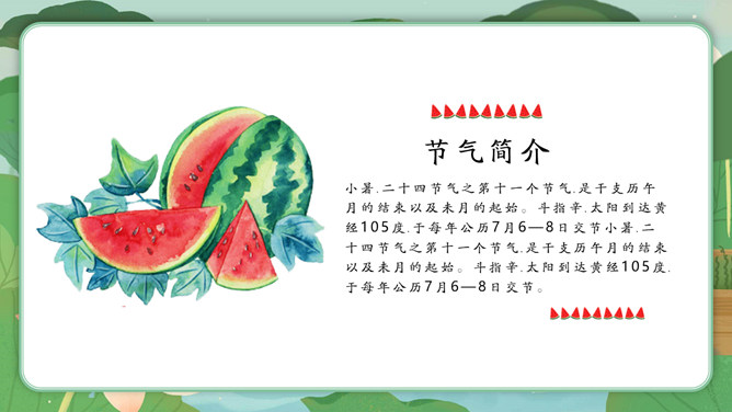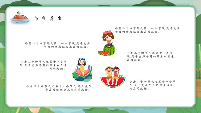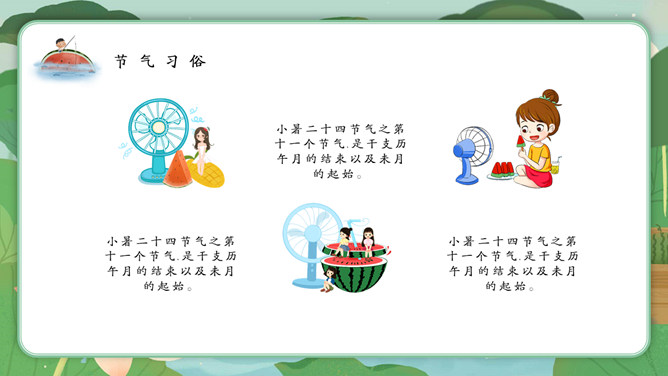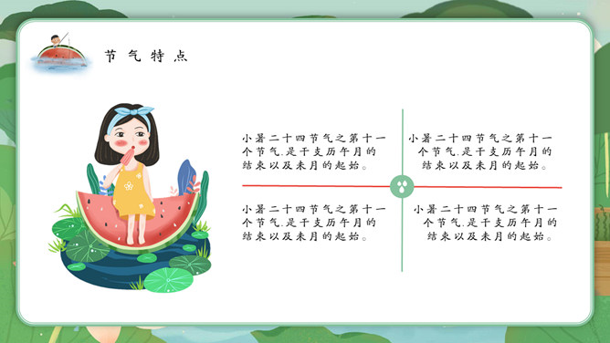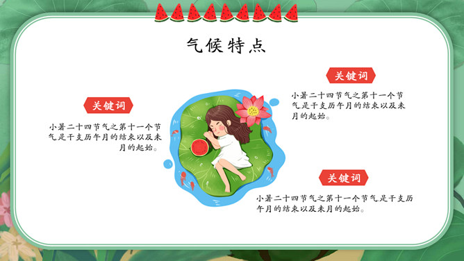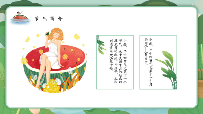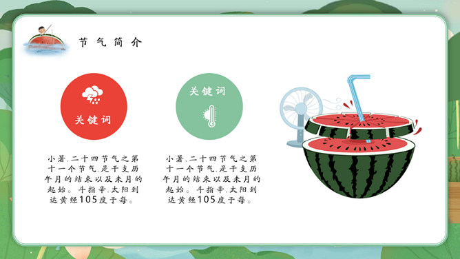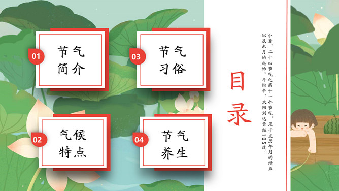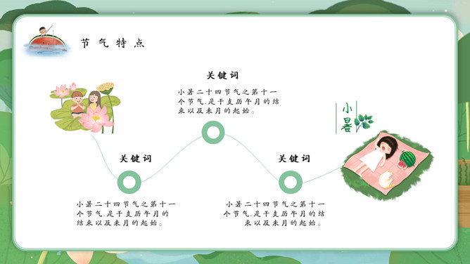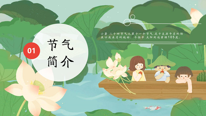 荷塘小船小暑节气PPT模板。小暑,二十四节气之第十一个节气,是干支历午月的结束以及未月的起始。斗指辛,太阳到达黄经105度,于每年公历7月6—8日交节小暑,二十四节气之第十一个节气,是干支历午月的结束以及未月的起始。斗指辛,太阳到达黄经105度,于每年公历7月6—8日交节。