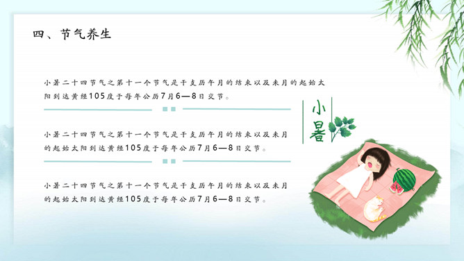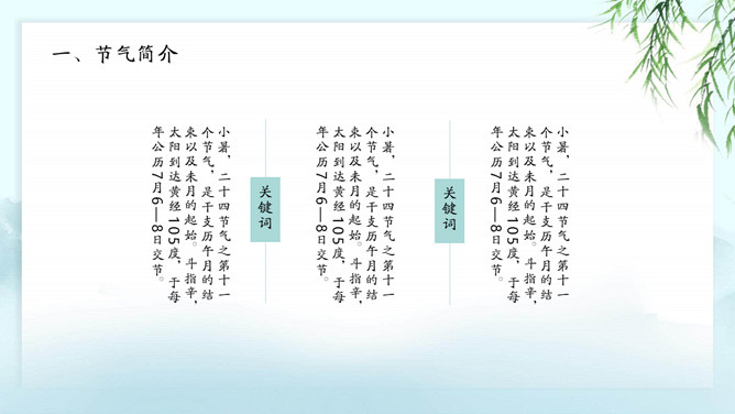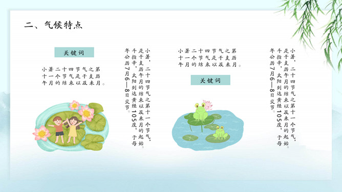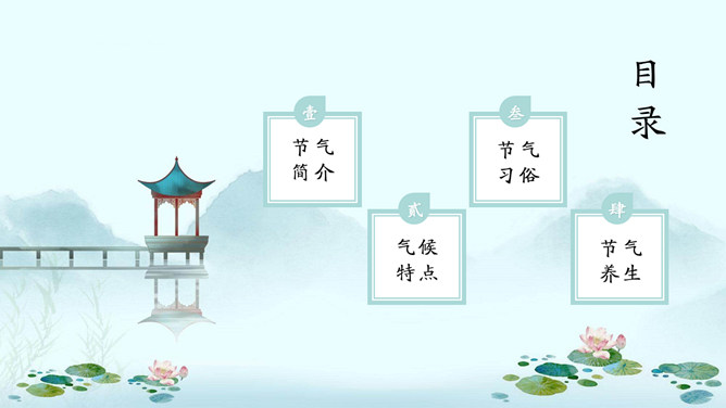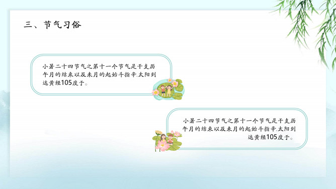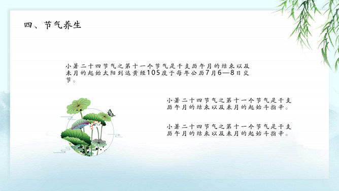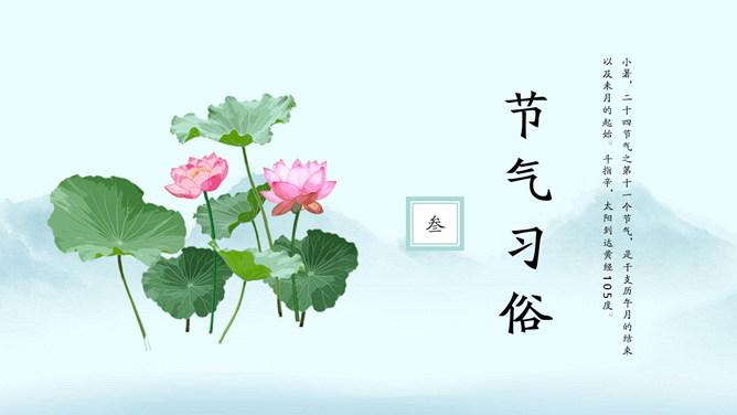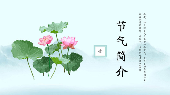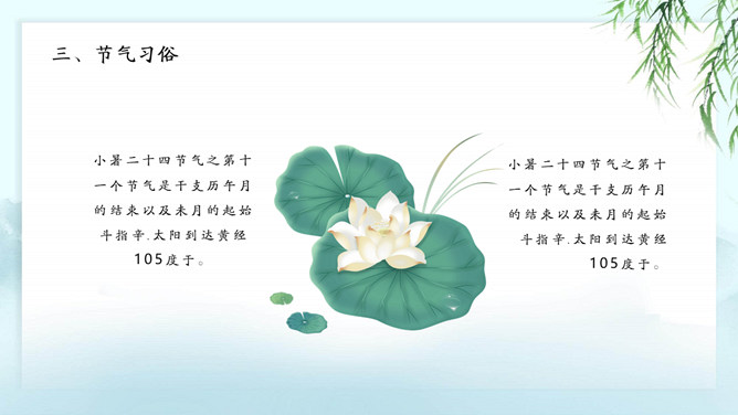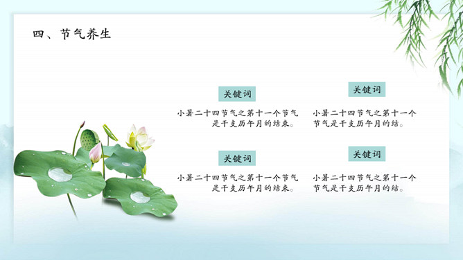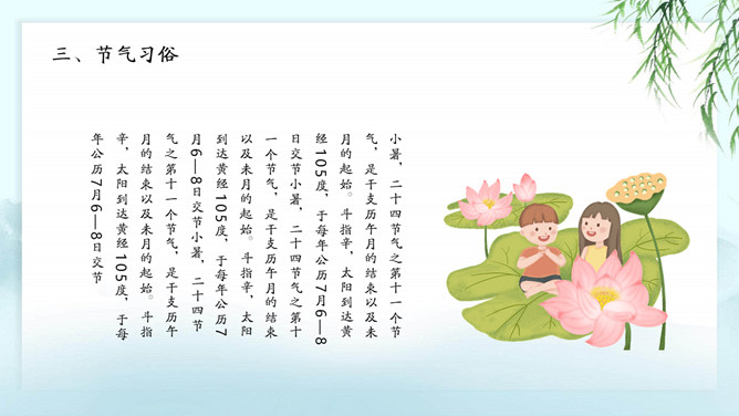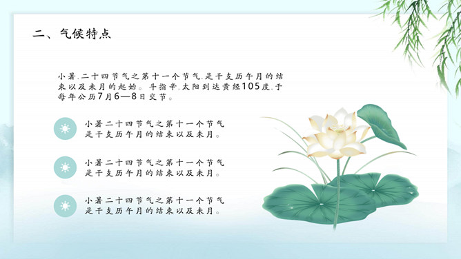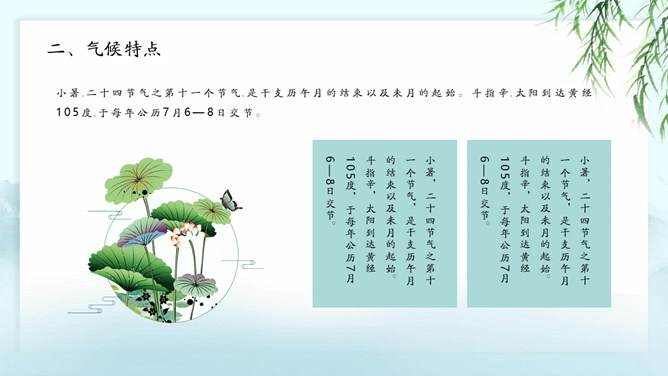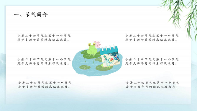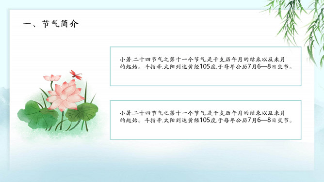 亭台远山柳树小暑PPT模板。一套小暑节气主题模板,荷塘、柳树、远处群山、亭台等中国风元素设计。