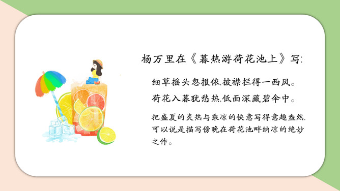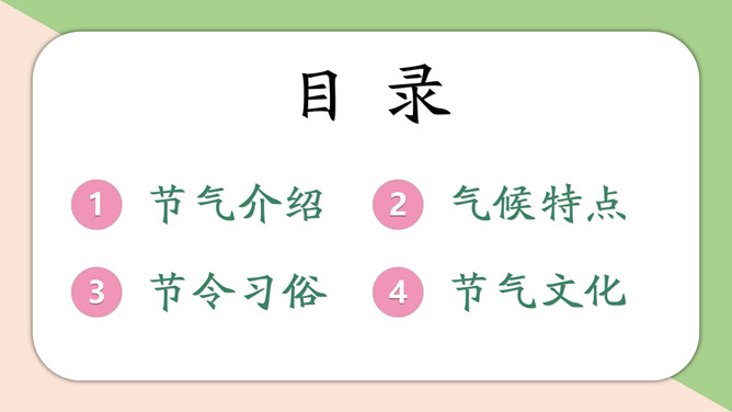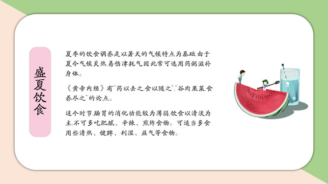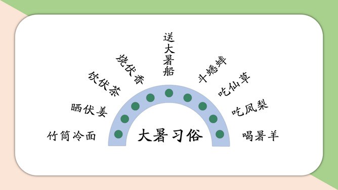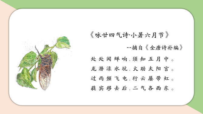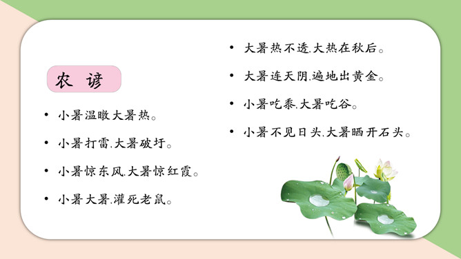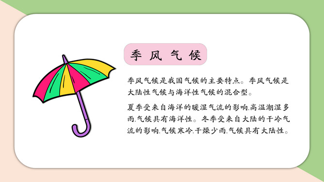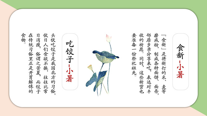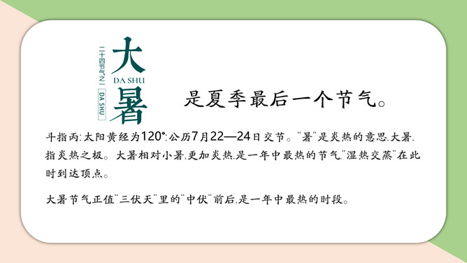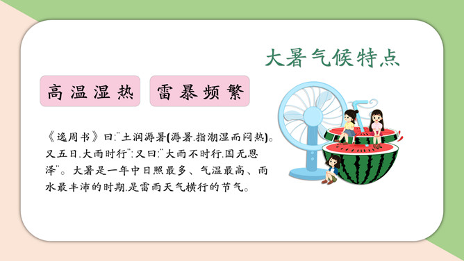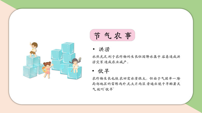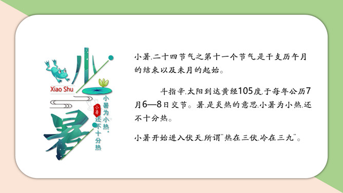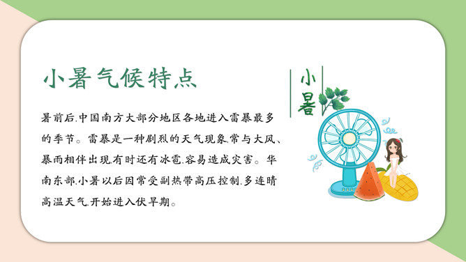二十四节气小暑PPT模板。夏季受来自海洋的暖湿气流的影响,高温潮湿多雨,气候具有海洋性。冬季受来自大陆的干冷气流的影响,气候寒冷,干燥少雨,气候具有大陆性。