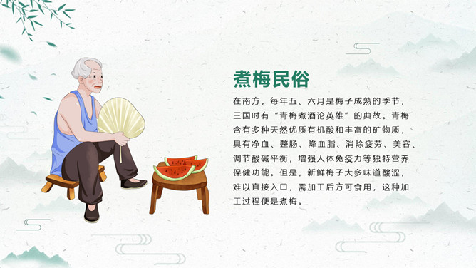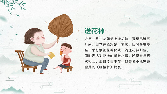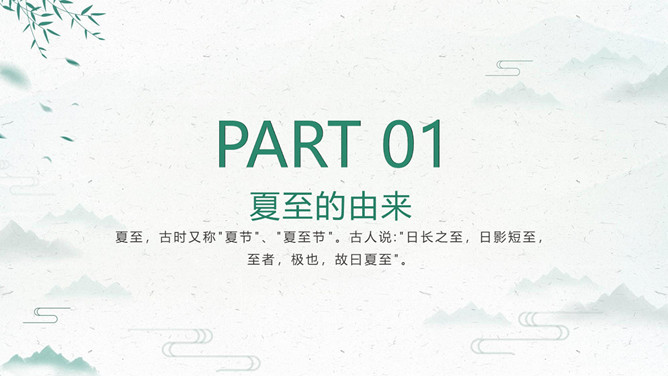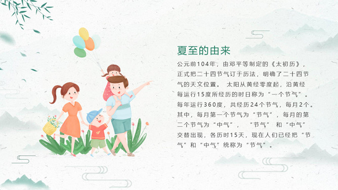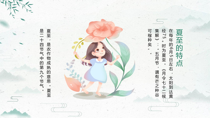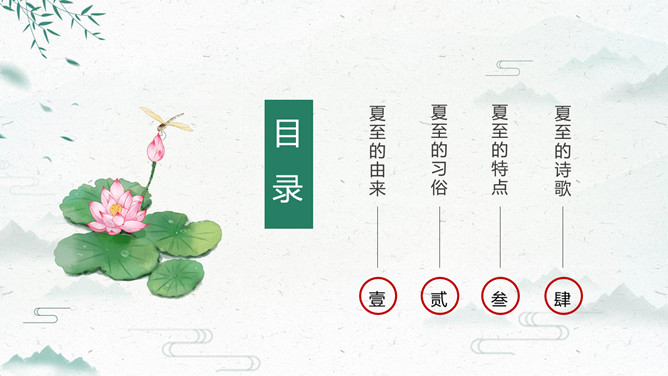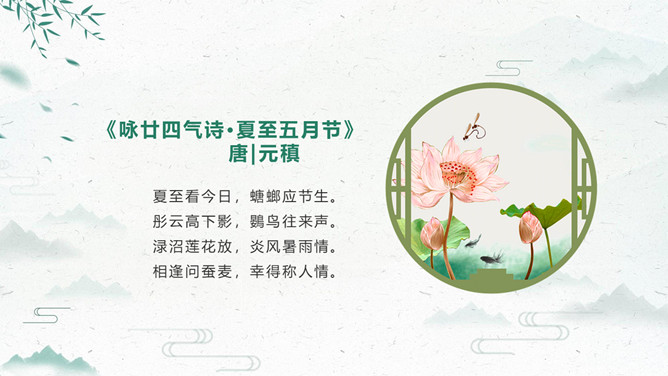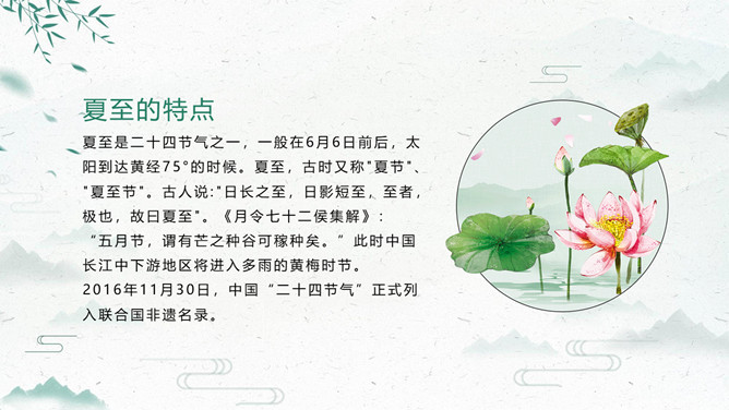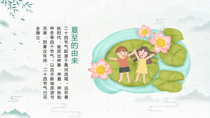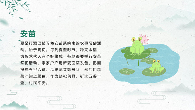 荷花夏至节气主题PPT模板。夏至打泥巴仗习俗安苗系皖南的农事习俗活动,始于明初。每到夏至时节,种完水稻,为祈求秋天有个好收成,各地都要举行安苗祭祀活动。家家户户用新麦面蒸发包,把面捏成五谷六畜、瓜果蔬菜等形状,然后用蔬菜汁染上颜色,作为祭祀供品,祈求五谷丰登、村民平安。