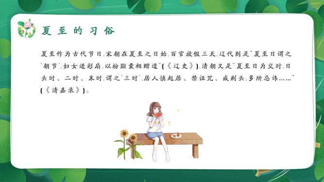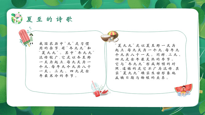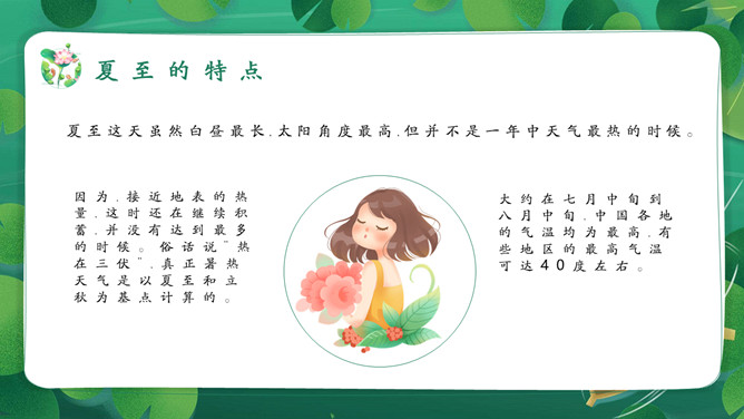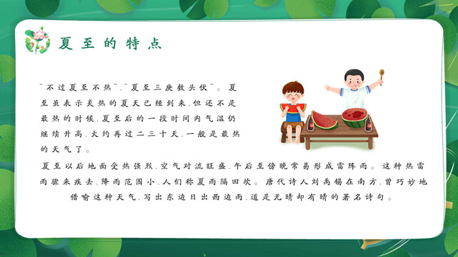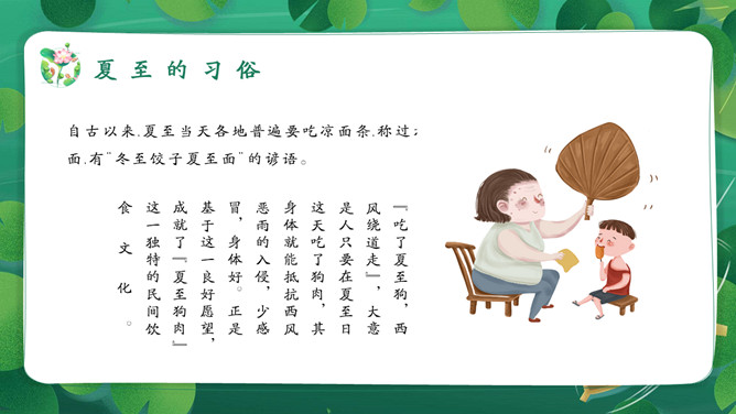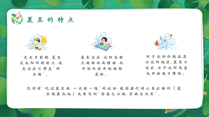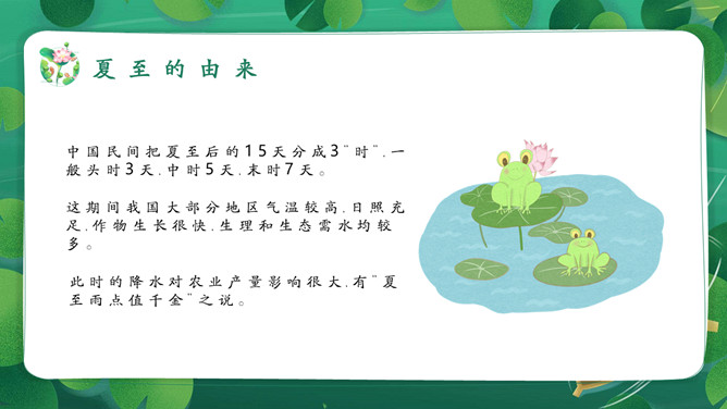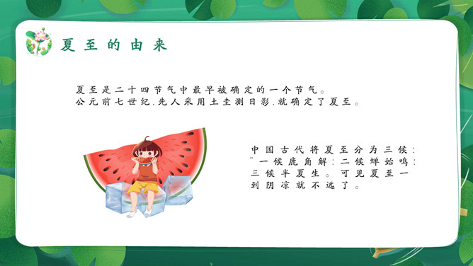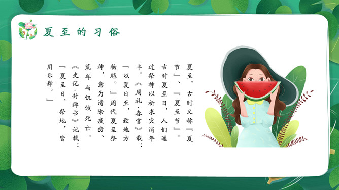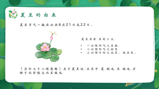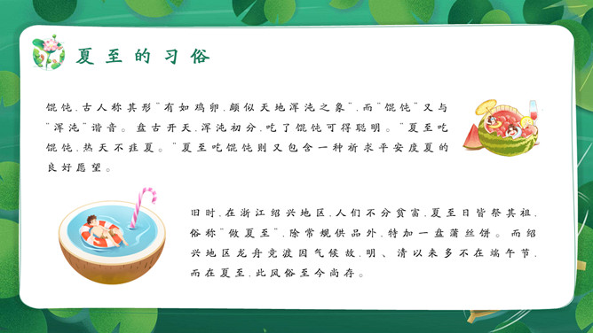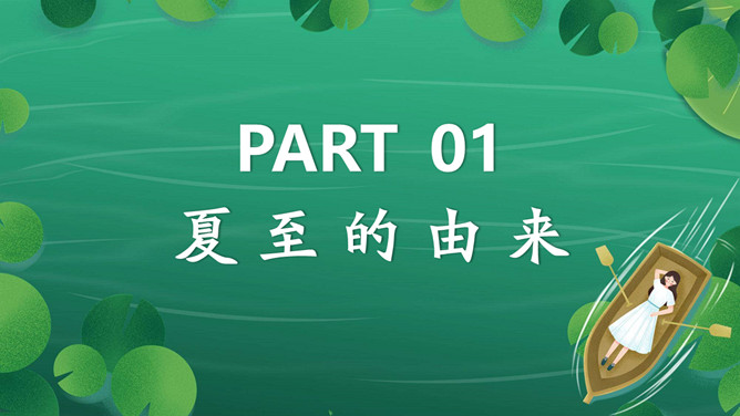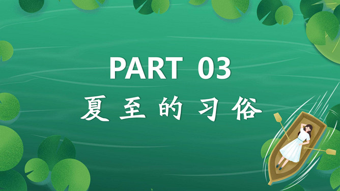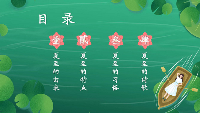 女孩荷塘小船夏至PPT模板。馄饨,古人称其形“有如鸡卵,颇似天地浑沌之象”,而“馄饨”又与“浑沌”谐音。盘古开天,浑沌初分,吃了馄饨可得聪明。“夏至吃馄饨,热天不疰夏。”夏至吃馄饨则又包含一种祈求平安度夏的良好愿望。