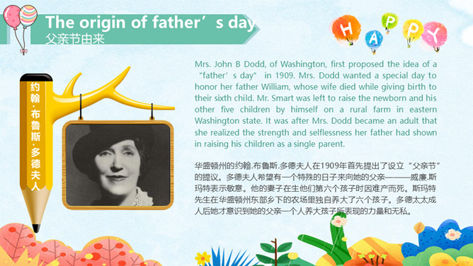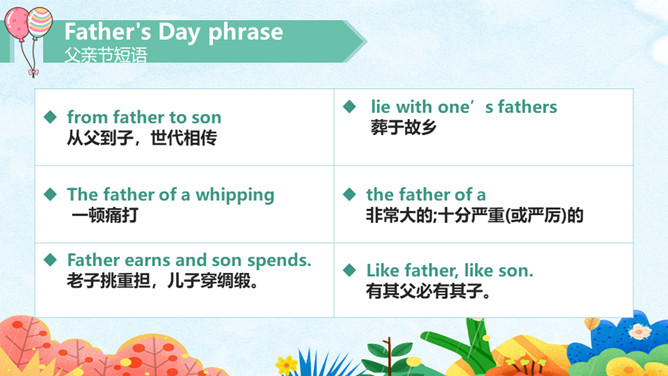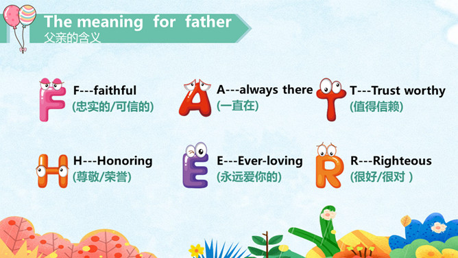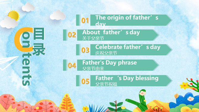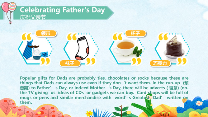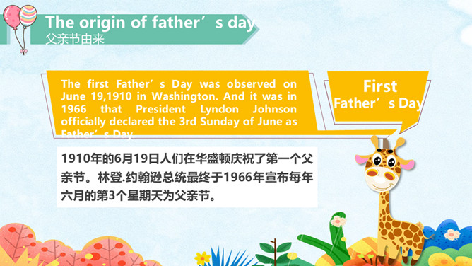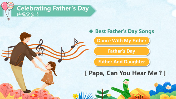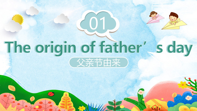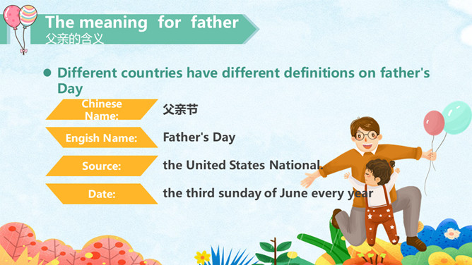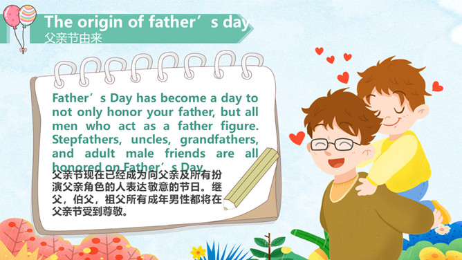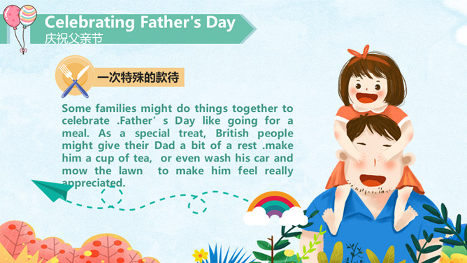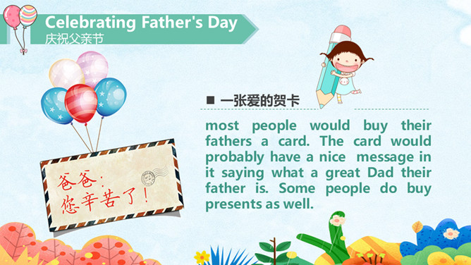 父亲节英文介绍PPT模板。谢谢您,爸爸,谢谢您倾听、操心, 谢谢您给了我许多,可又为我分担忧愁, 谢谢您是这样了不起的爸爸。愿您在生日和平日,天天都沉浸在爱和欢乐里, 因为您让身边亲人,个个生活在这样的幸福里。