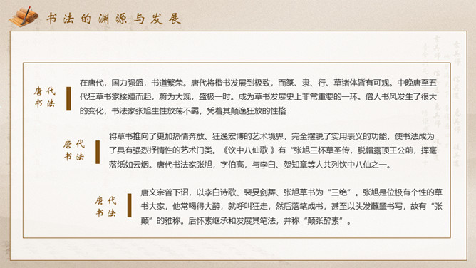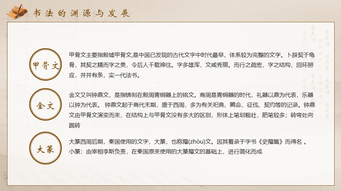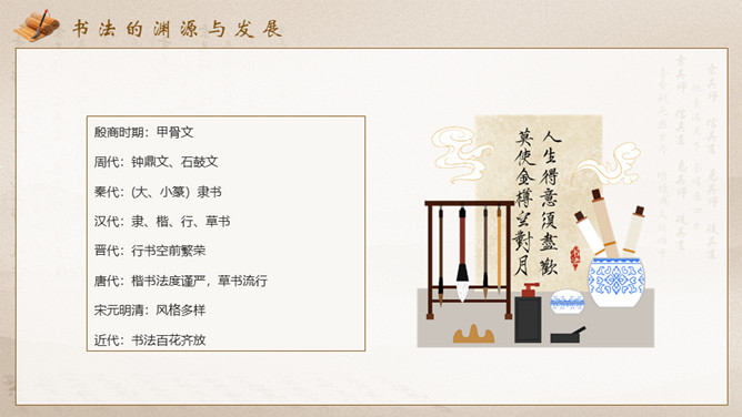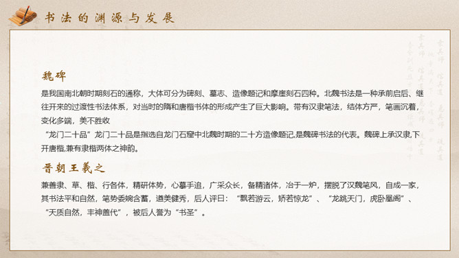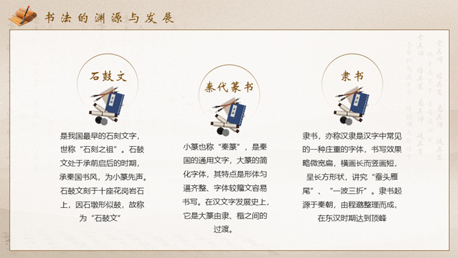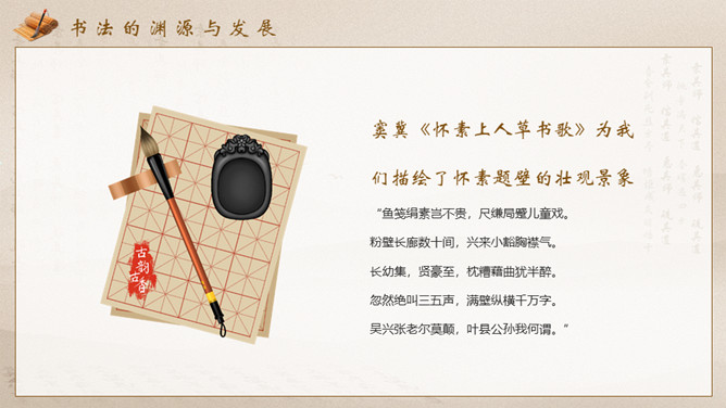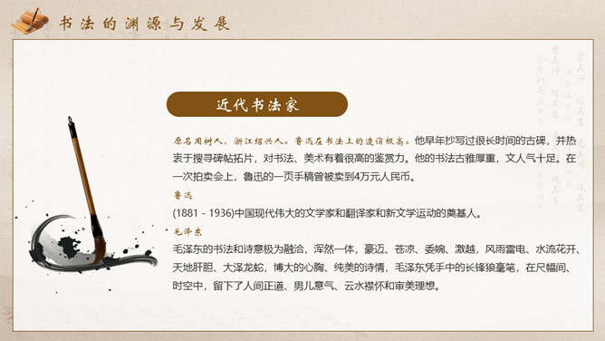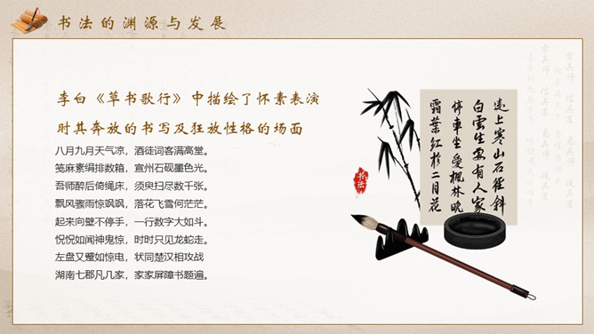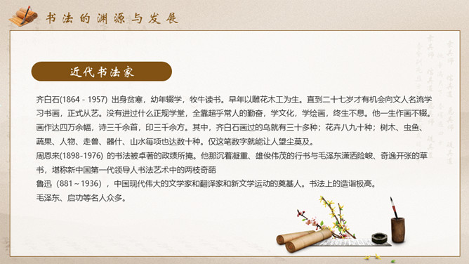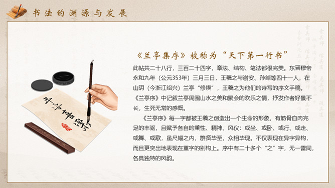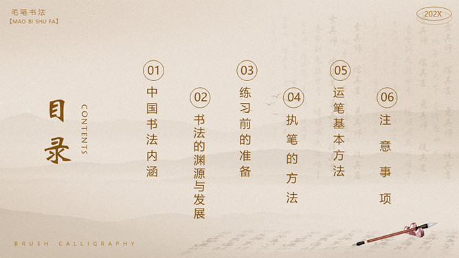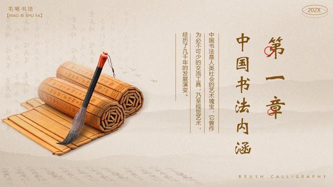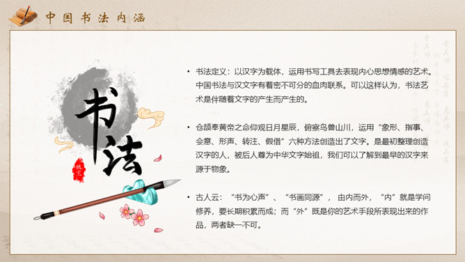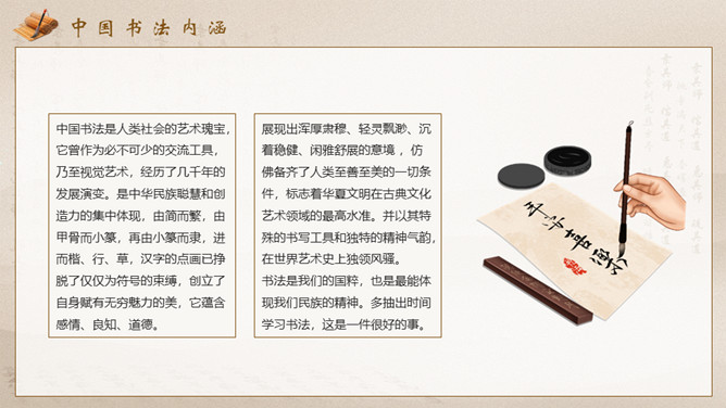 毛笔书法知识培训PPT模板。包括中国书法内涵、书法的渊源与发展、练习前的准备、执笔的方法、运笔基本方法、注意事项等内容。
