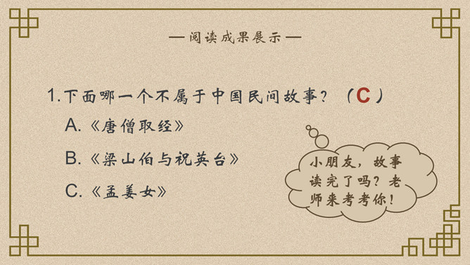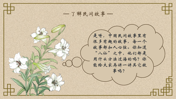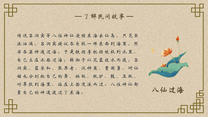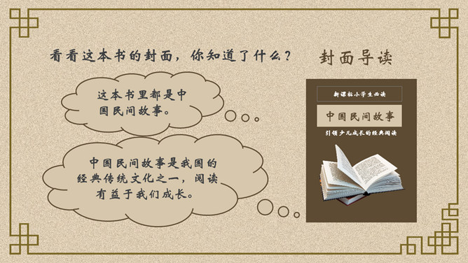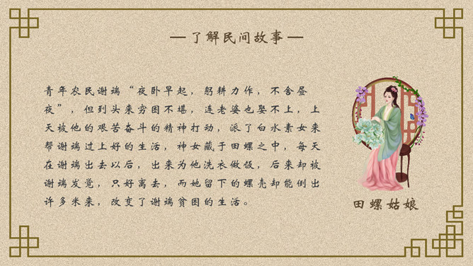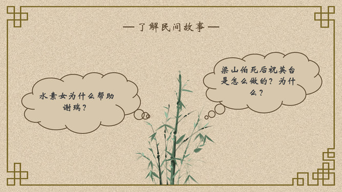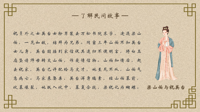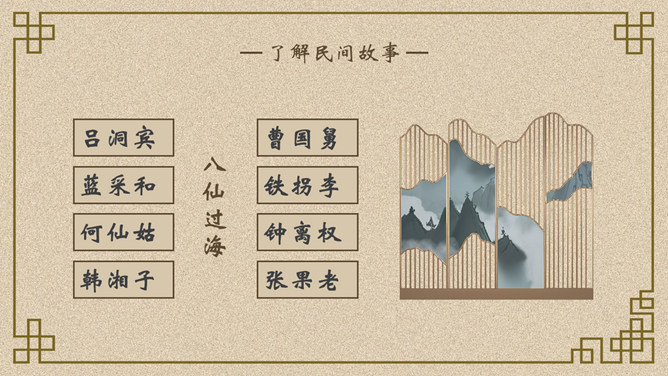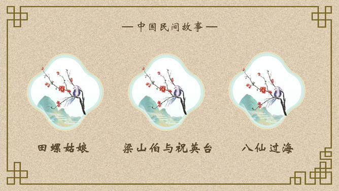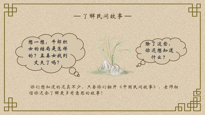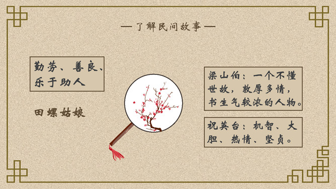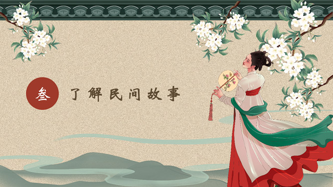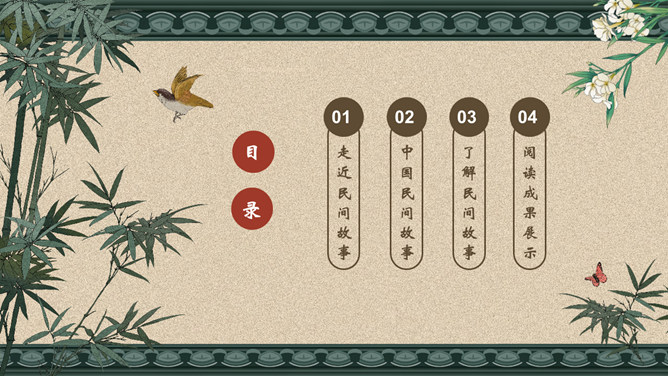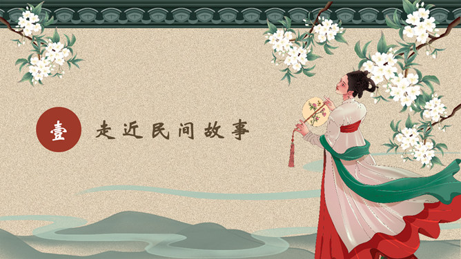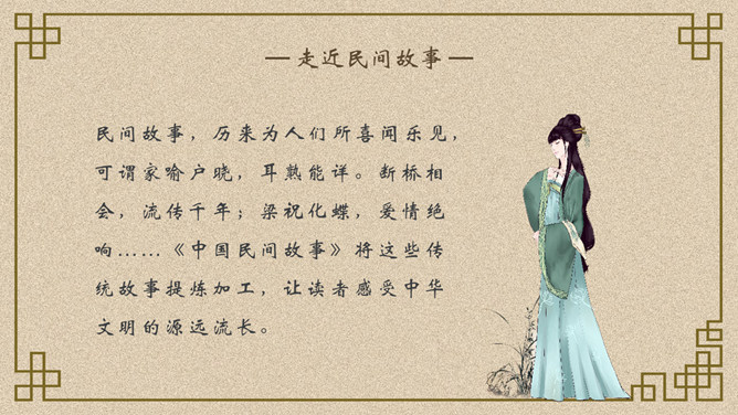 古风民间故事介绍PPT模板。内容包括走近民间故事、中国民间故事、了解民间故事、阅读成果展示等部分。