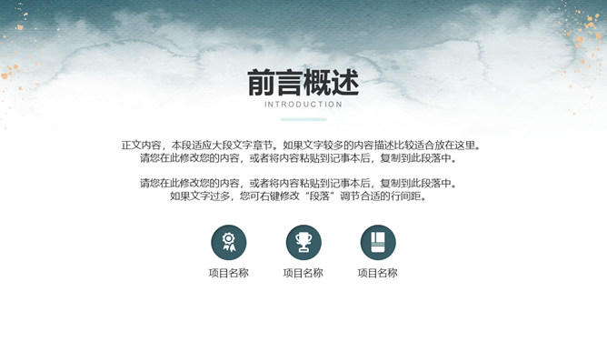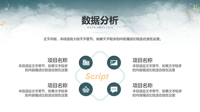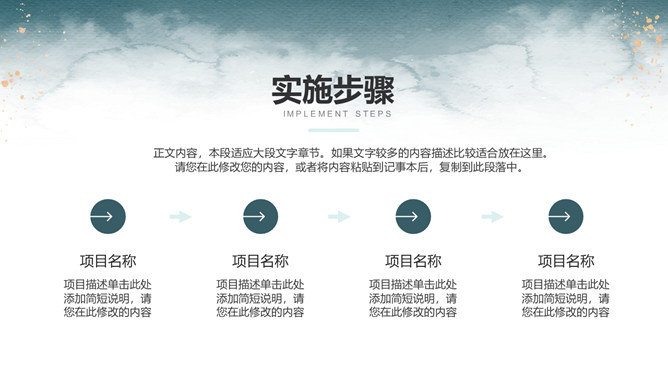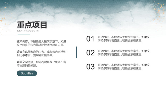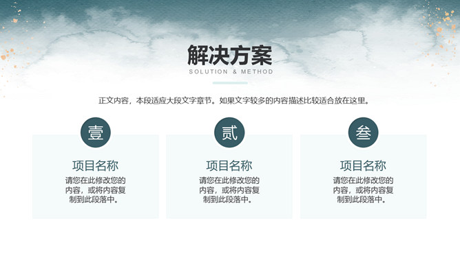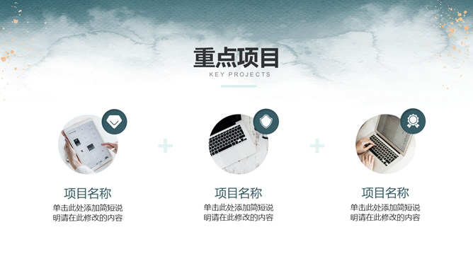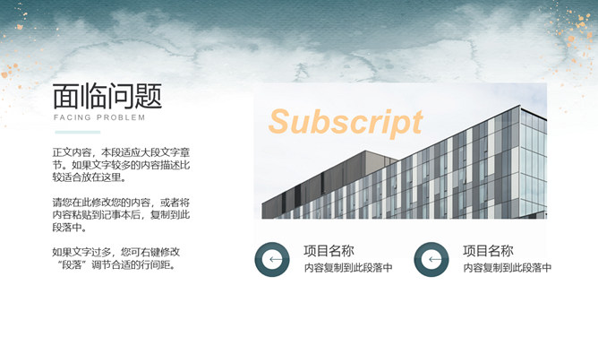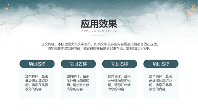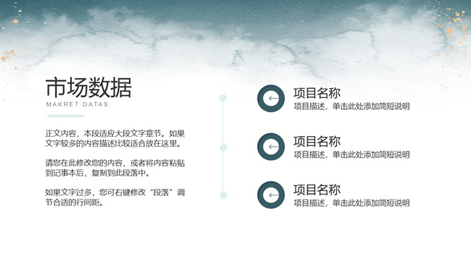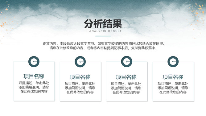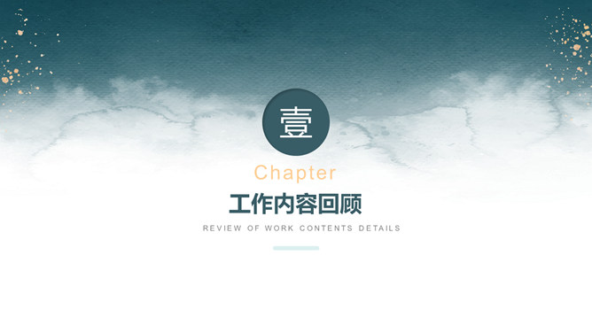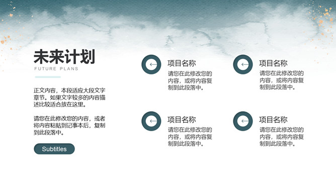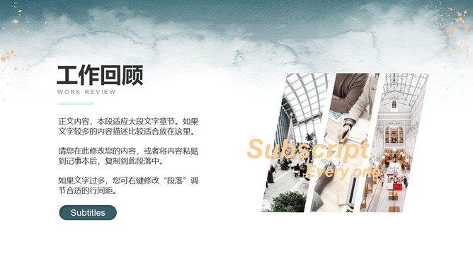 。一套商务风格工作汇报总结幻灯片模板,绿色主色调,水彩晕染效果背景装饰。