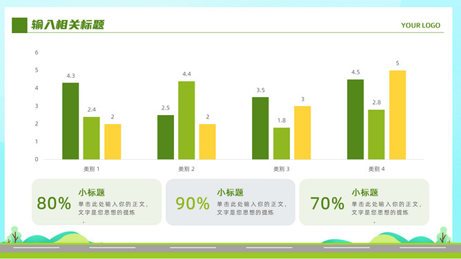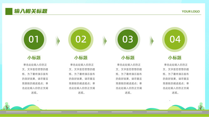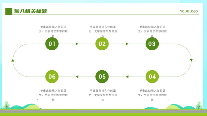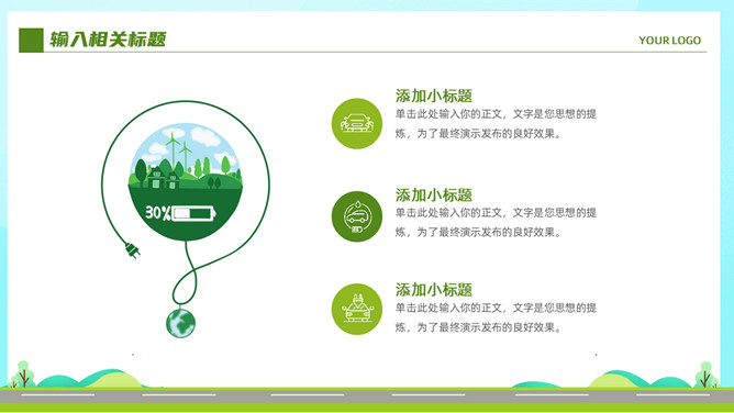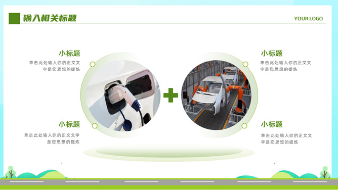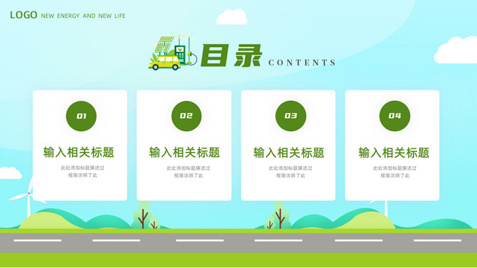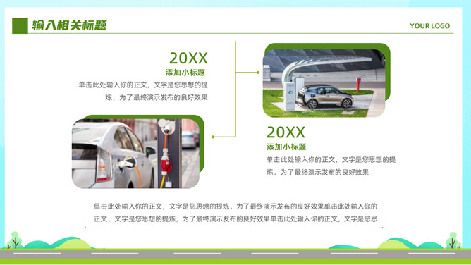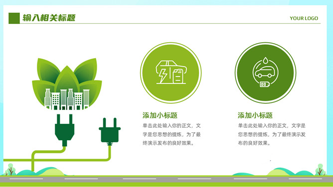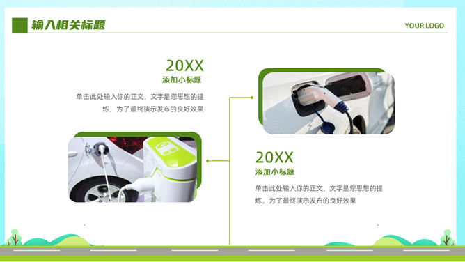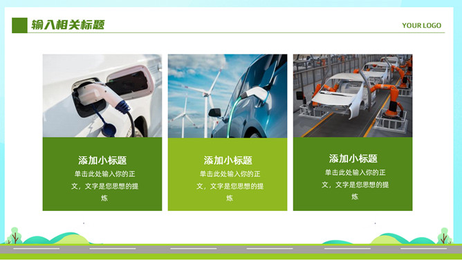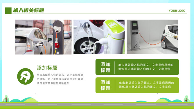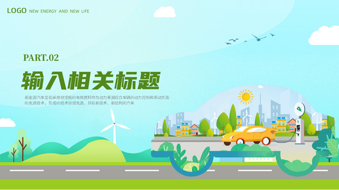 电动新能源汽车PPT模板。一套新能源汽车行业幻灯片模板,清新绿色主色调,页面类型丰富实用。
