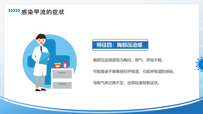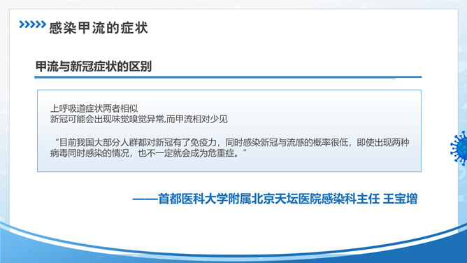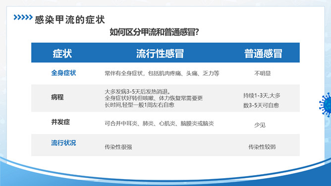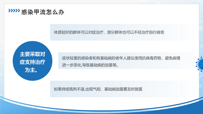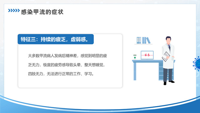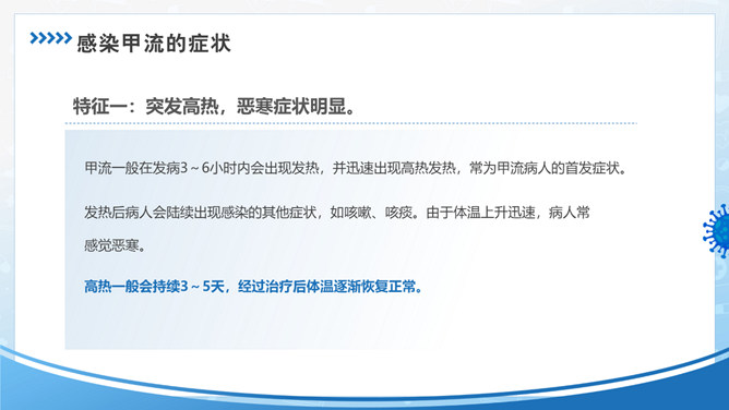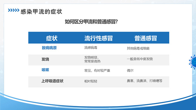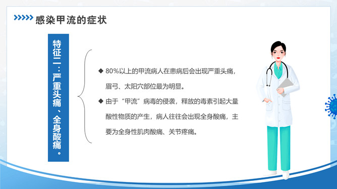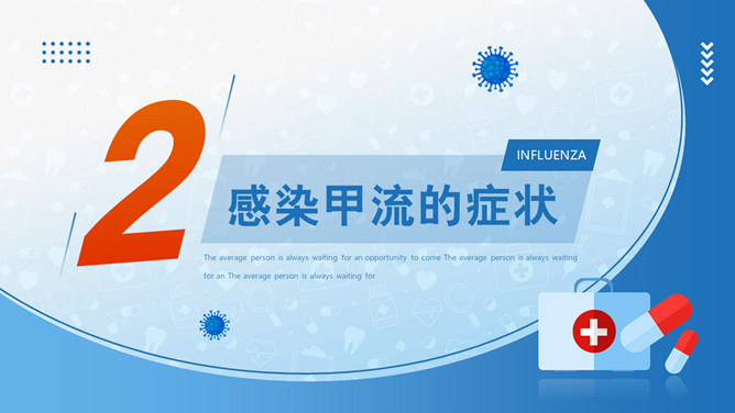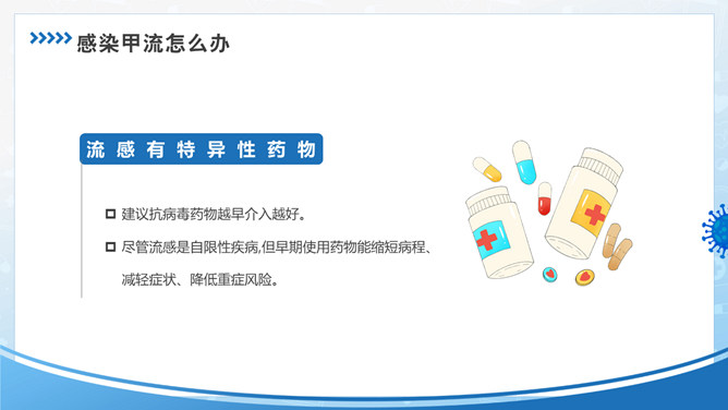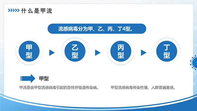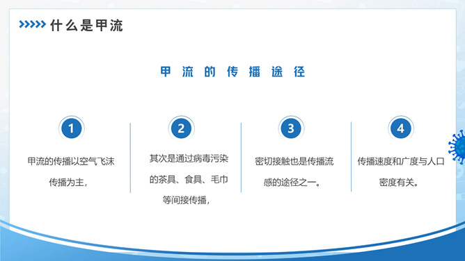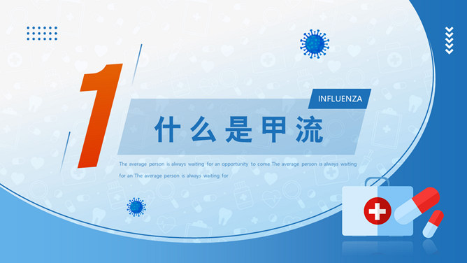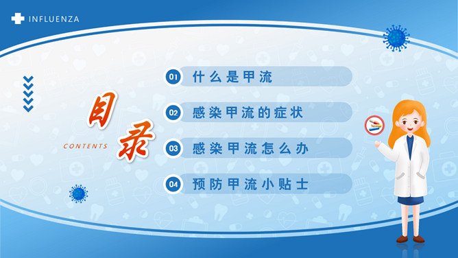 预防甲型流感病毒科普PPT模板。内容包括什么是甲流、感染甲流的症状、感染甲流怎么办、预防甲流小贴士。