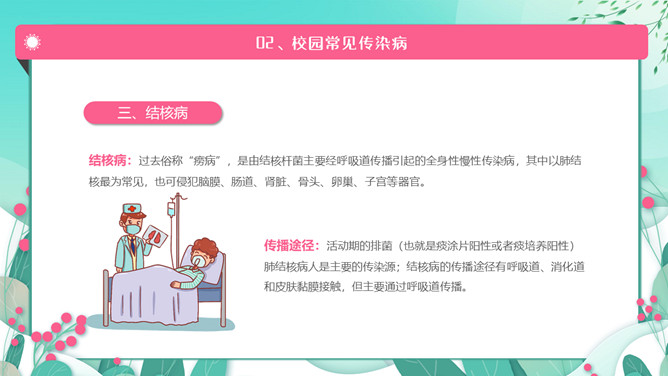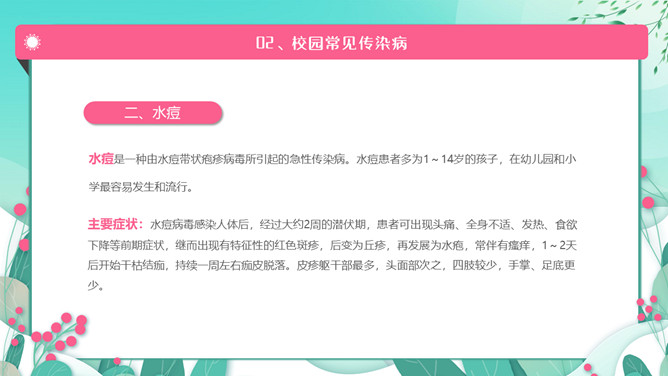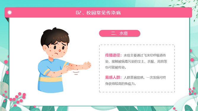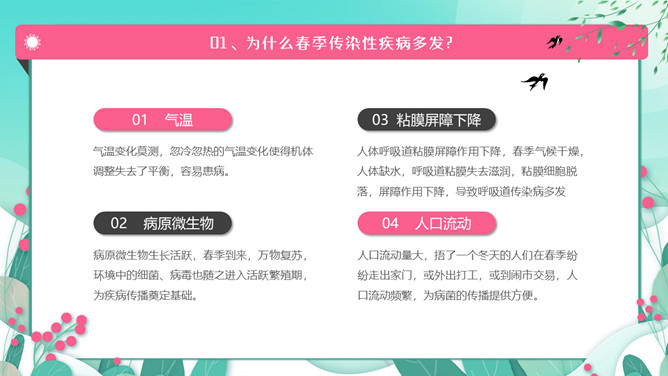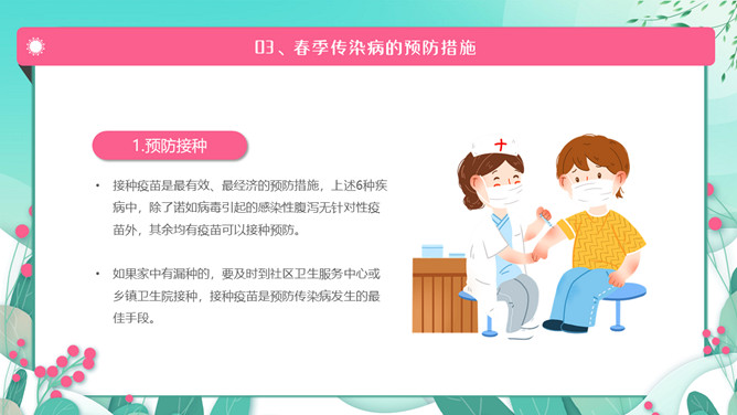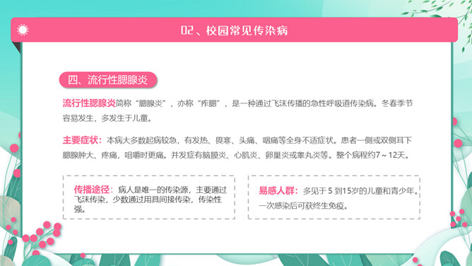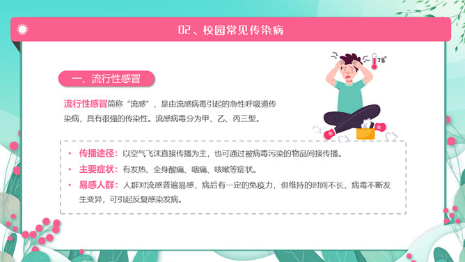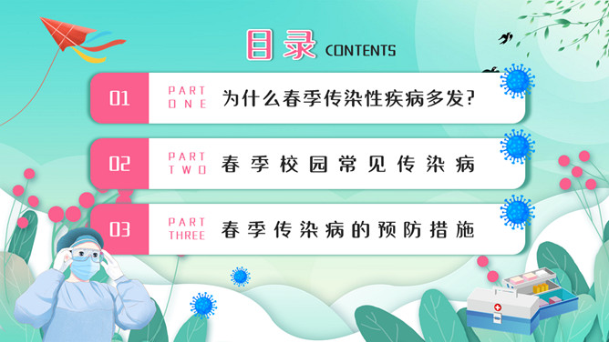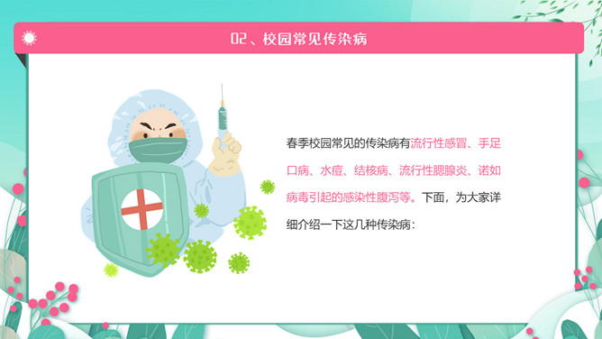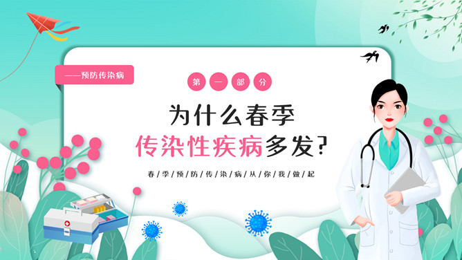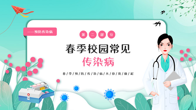校园传染病预防PPT模板。内容包括为什么春季传染性疾病多发、春季校园常见传染病、春季传染病的预防措施。