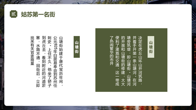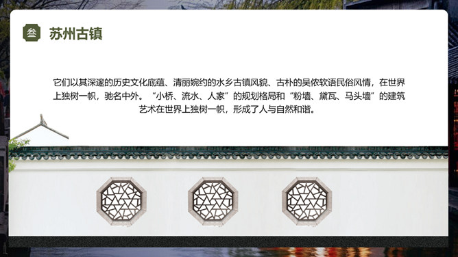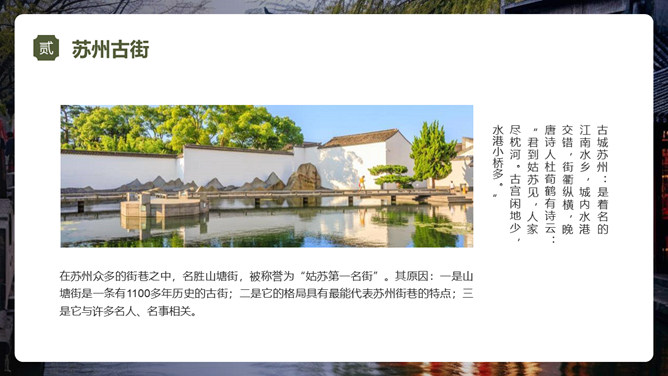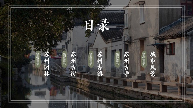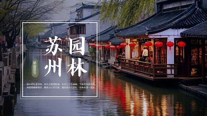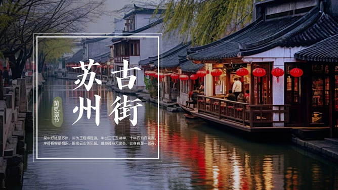苏州旅游景点介绍PPT模板。内容包括苏州园林、苏州古街、苏州古镇、苏州古寺、城市风景。