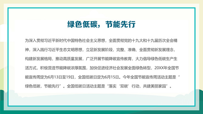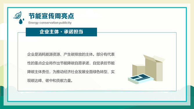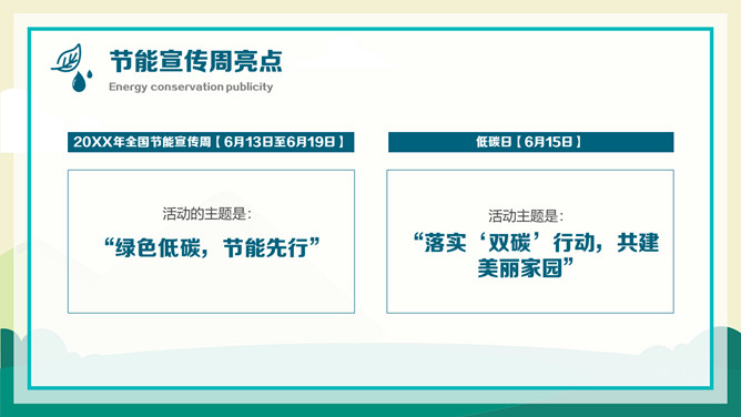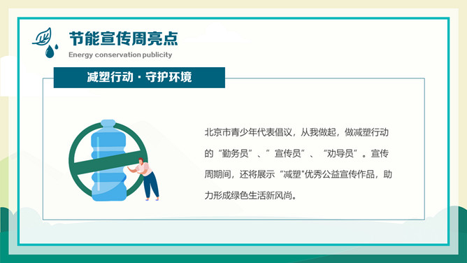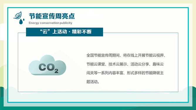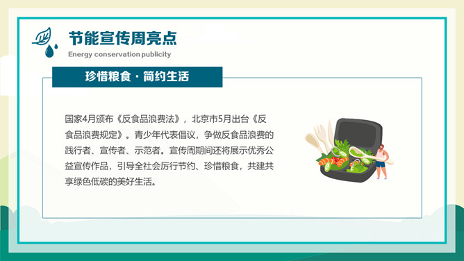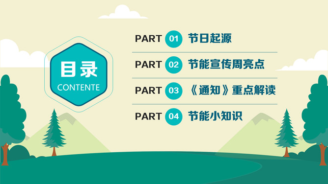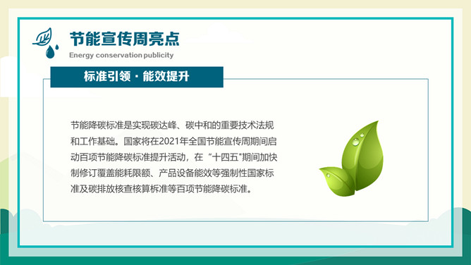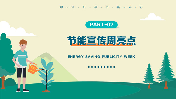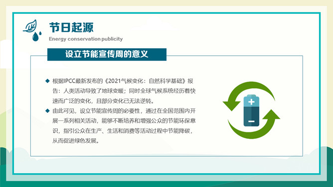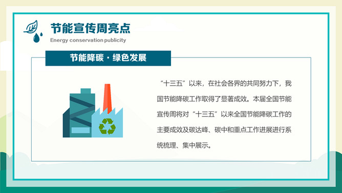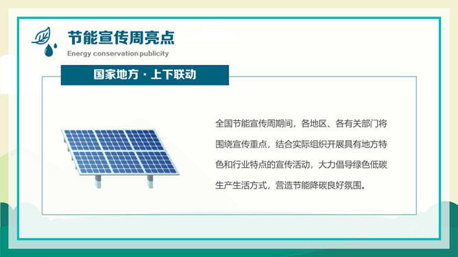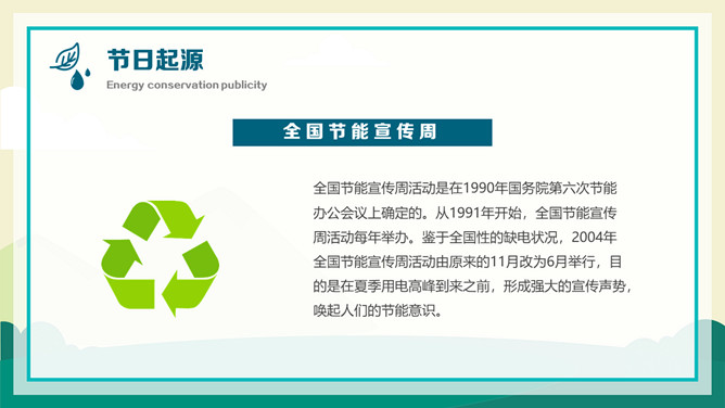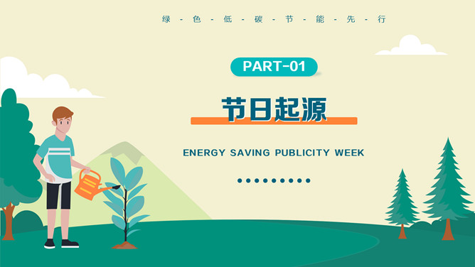 节能减排节能宣传周PPT模板。内容包括节日起源、节能宣传周亮点、《通知》重点解读、节能小知识。