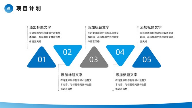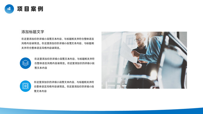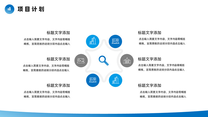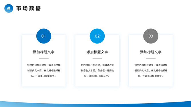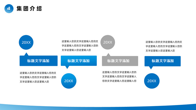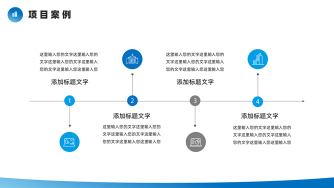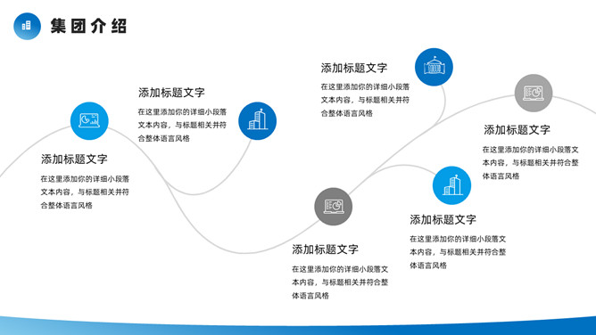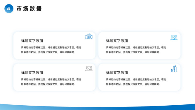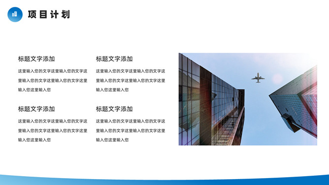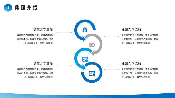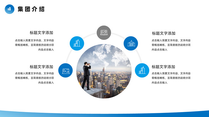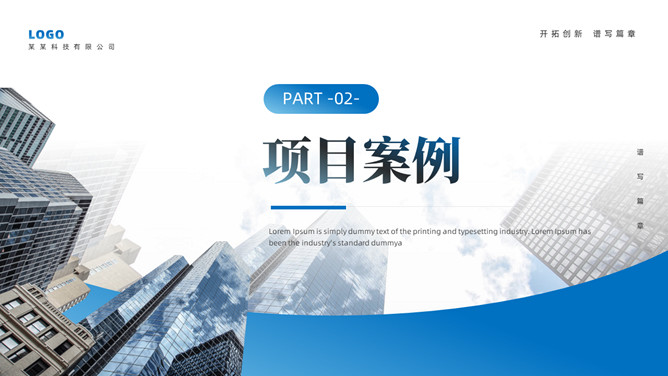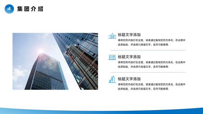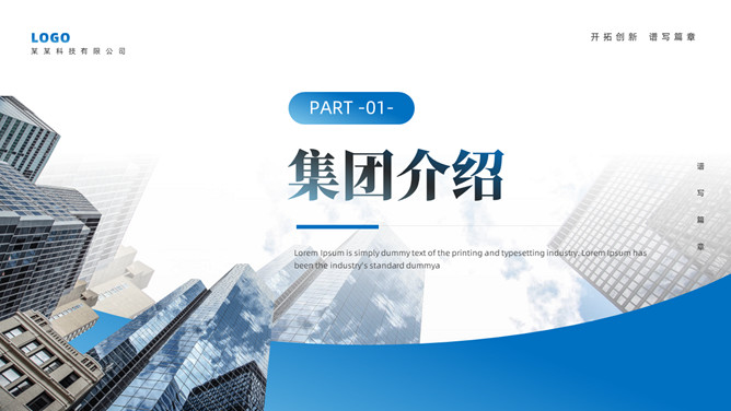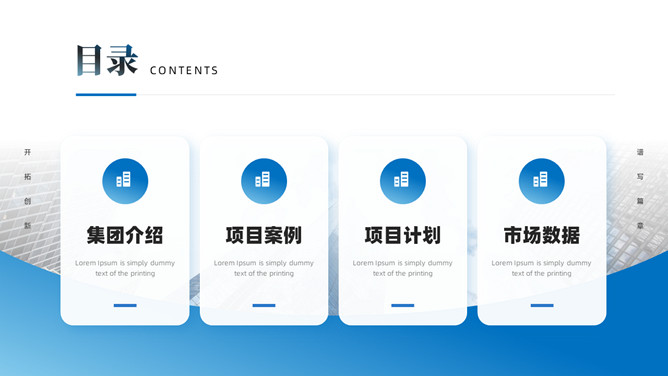 房地产楼盘开盘营销PPT模板。大气楼宇背景,清爽蓝色色调,包括集团介绍、项目案例、项目计划、市场数据等部分。
