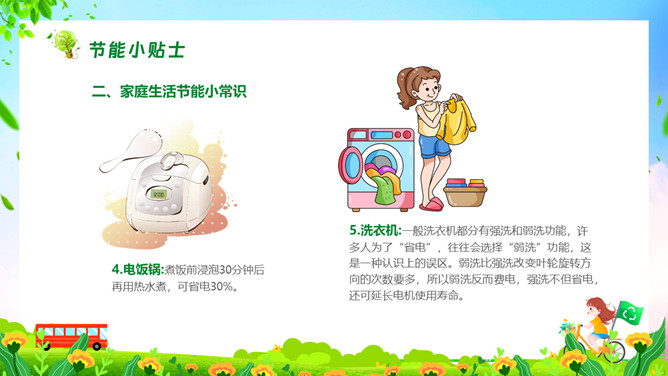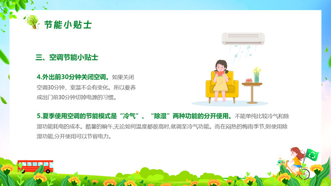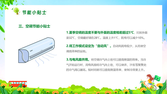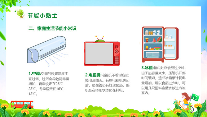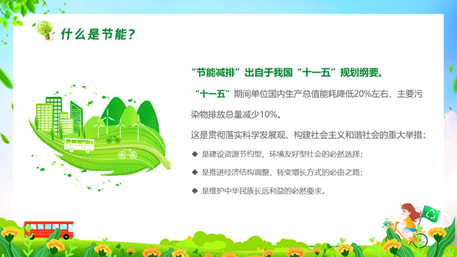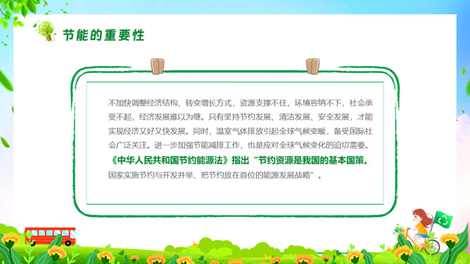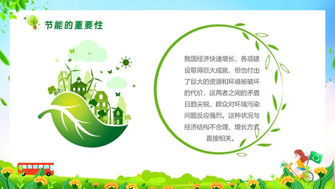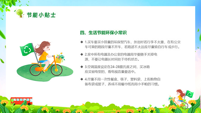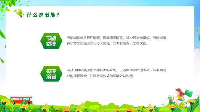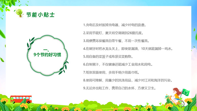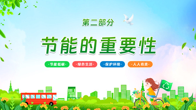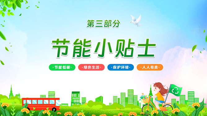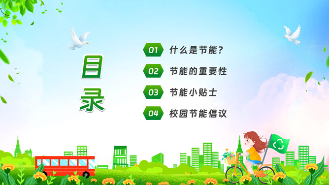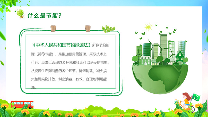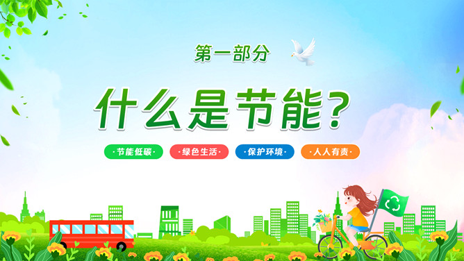 校园绿色低碳环保宣传PPT模板。内容包括什么是节能、节能的重要性、节能小贴士、校园节能倡议。