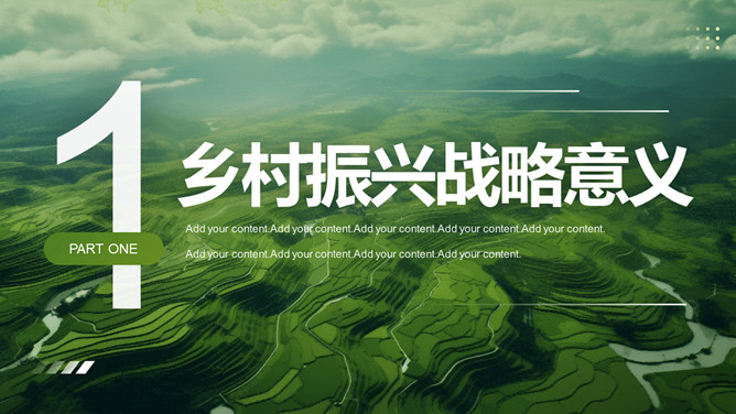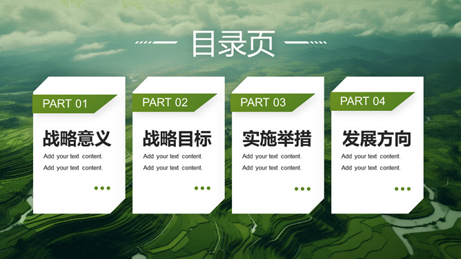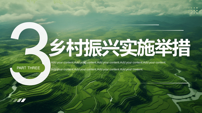助力农业乡村振兴PPT模板。绿色农田梯田背景,包括战略意义、战略目标、实施举措、发展方向等部分。