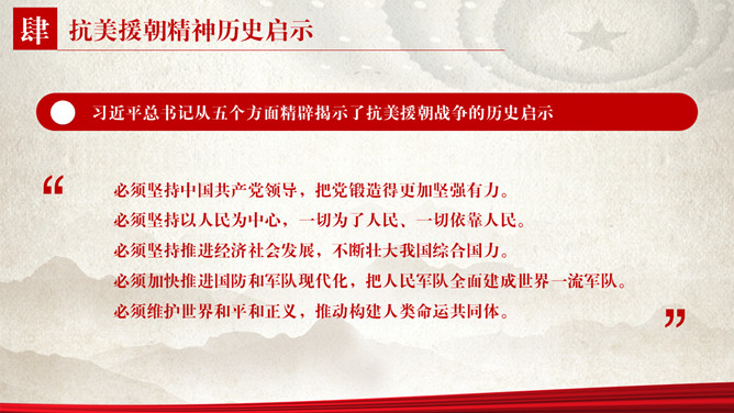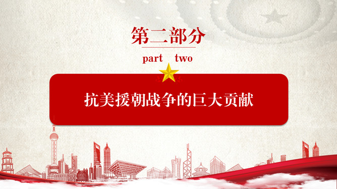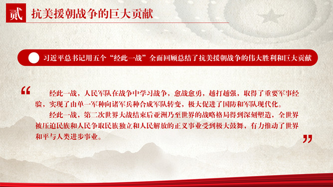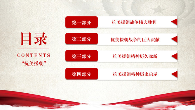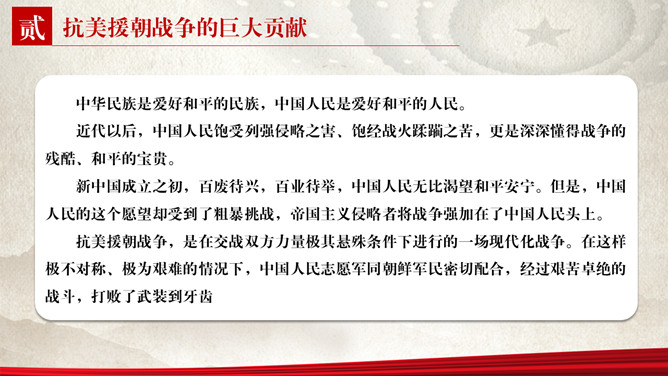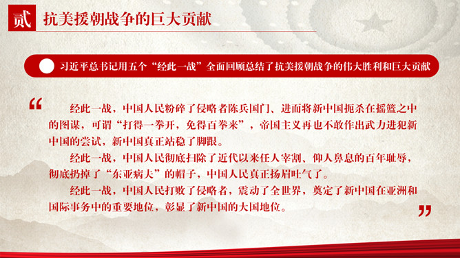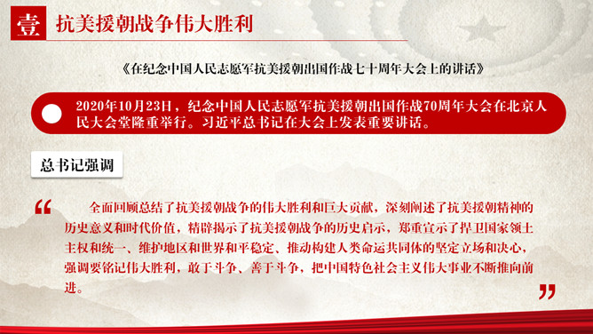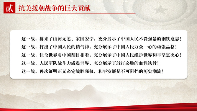 纪念抗美援朝胜利PPT模板。包括抗美援朝战争伟大胜利、巨大贡献、历史启示等内容。