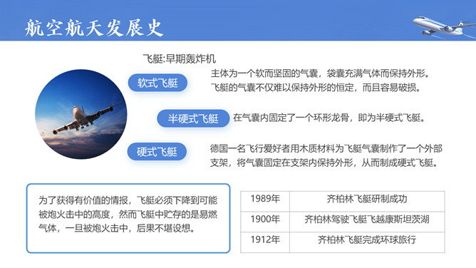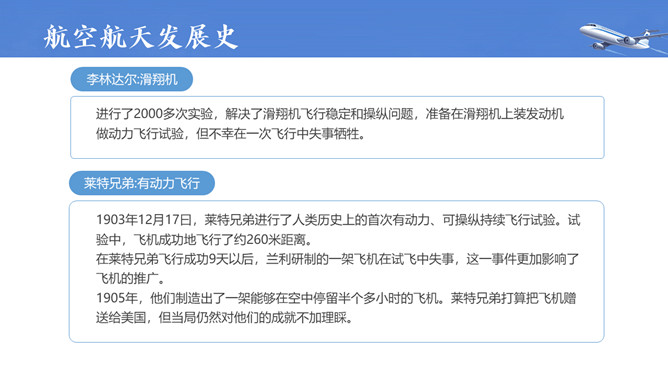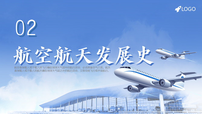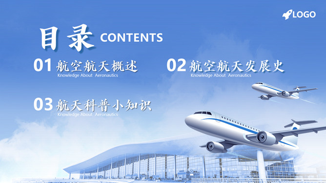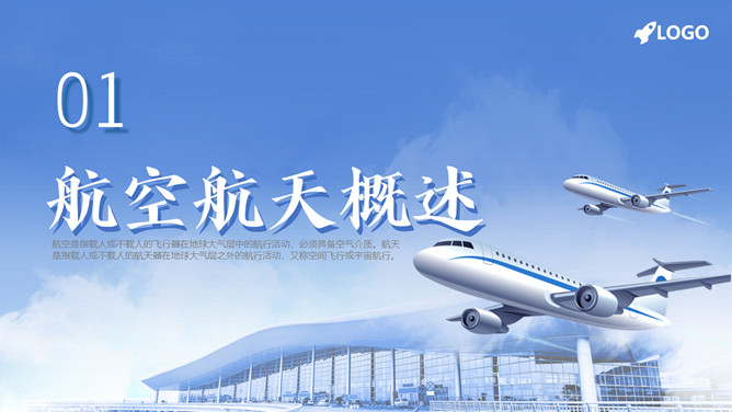 飞机航空航天知识培训PPT模板。内容包括航空航天概述、航空航天发展史、航天科普小知识。