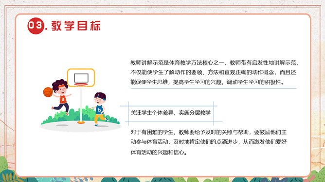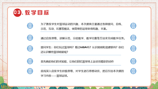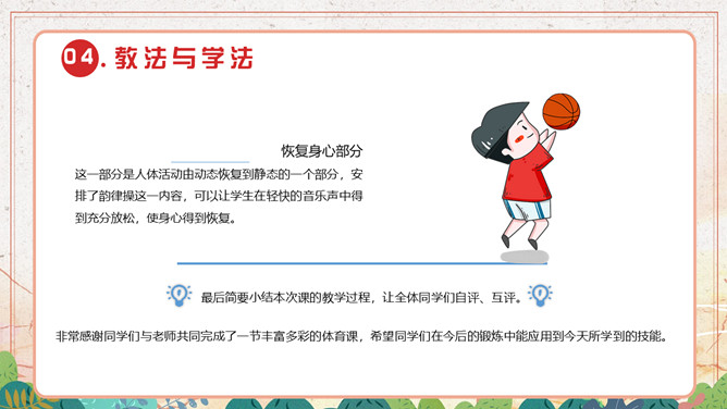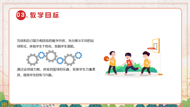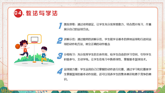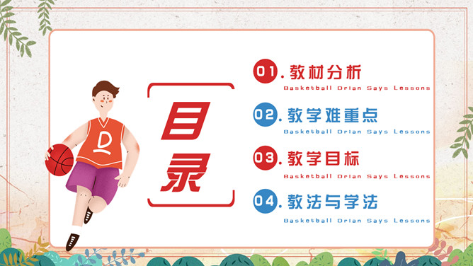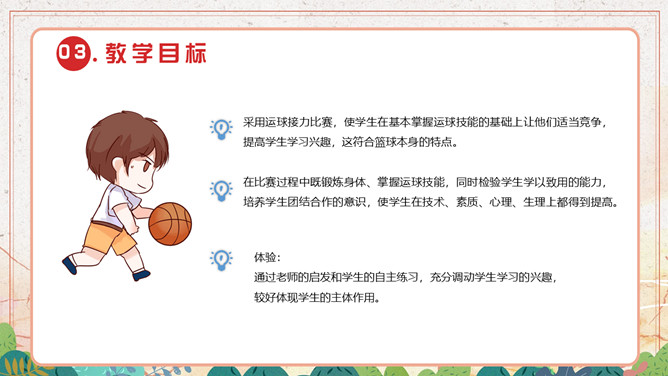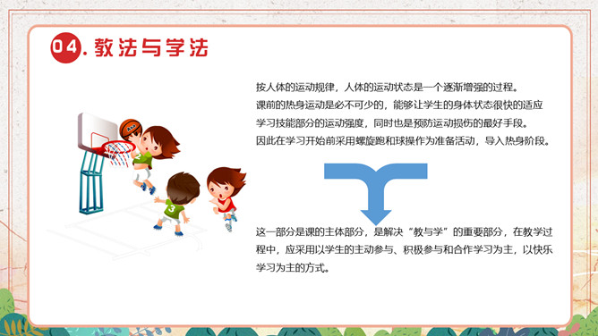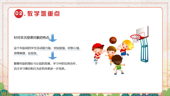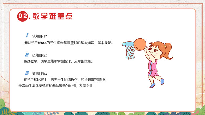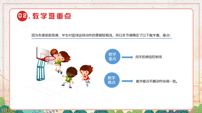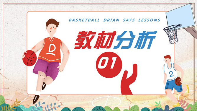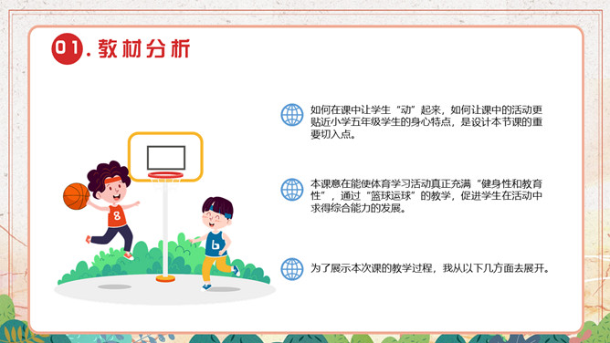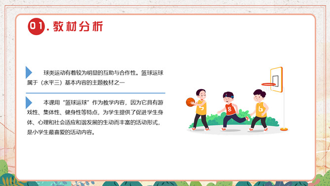 篮球体育说课课件PPT模板。本课用“篮球运球”作为教学内容,因为它具有游戏性、集体性、健身性等特点,为学生提供了促进学生身体、心理和社会适应和谐发展的生动而丰富的活动形式,是小学生最喜爱的活动内容。