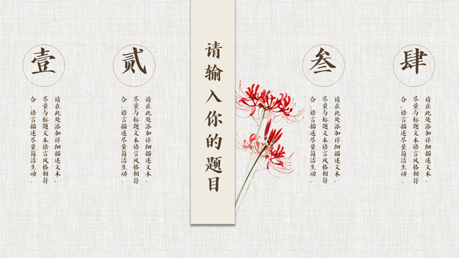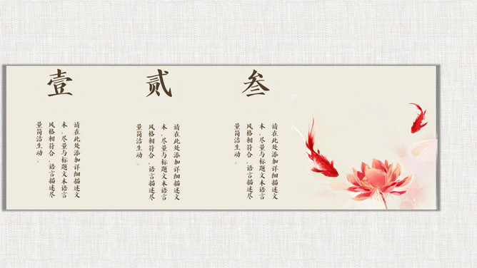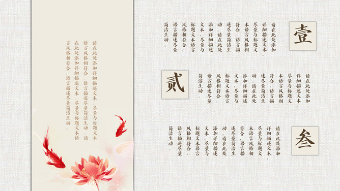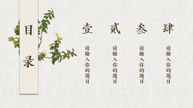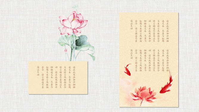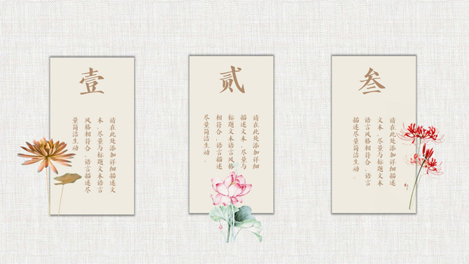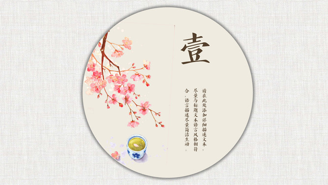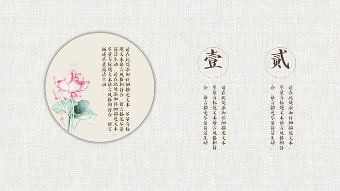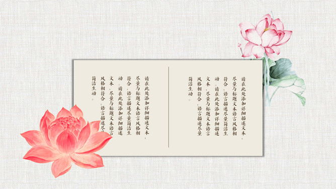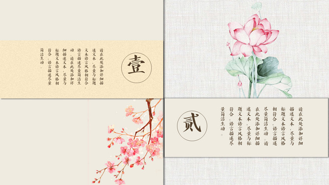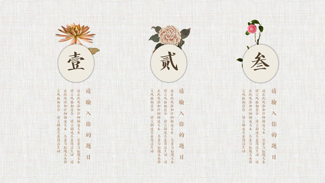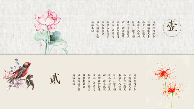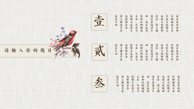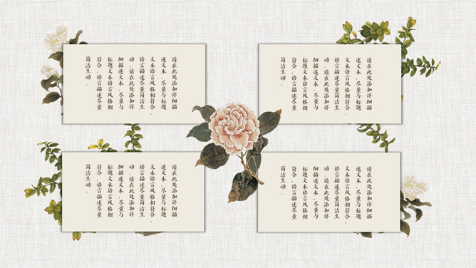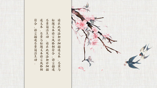 布纹唯美花鸟中国风PPT模板。一套唯美中国幻灯片模板,质感布纹纹理背景,唯美花鸟元素装饰。
